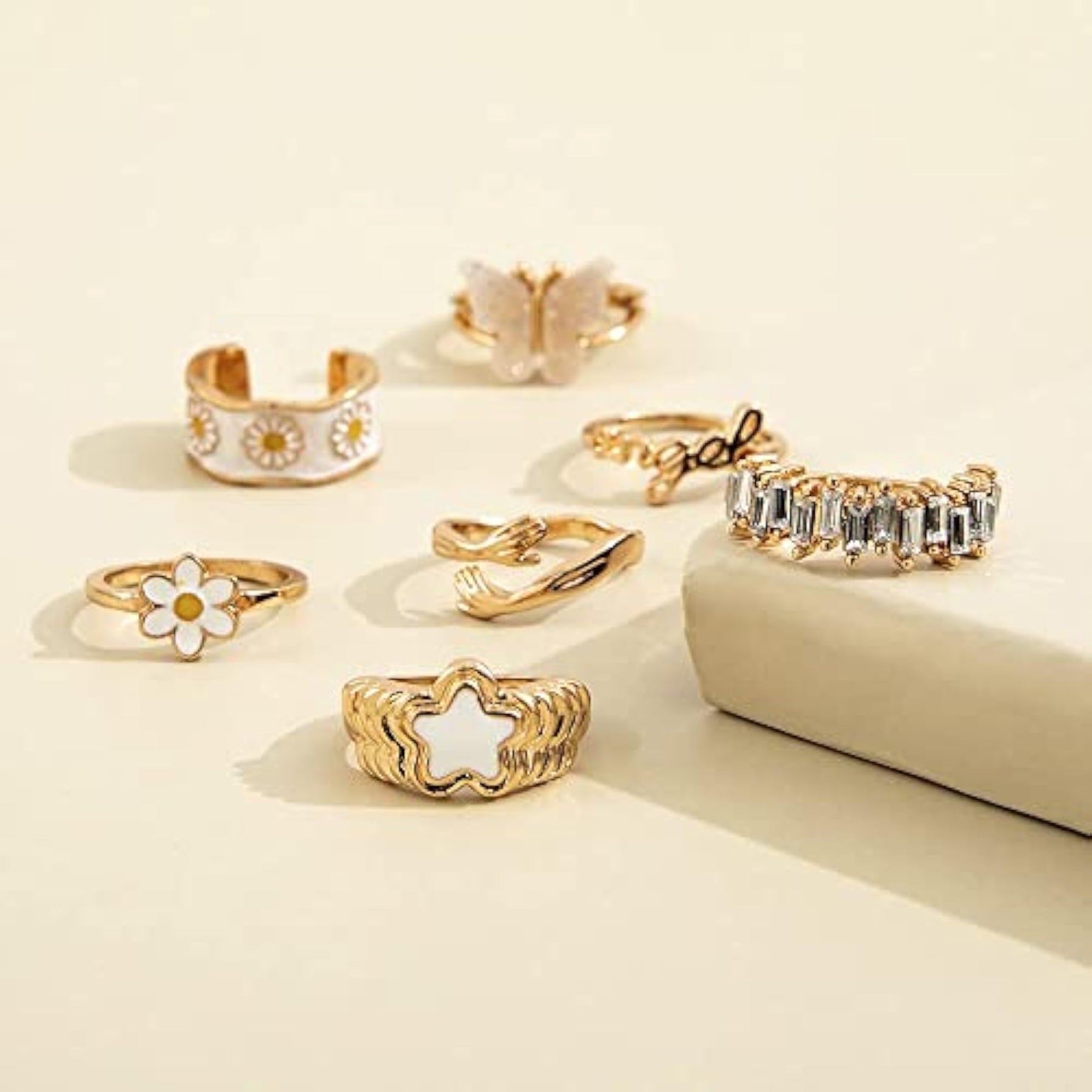 Elevate your style with this set of 7 chunky finger rings, perfect for adding a touch of glamour to your outfit.