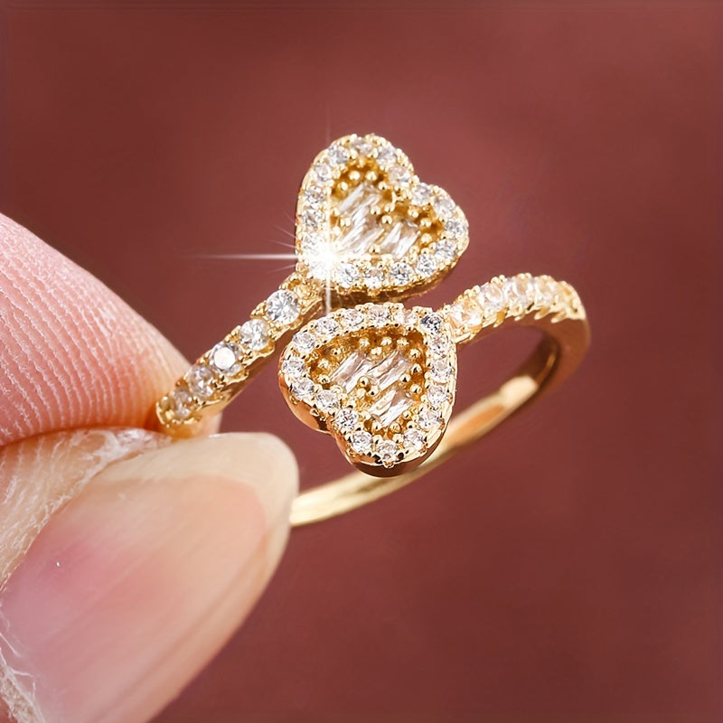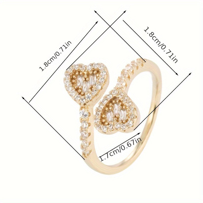 This adjustable ring features a symmetrical heart design with synthetic zirconia inlays, crafted from high-quality copper material.