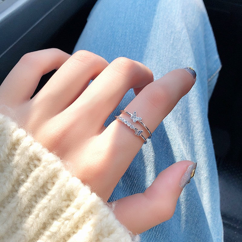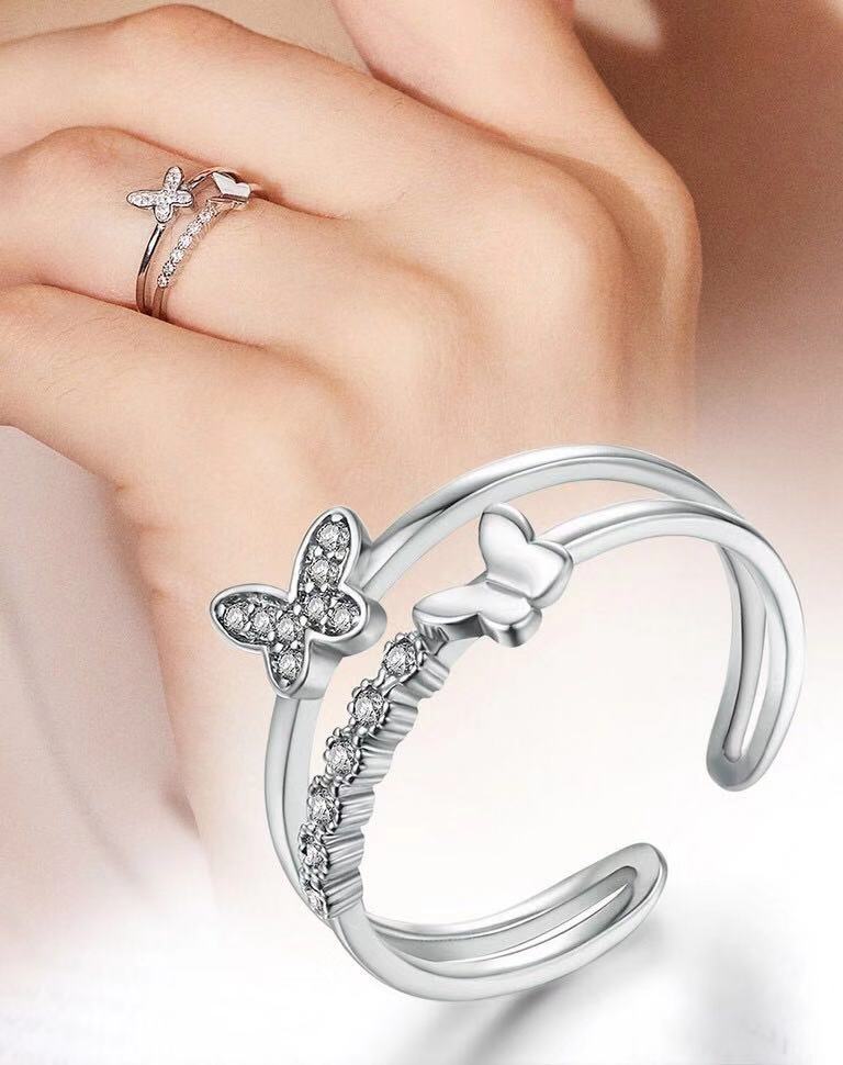 Versilberter, verstellbarer Schmetterlingsring mit zwei Lagen und Zirkonia für Damen