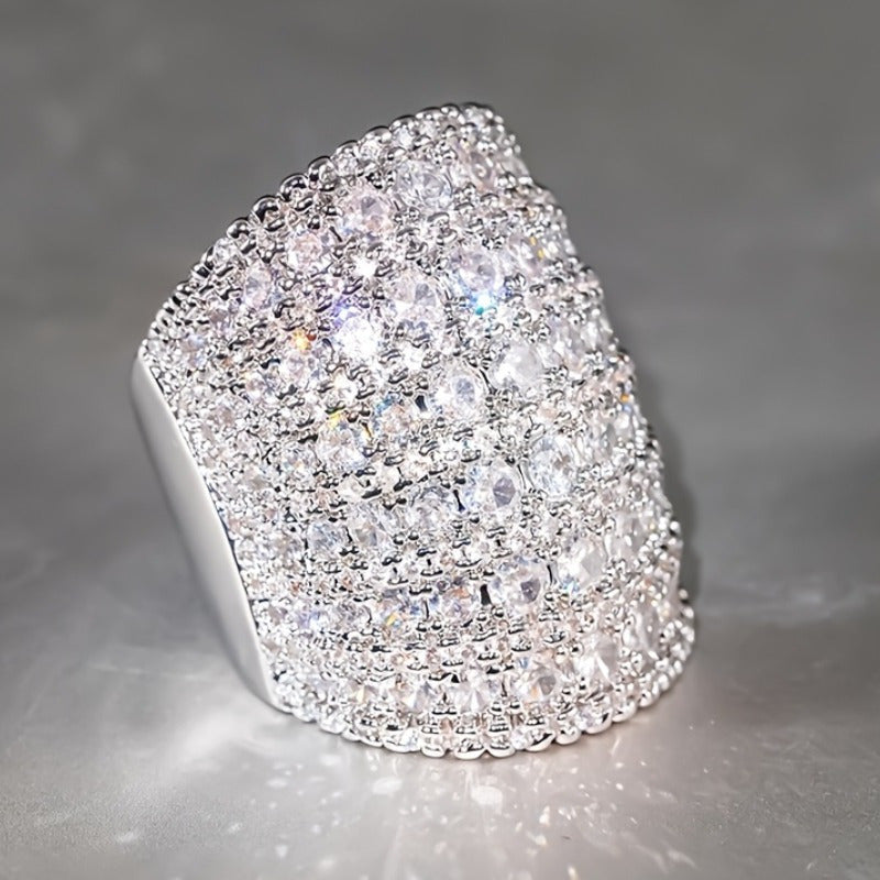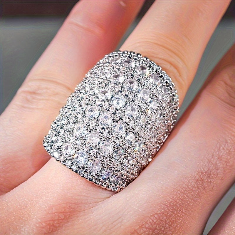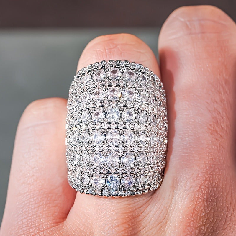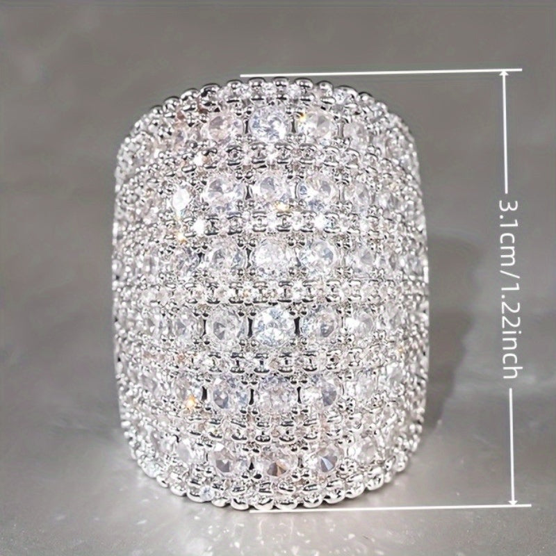Add a touch of sparkle to your look with this wide band statement ring featuring synthetic zirconia stones. Perfect for music festivals and everyday wear.