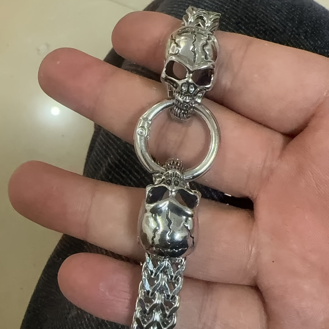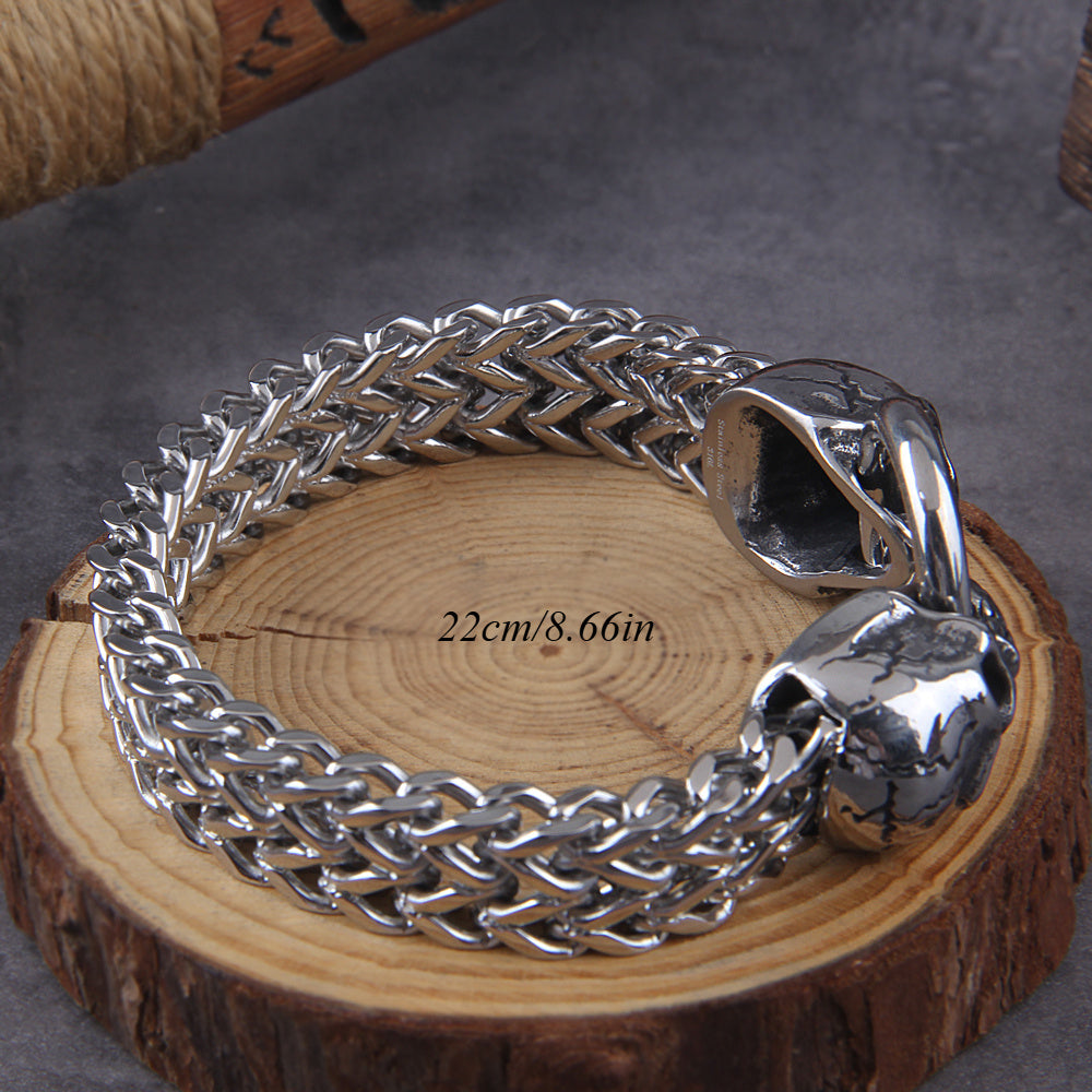 Stainless steel bracelet featuring two wolf heads with a mesh chain design. Perfect for those who love hip hop and rock jewelry styles.