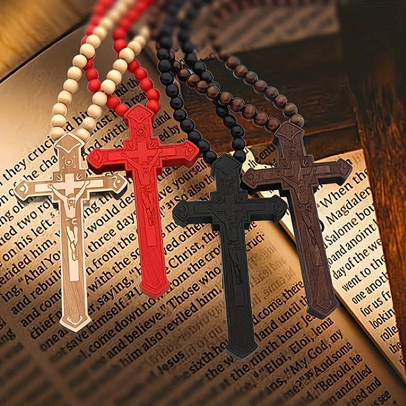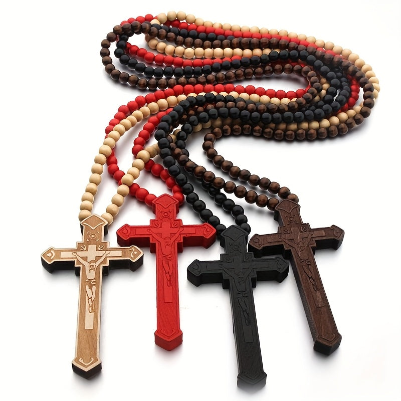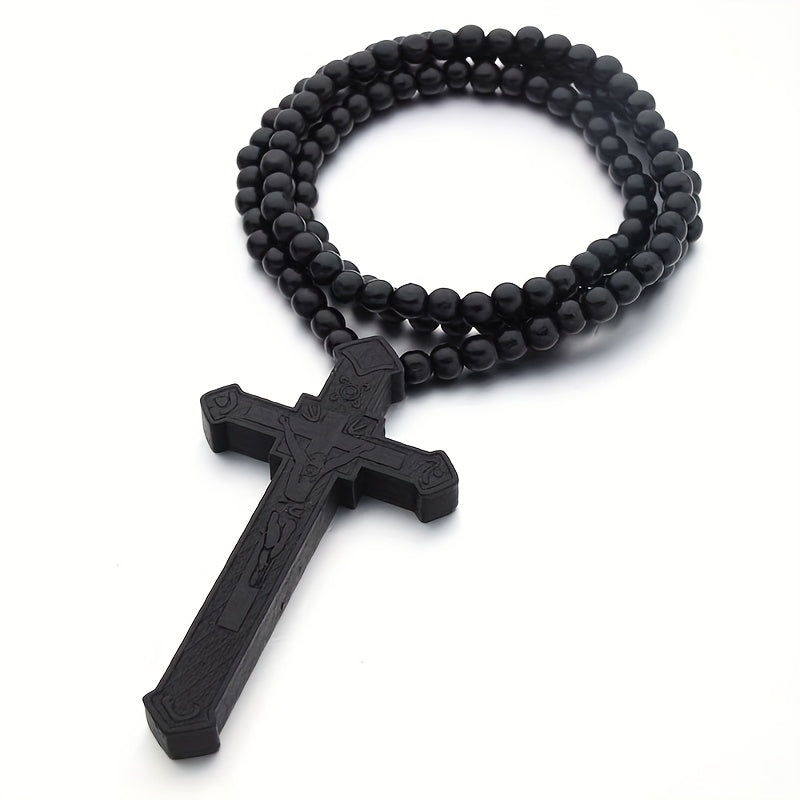 Wooden Jesus Cross Pendant Necklace with Beads Unisex Religious Symbol