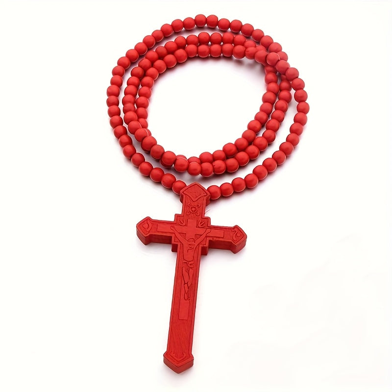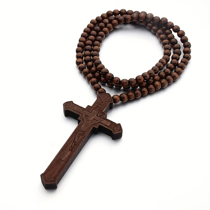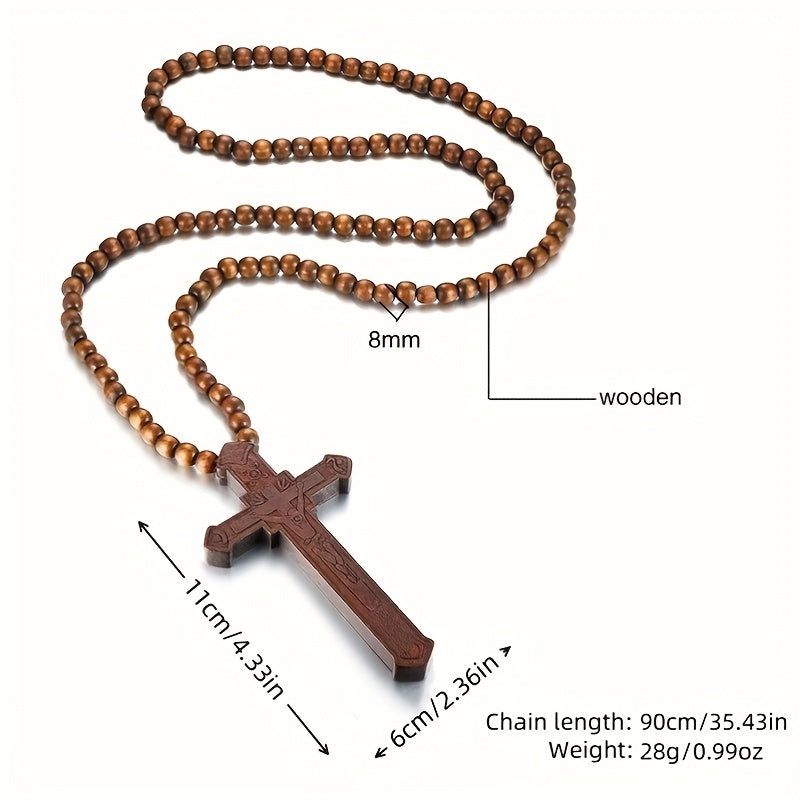This wooden cross pendant necklace features 8mm beads and is a unisex religious symbol. It is a beautiful and meaningful piece of jewelry that can be worn by anyone.
