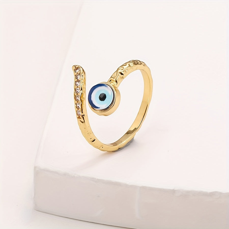 This adjustable ring features a copper material with a synthetic zirconia mosaic eye decoration, perfect for parties, music events, and Halloween.