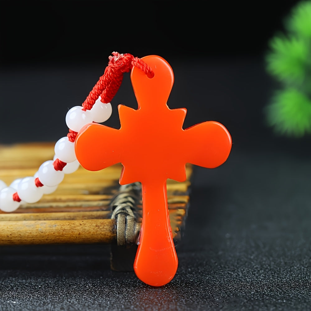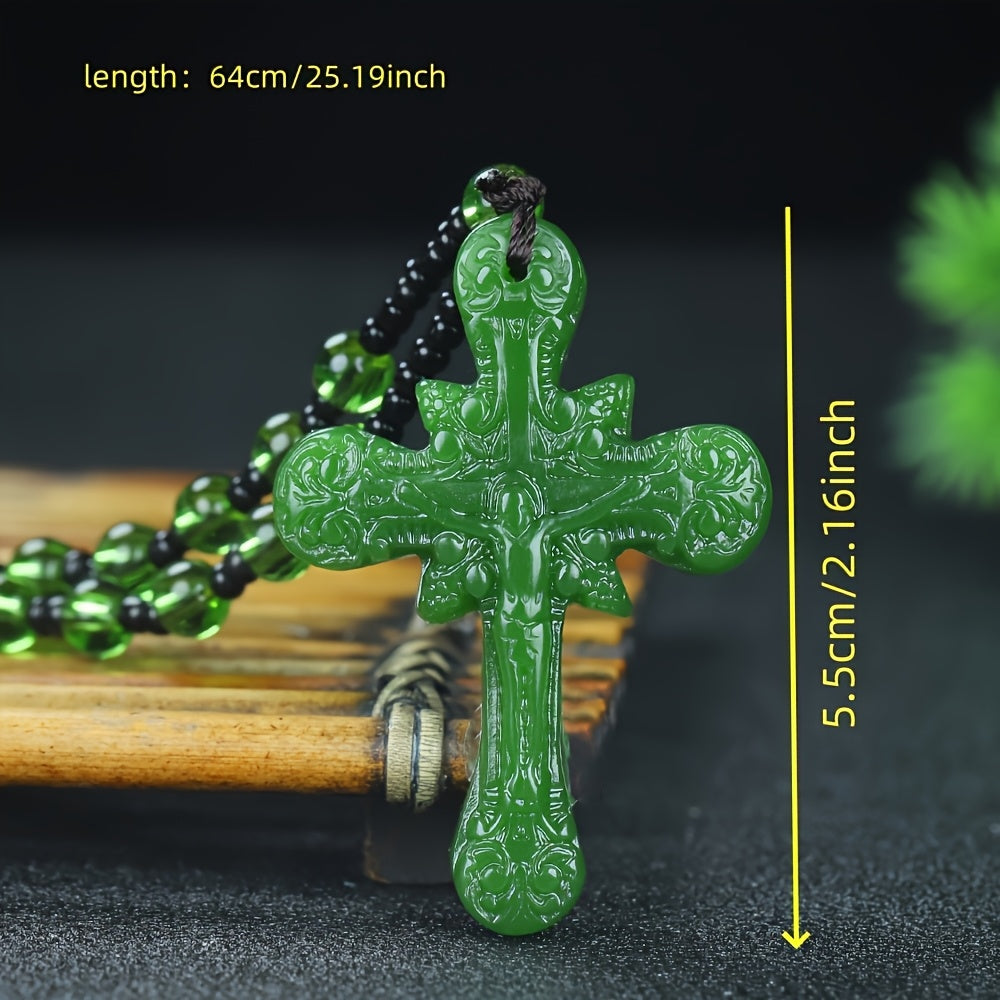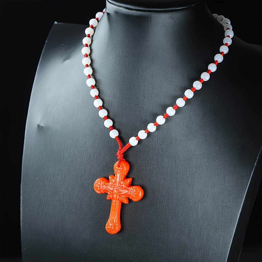 Elevate your style with this vintage natural stone cross pendant necklace featuring a casual red and green beaded chain. Suitable for both men and women.
