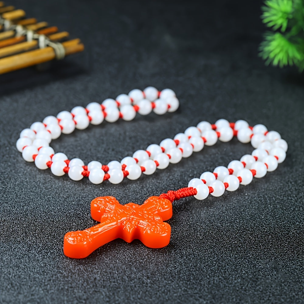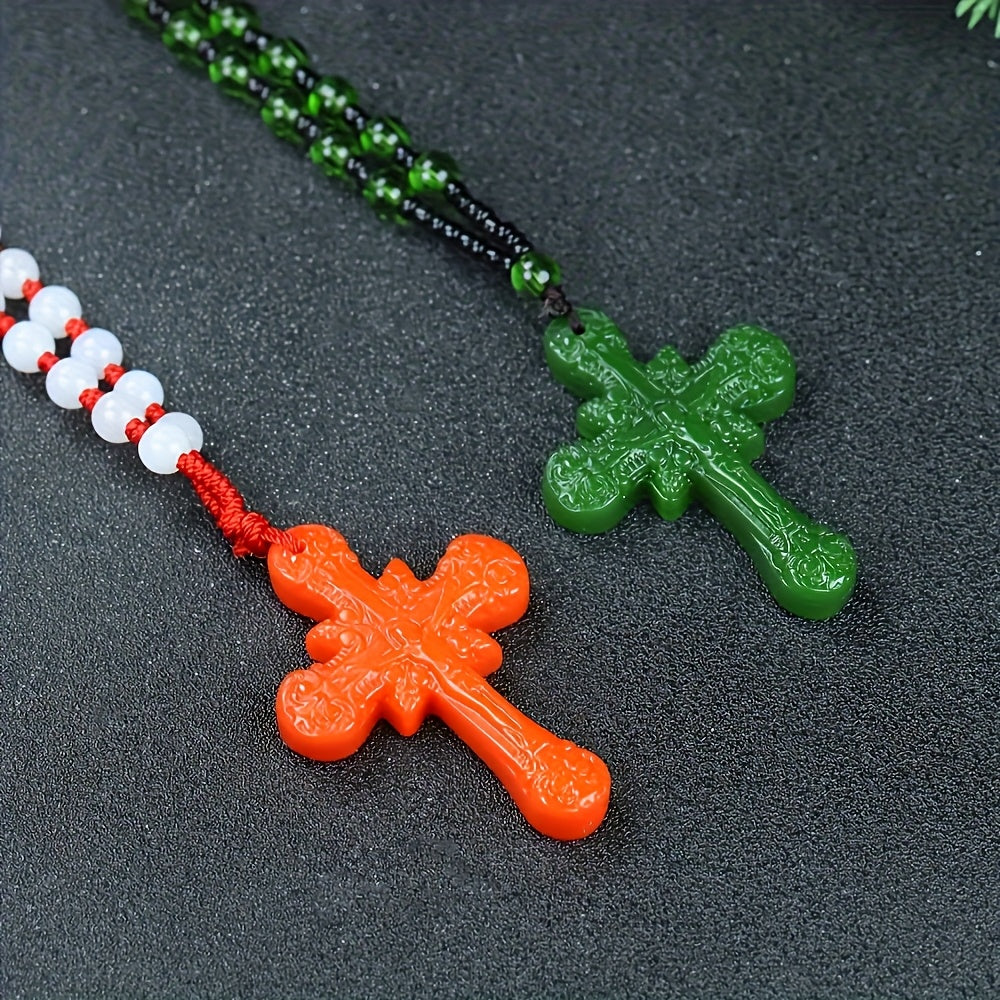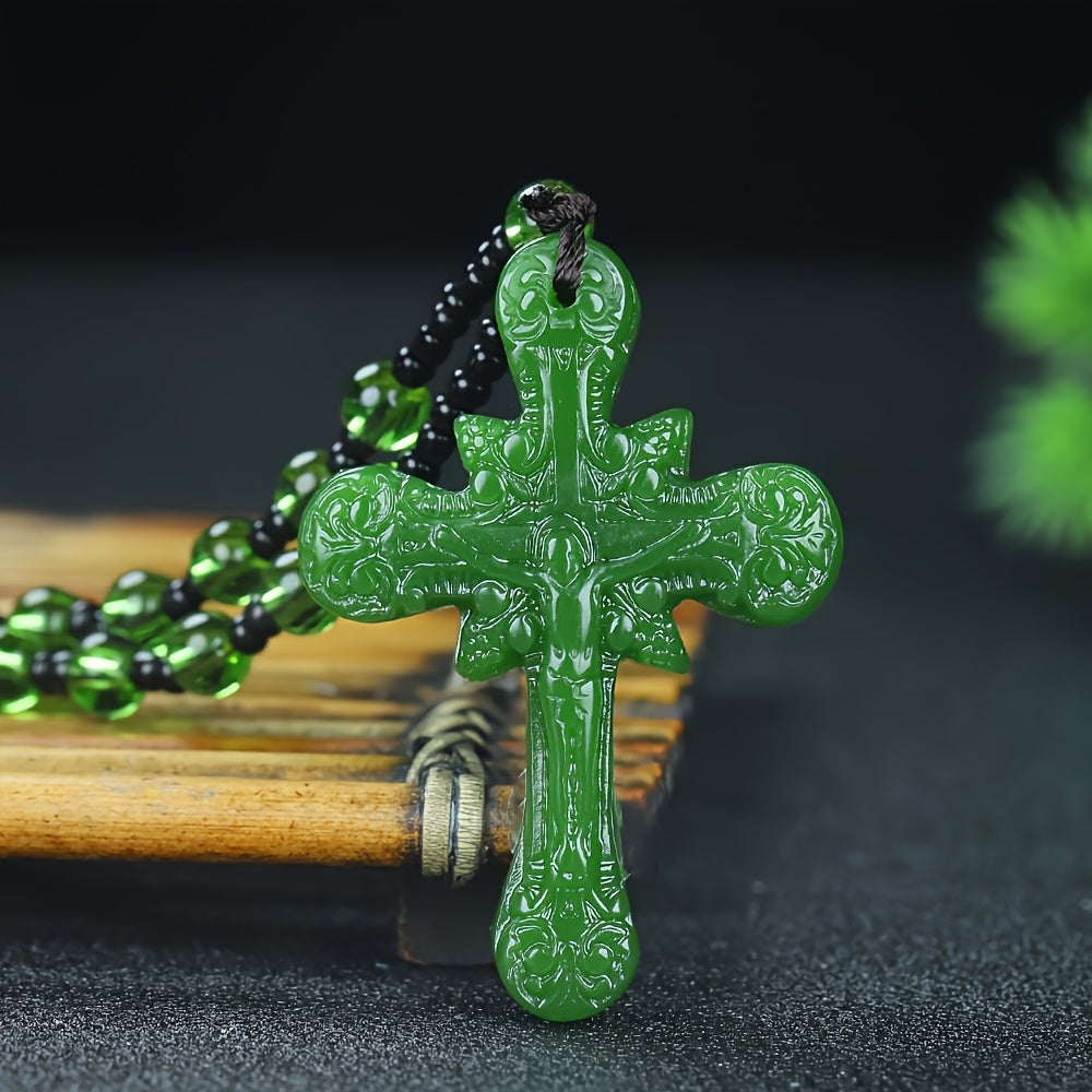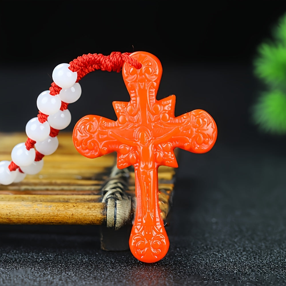 Elevate your style with this vintage natural stone cross pendant necklace featuring a casual red and green beaded chain. Suitable for both men and women.