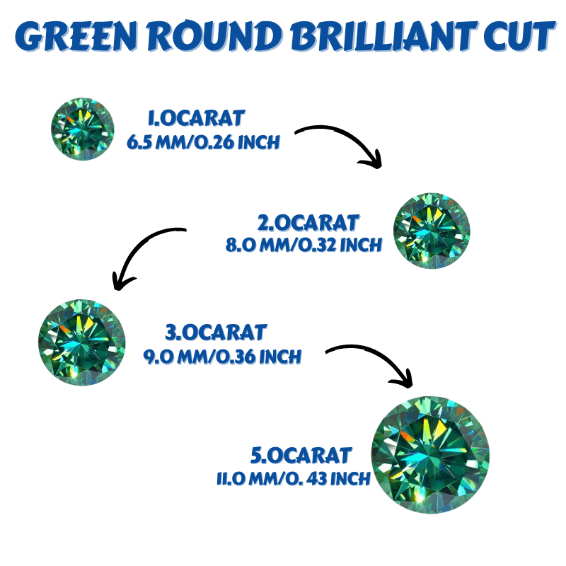High-quality green moissanite loose stones with 1 to 5 carat options. Each stone is lab-created with VVS1 clarity and an excellent round cut.