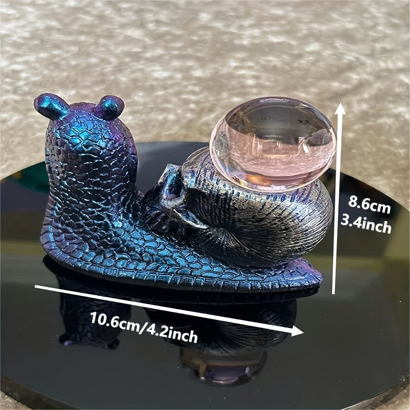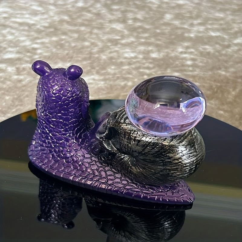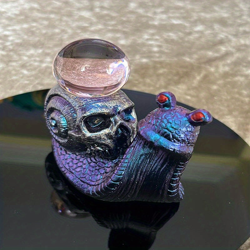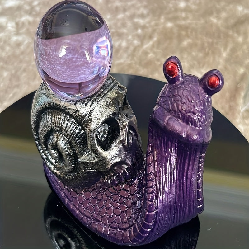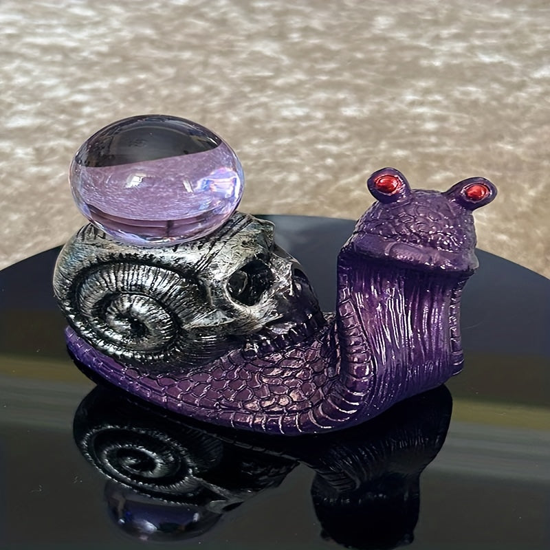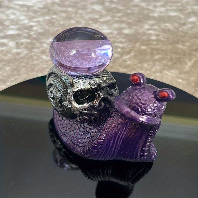 Enhance your crystal ball display with this set of 2 metallic purple resin snail bases featuring horned skull-shaped shells. Perfect for showcasing your crystal balls in a unique and gothic style.