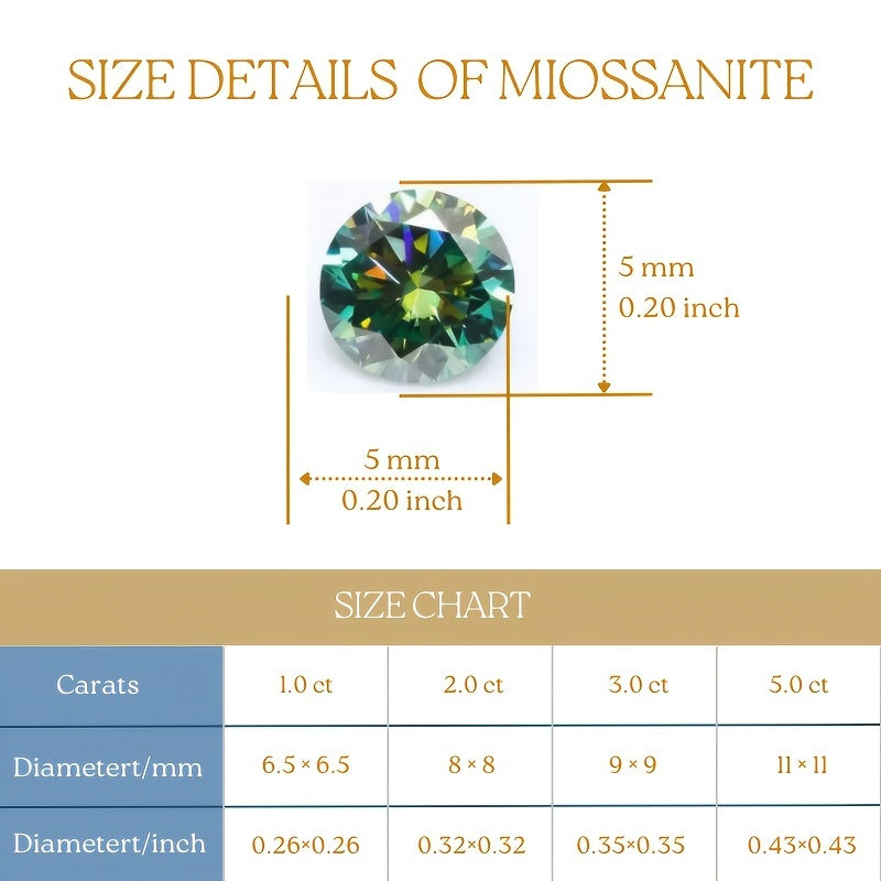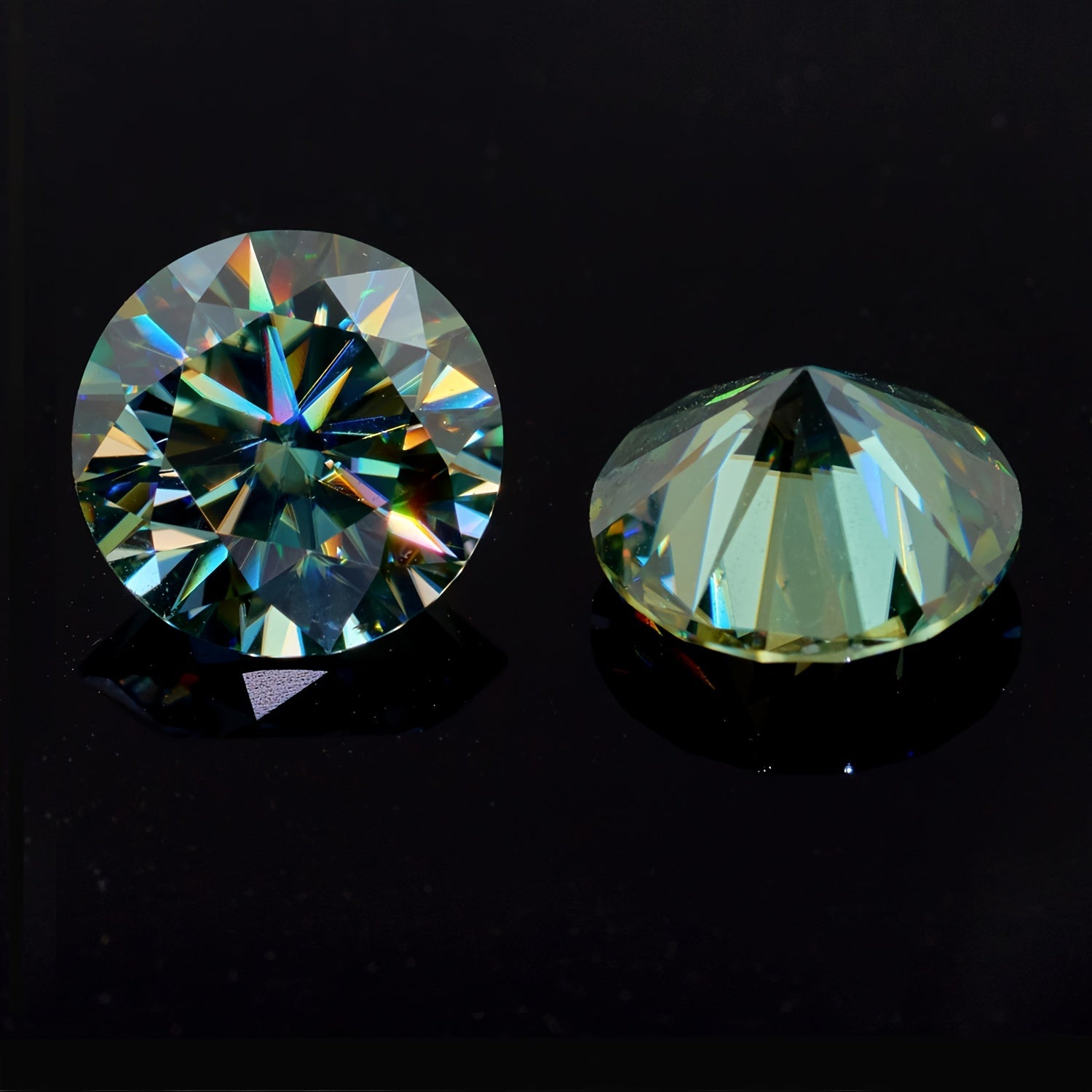 High-quality 5 Ct Green Moissanite Loose Stones with VVS1 clarity, excellent round cut, ideal for jewelry making. Comes with a report.