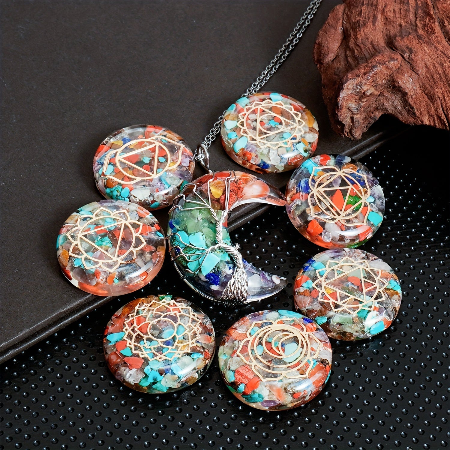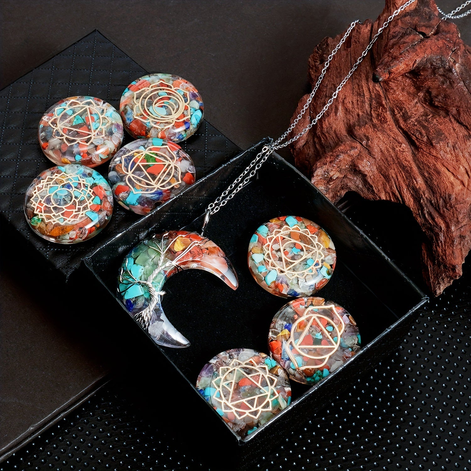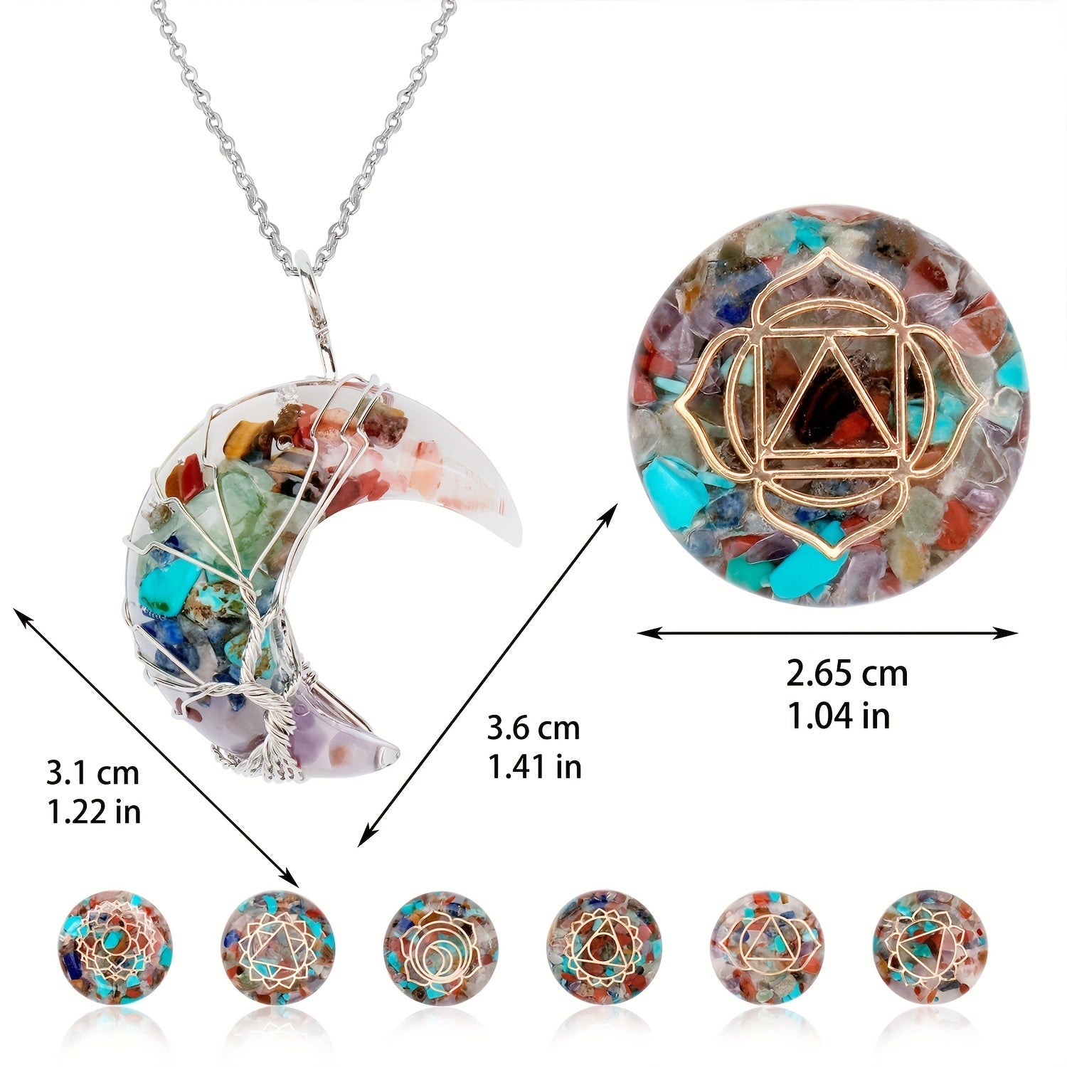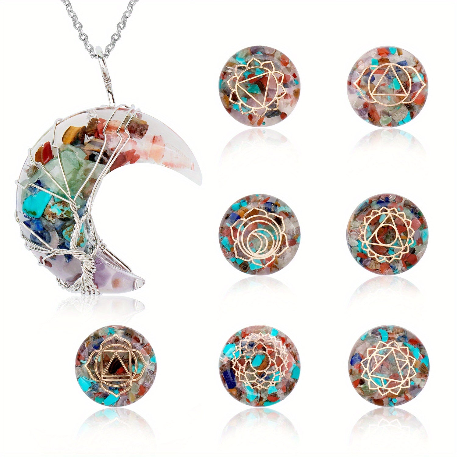 Beautiful set of natural crystal chakra moon necklace and 7 chakra yoga stones. Perfect as a home decor piece or as a Christmas or birthday gift.