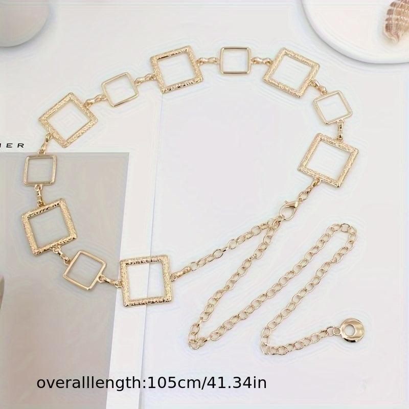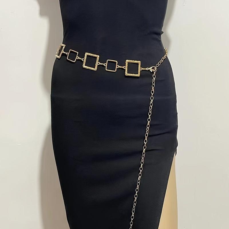 Enhance your outfit with this versatile waist chain belt featuring a hollow metal construction in a golden tone. Perfect accessory for daily commute or evening wear.
