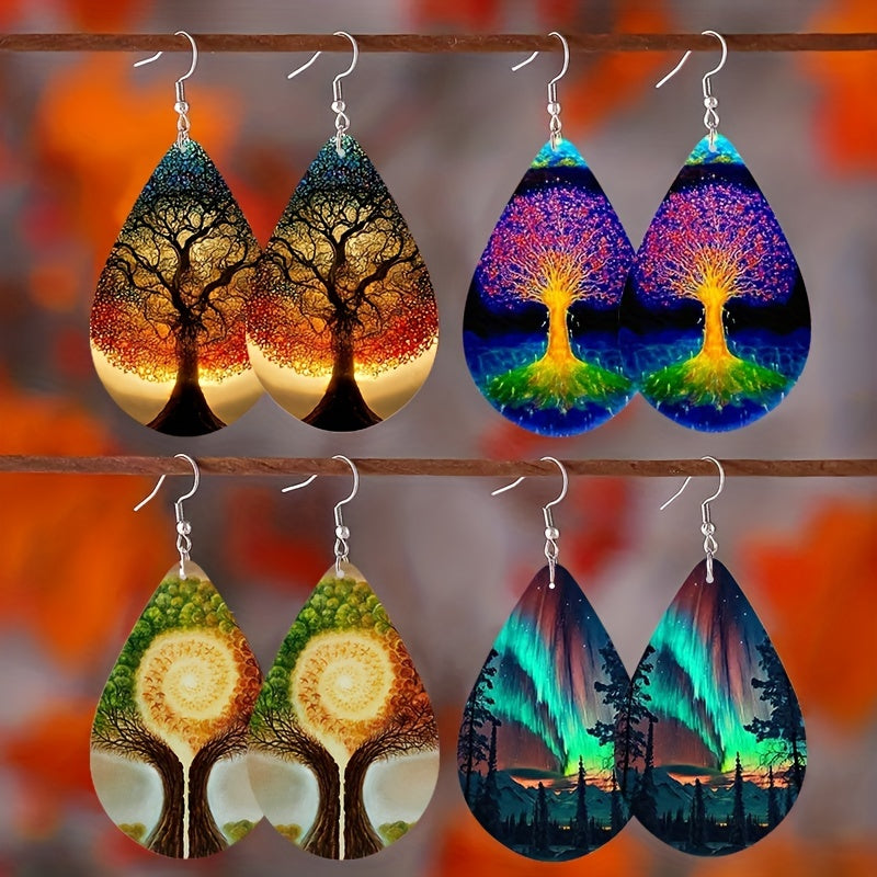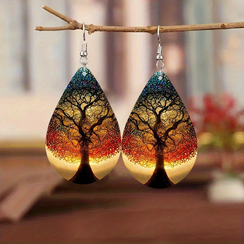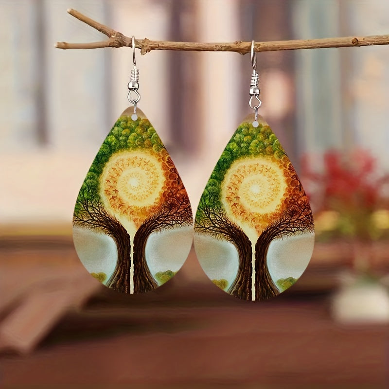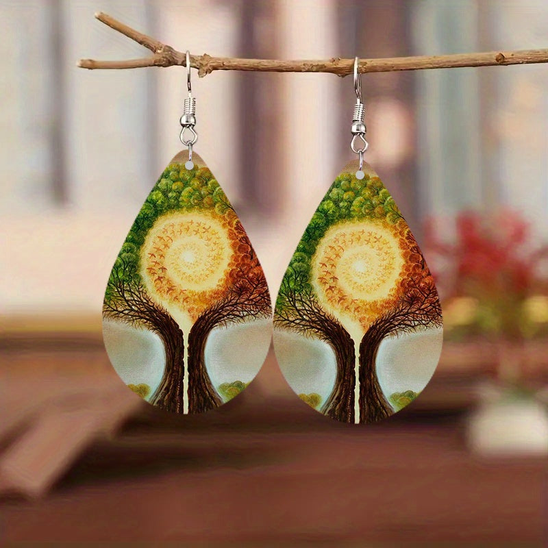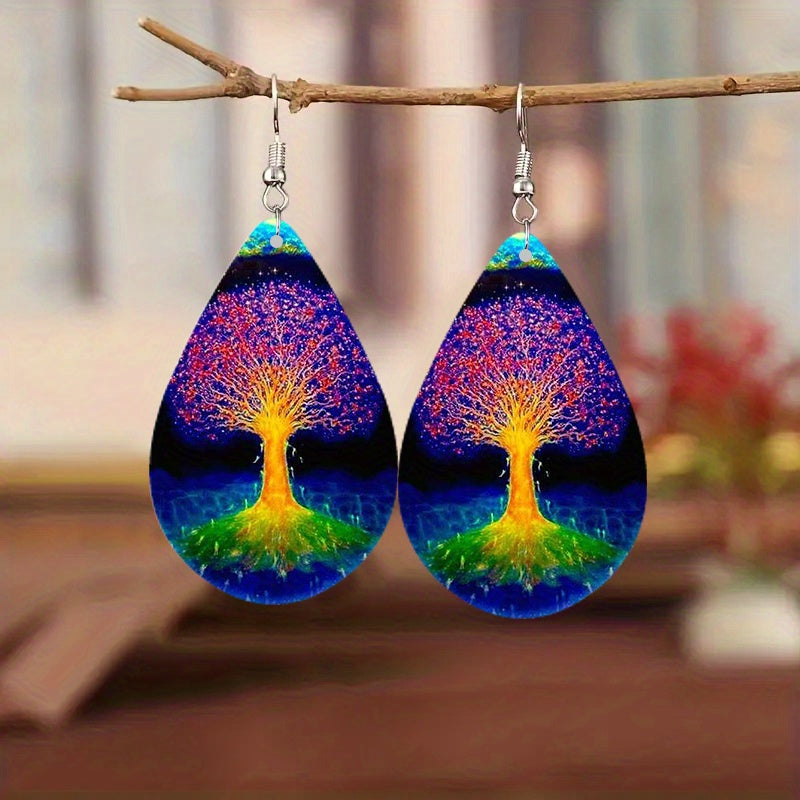Add a touch of vintage Bohemian style to your look with these wooden water drop earrings featuring a life tree aurora print. Perfect for holiday parties or as a special gift.