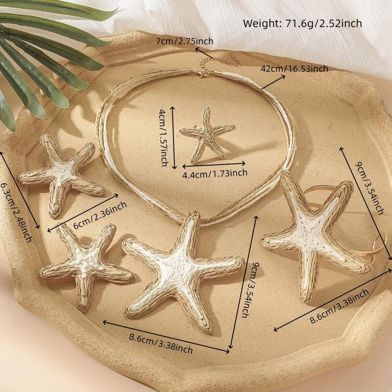Boho Raffia Starfish Jewelry Set - Necklace, Bracelet, Earrings, Ring