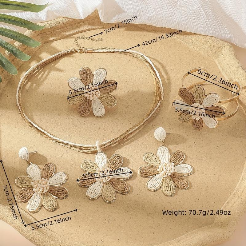 Embrace bohemian vacation vibes with this stunning raffia floral starfish pendant jewelry set. Perfect for summer ocean beach outings or vintage style.