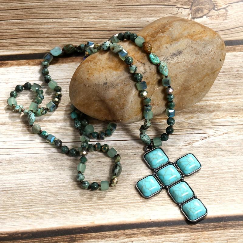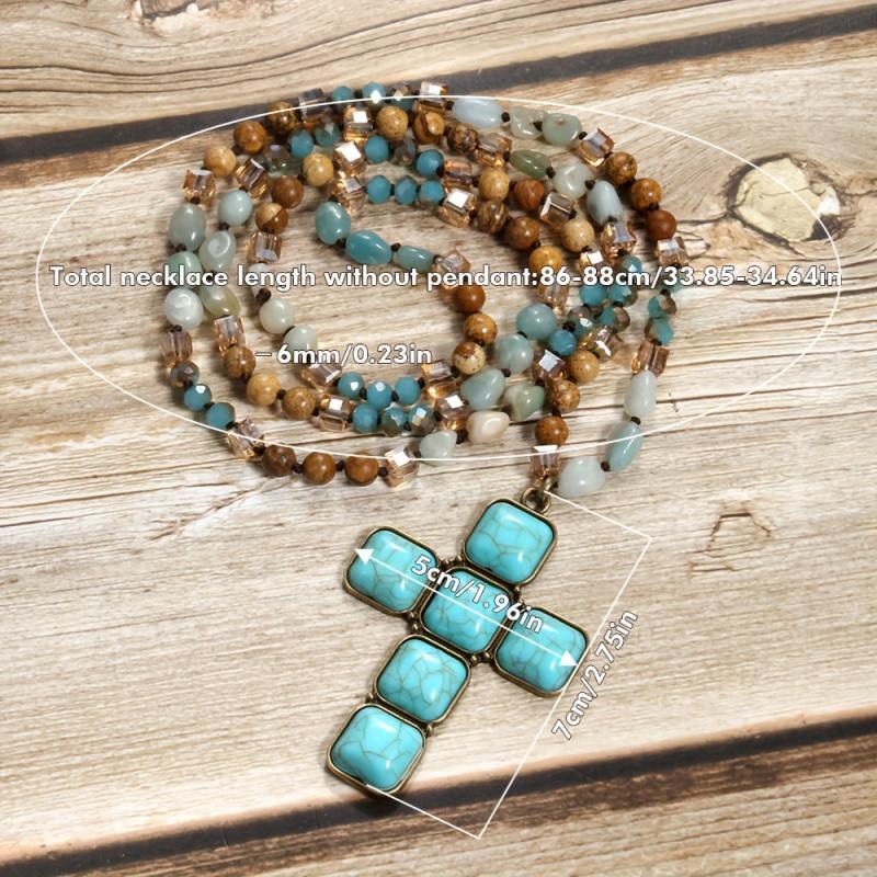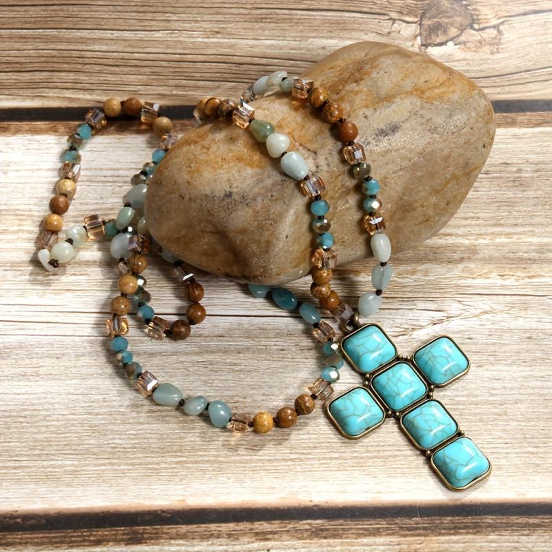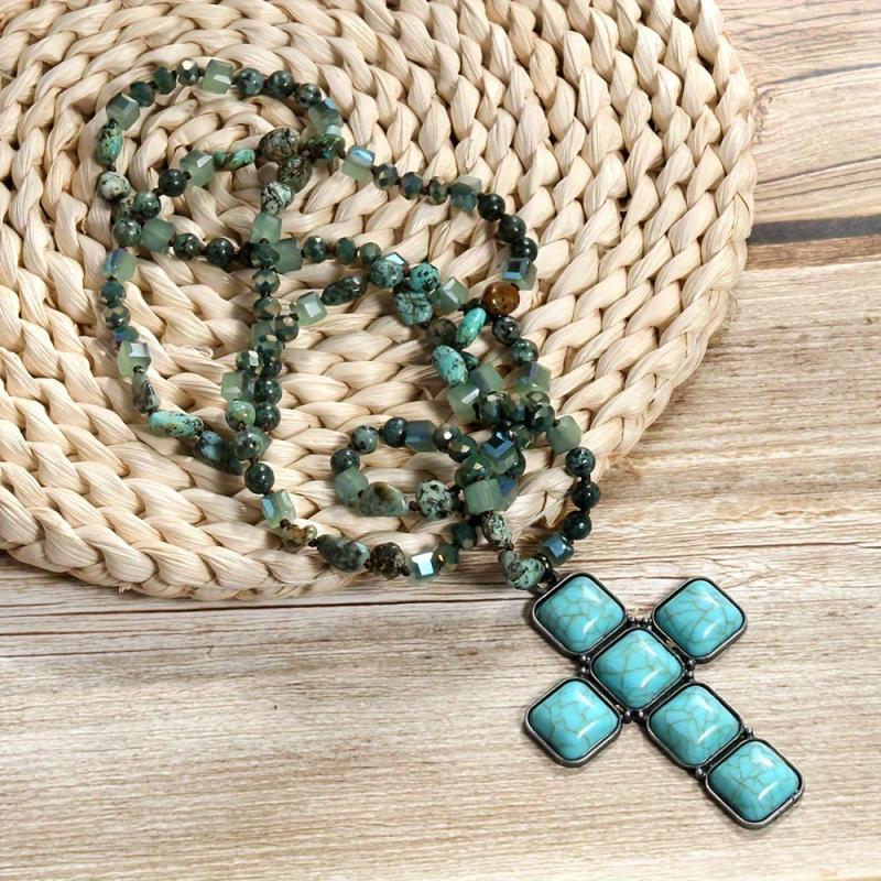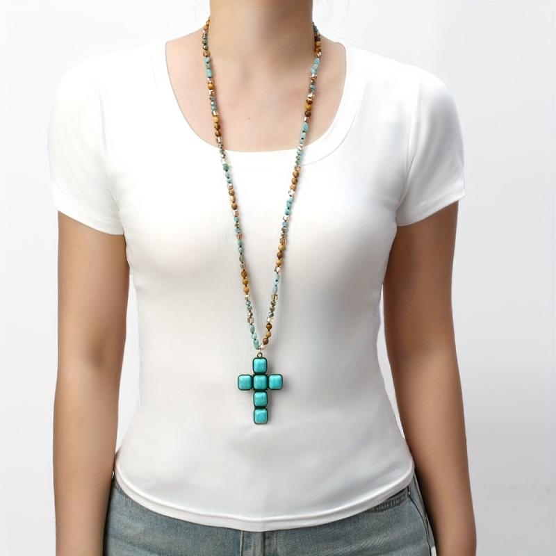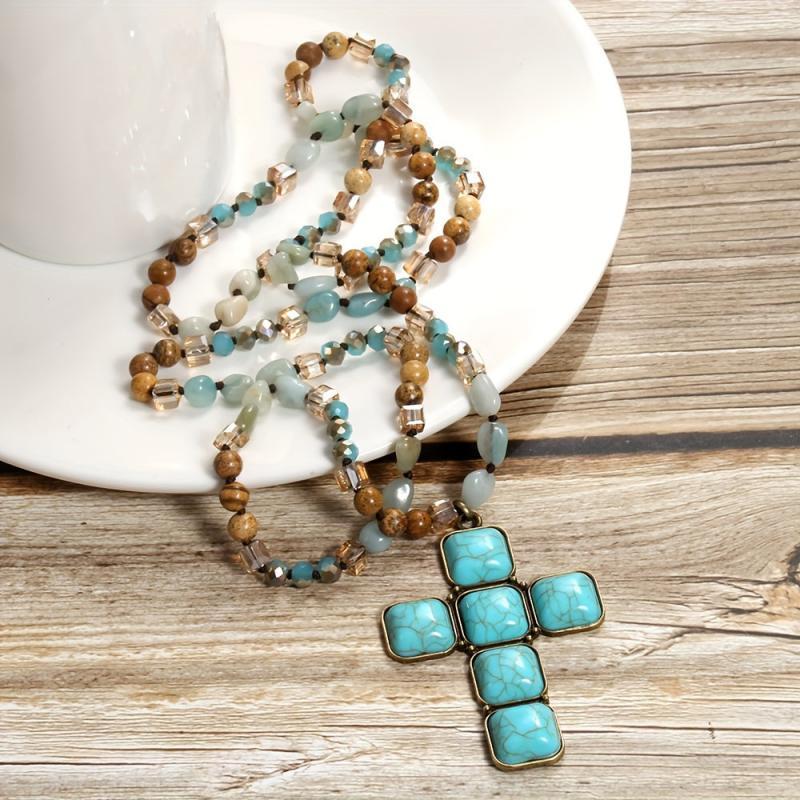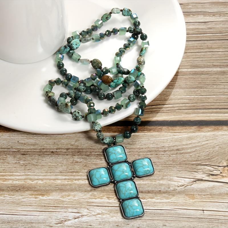 This unique necklace features turquoise stone and glass beads with a cross pendant.