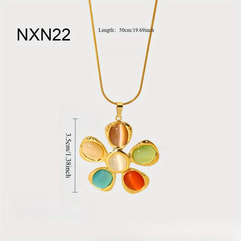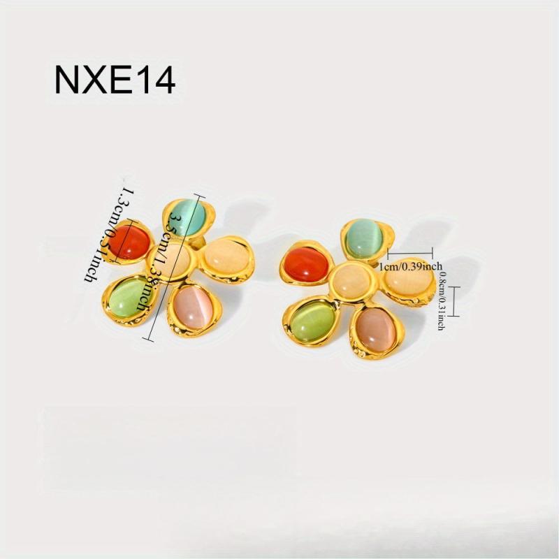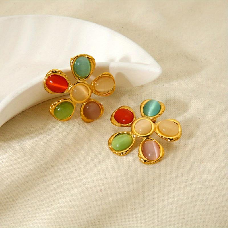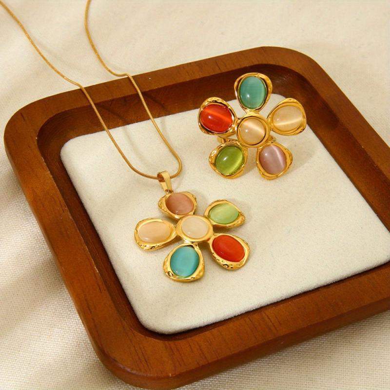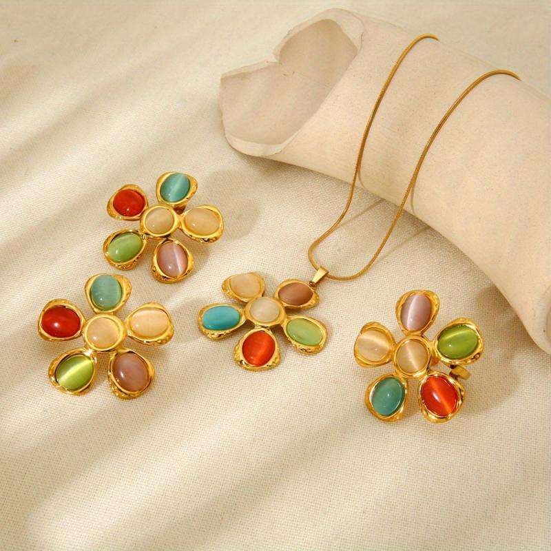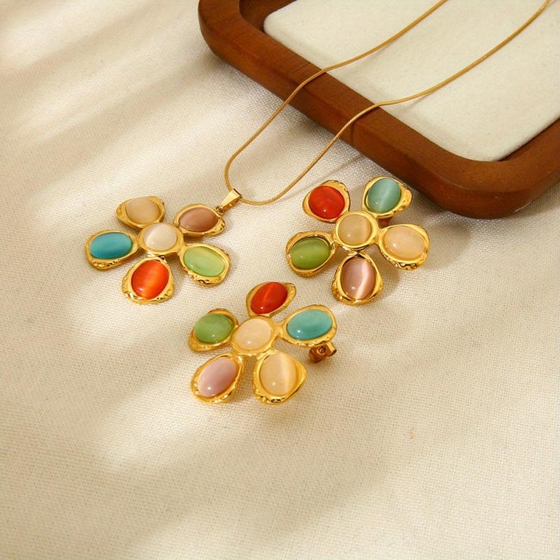 Colorful Cat Eye Glass Hammered Flower Plated Stainless Steel Set