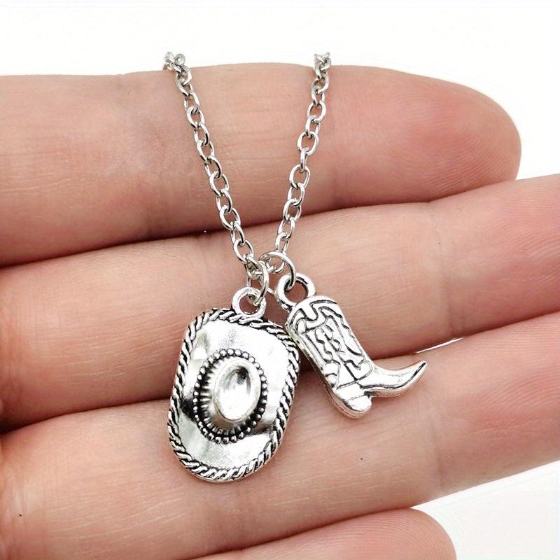 Complete your party or punk look with this stylish cowboy hat and cowgirl boots pendant necklace. Made with antique silvery finish, this unique piece of jewelry is perfect for women.