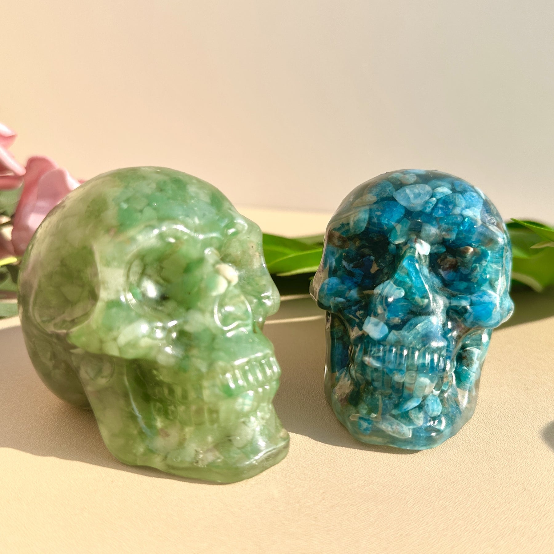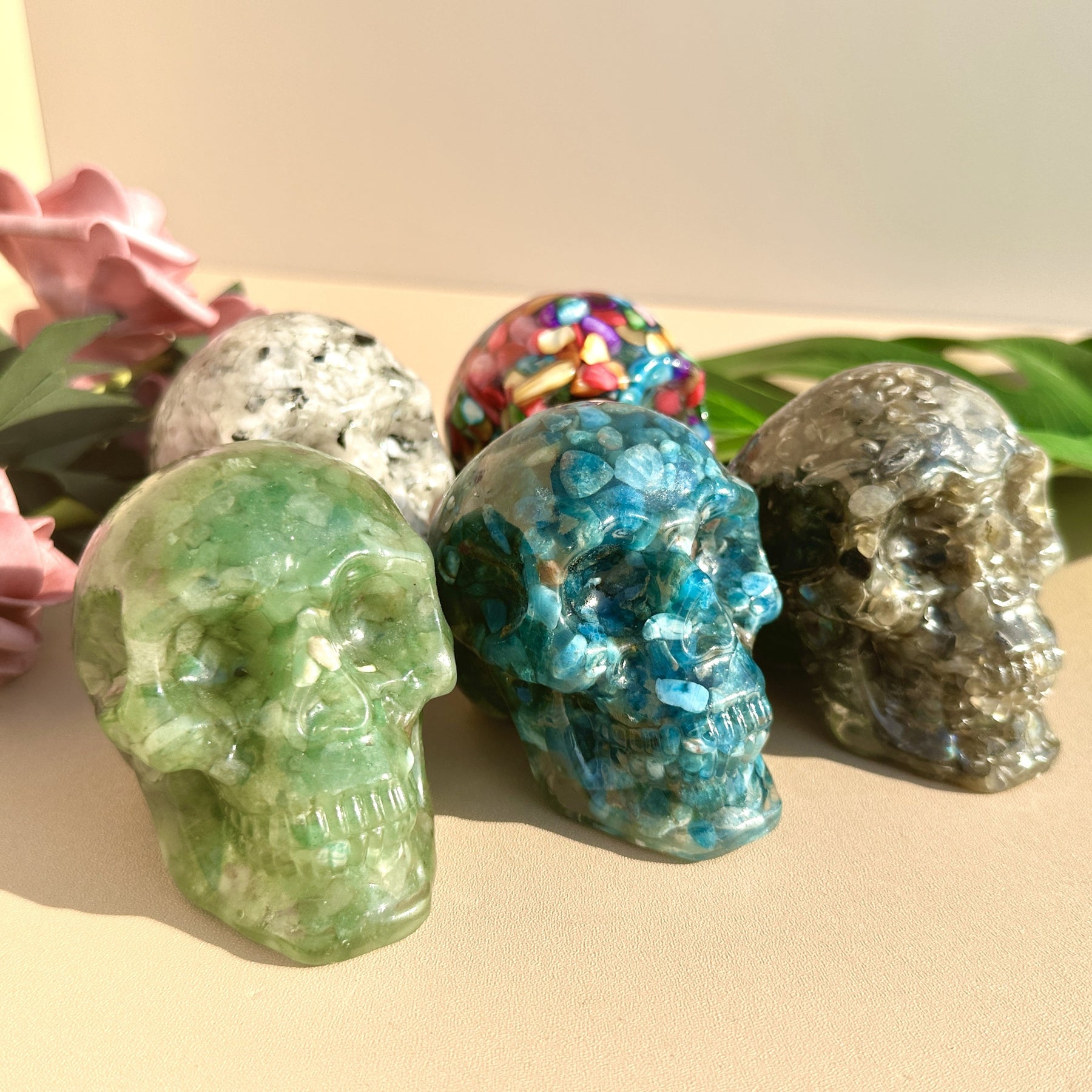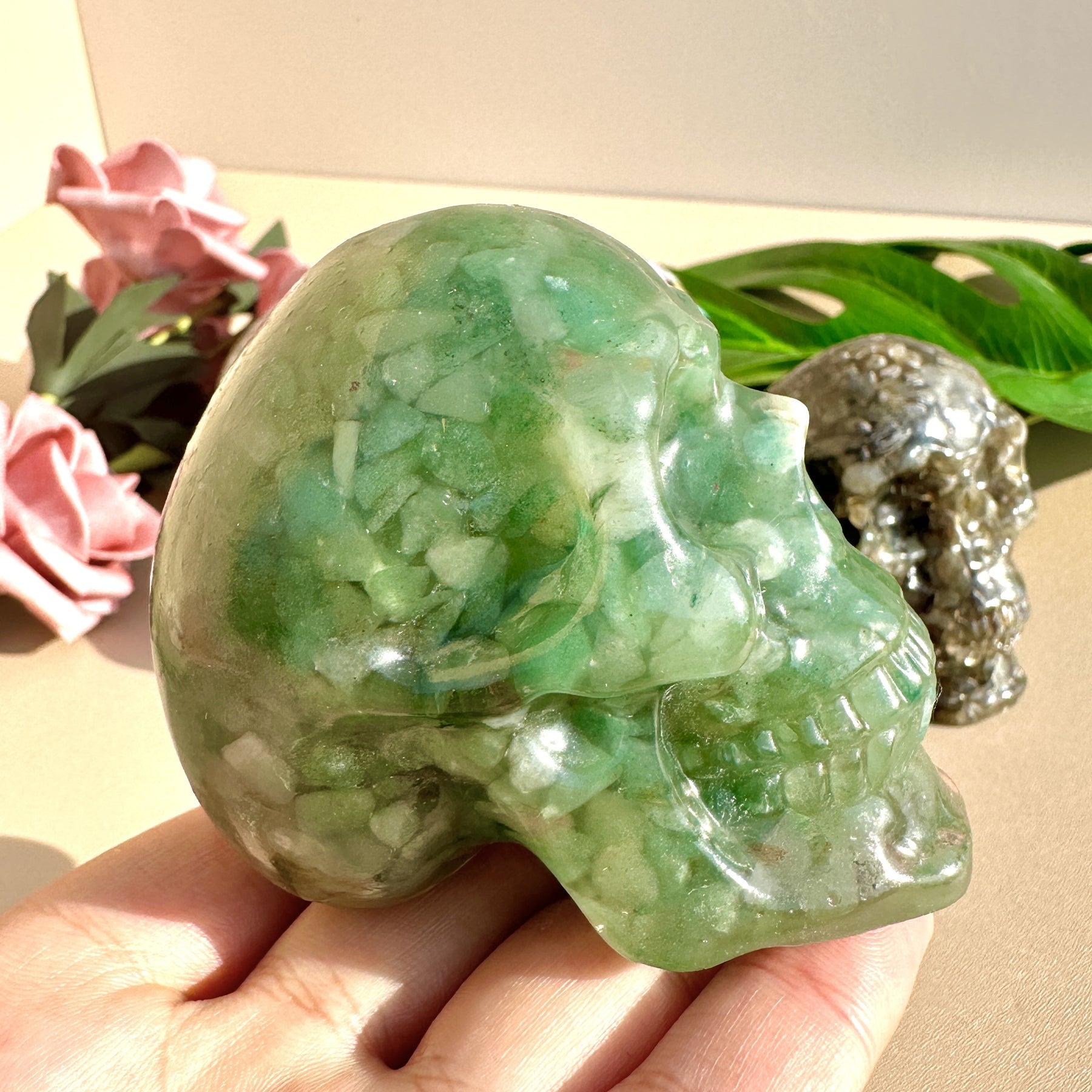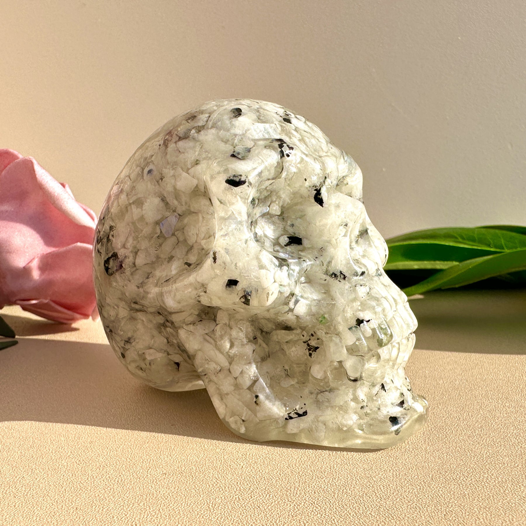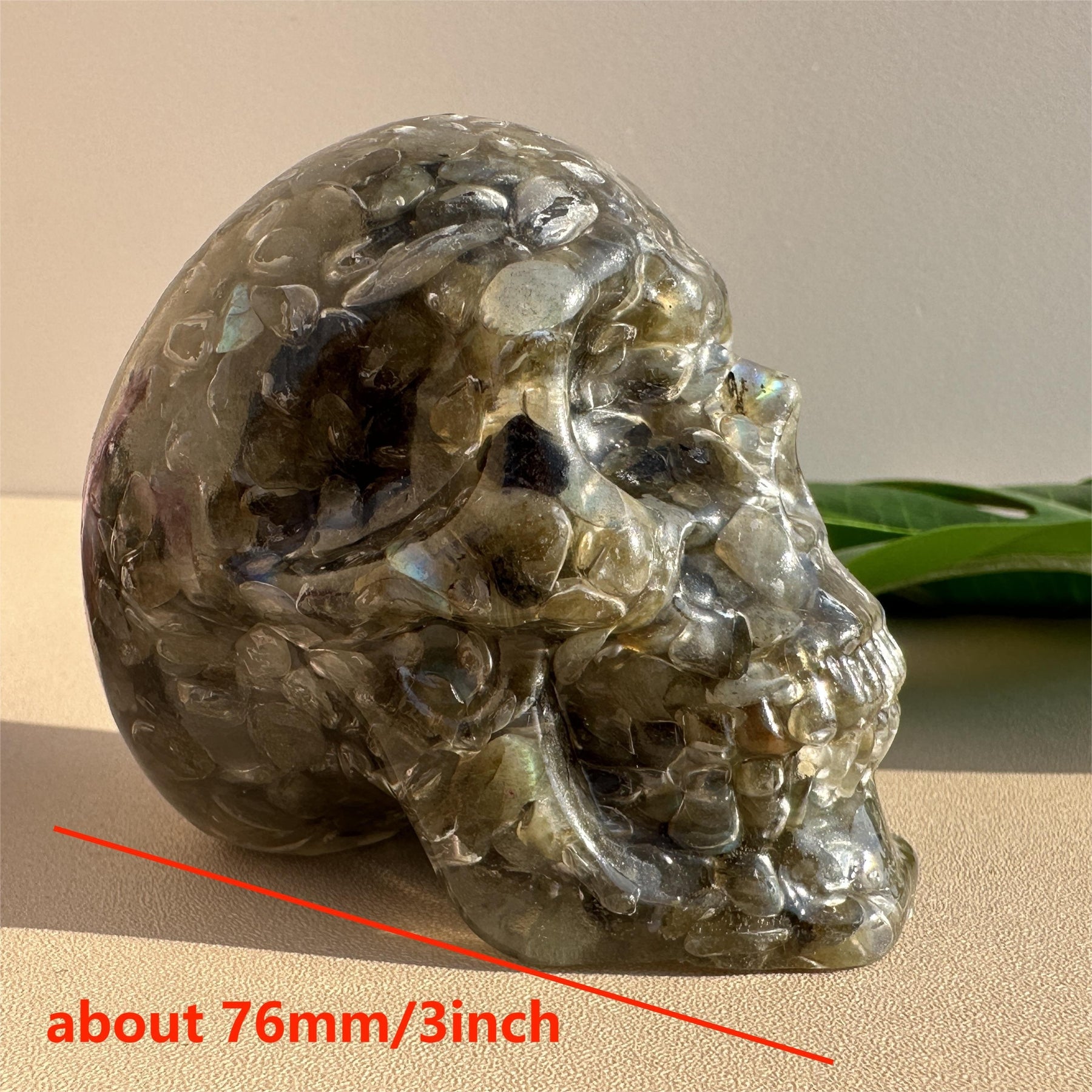 Add a touch of eerie elegance with this crystal skull resin ornament. Perfect for Halloween decor or as a unique gift. Crafted with crystal gravel for added sparkle.
