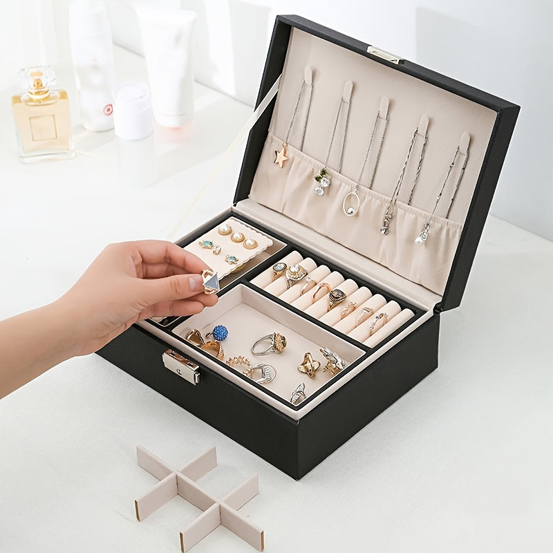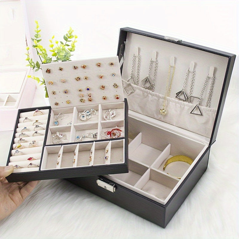 This double layer jewelry box is the perfect gift for women, girls, and wives. It features a sleek PU leather exterior and soft velvet lining to keep jewelry safe and organized.