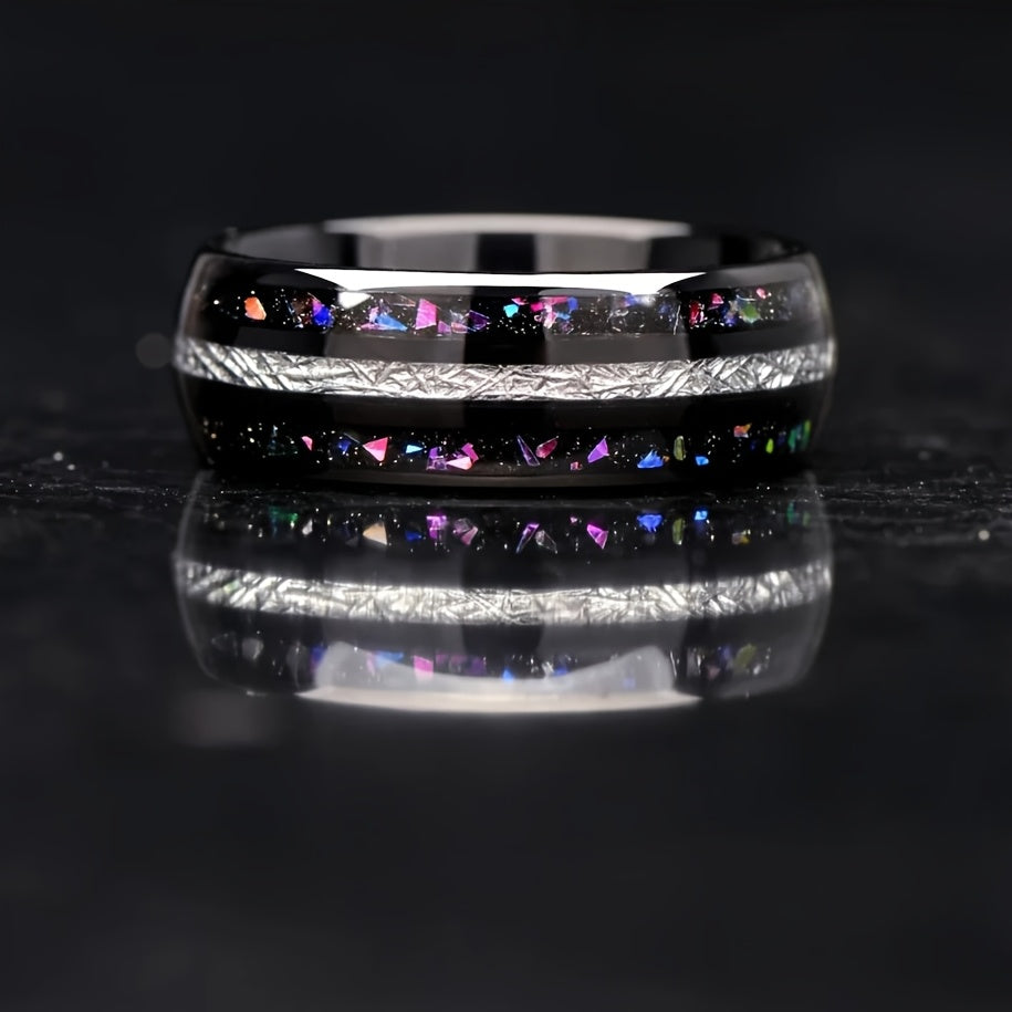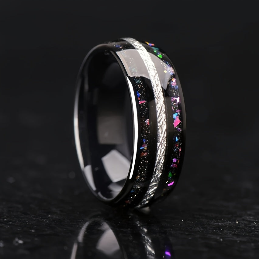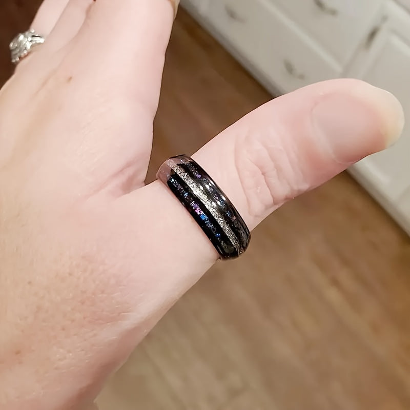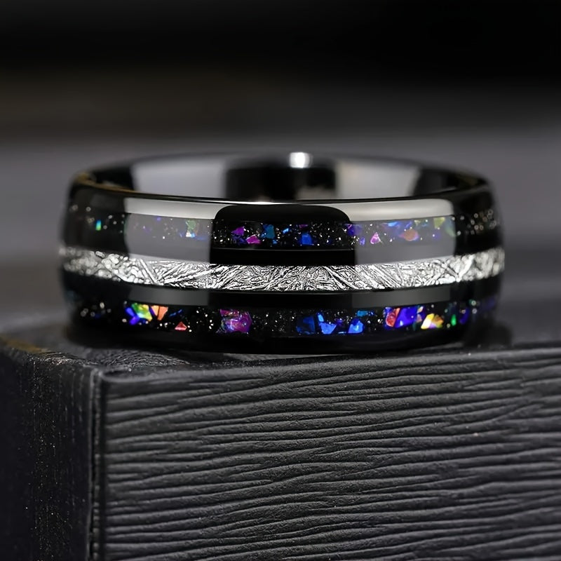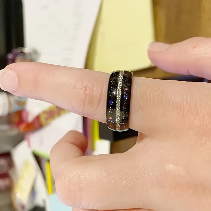 Elevate your style with this stainless steel ring featuring a mesmerizing galaxy shimmer inlay. Suitable for daily wear, this band is an ideal accessory for all seasons.