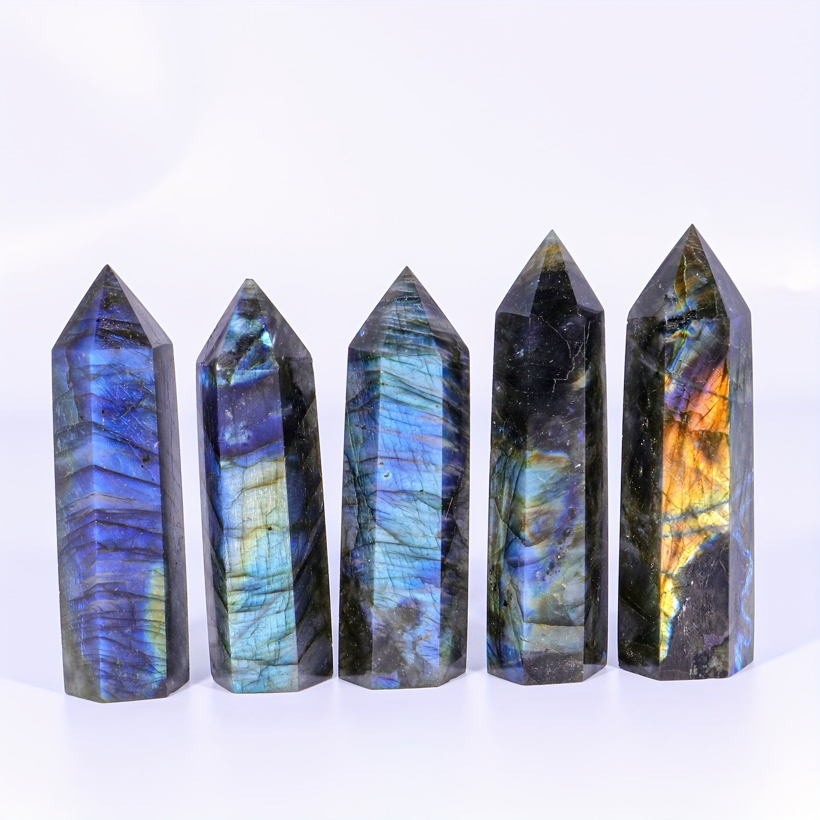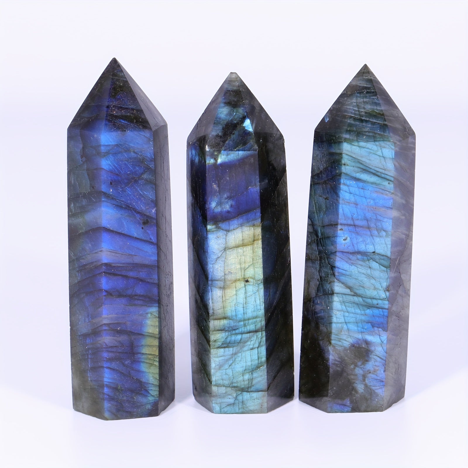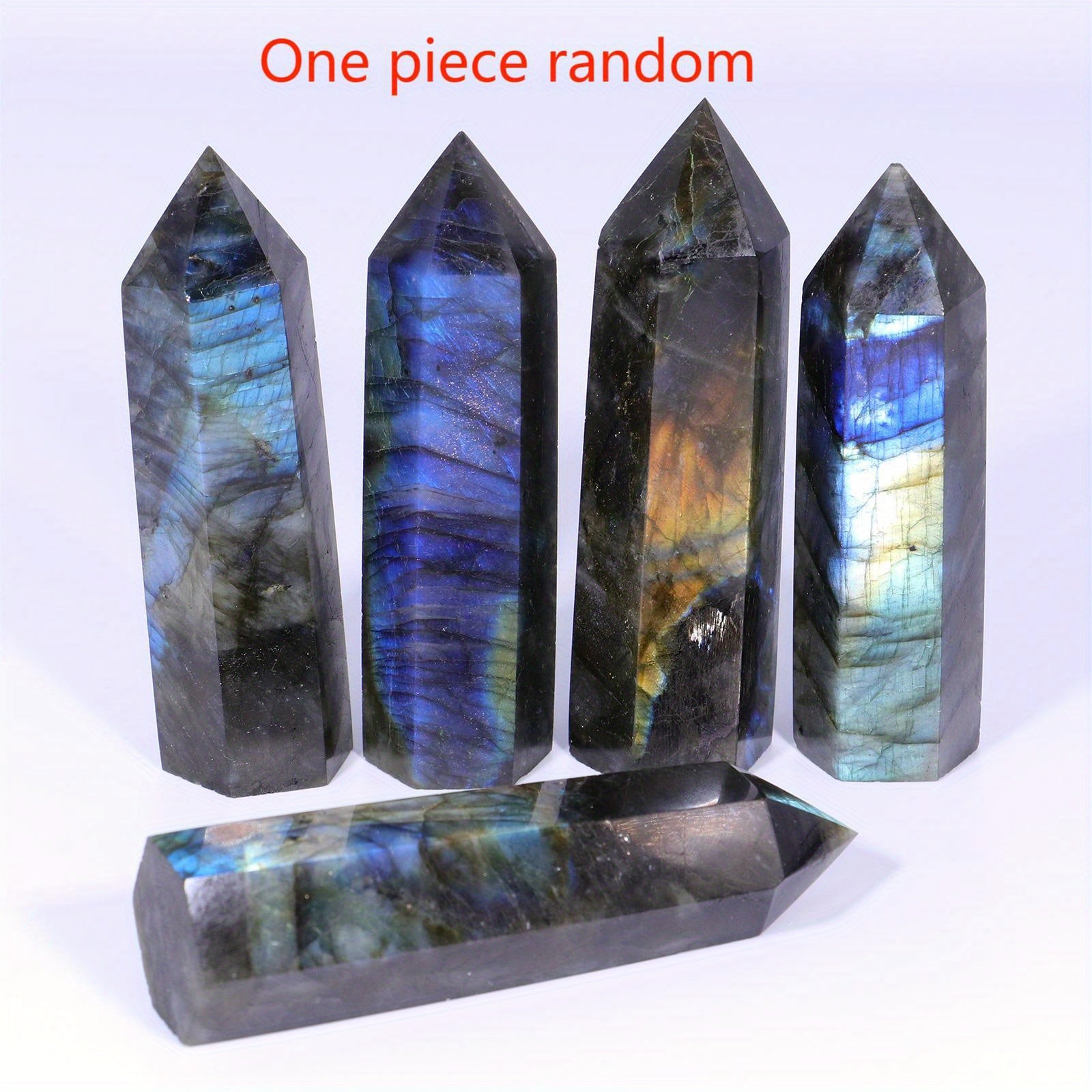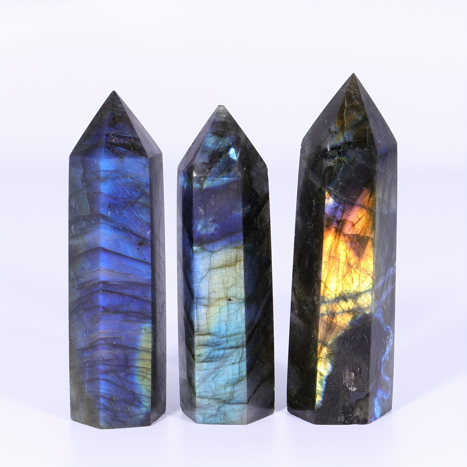 This natural crystal pillar made of healing Labradorite exudes calming energy. It is perfect for crystal healing practices and can be used as a desk decoration or bedside table accent.