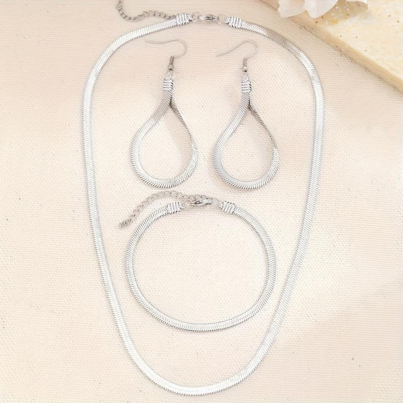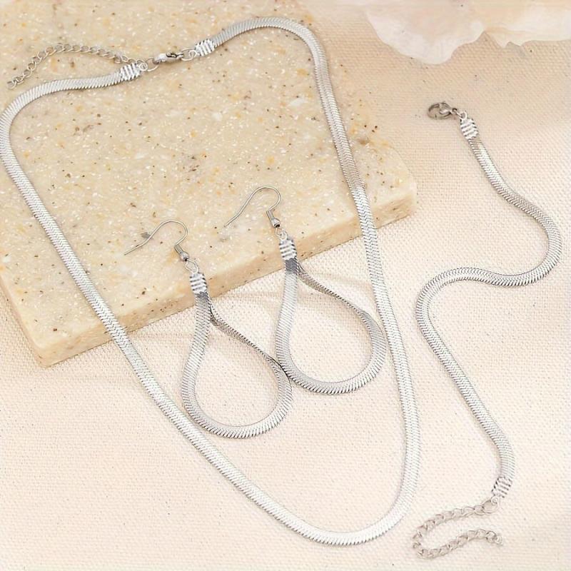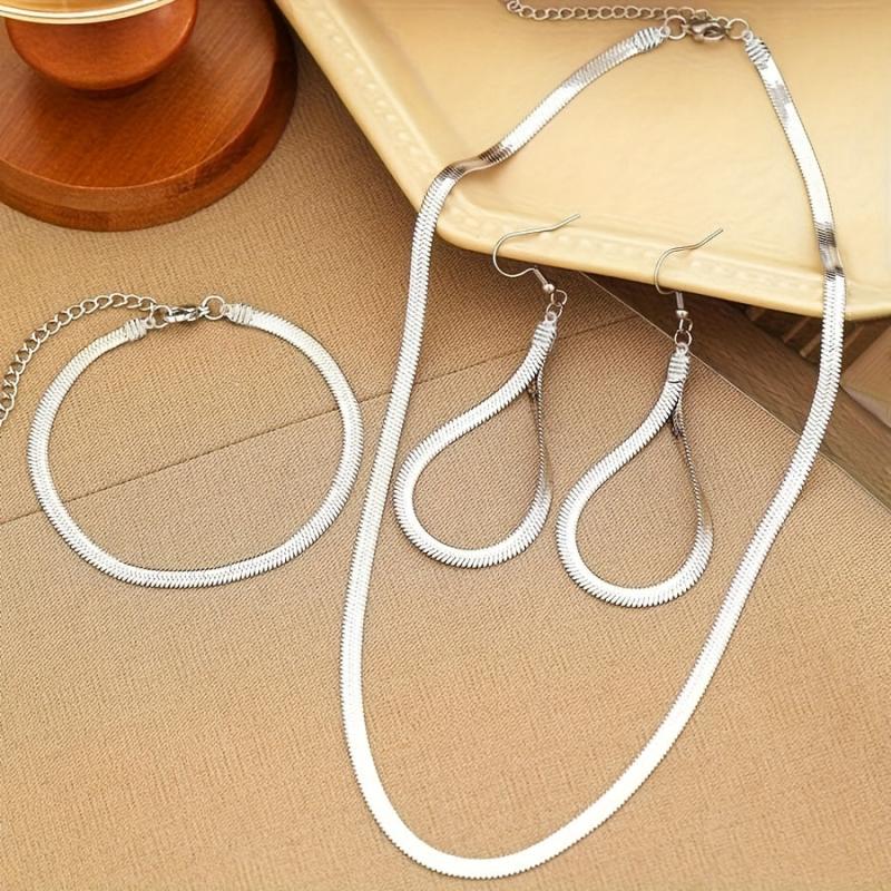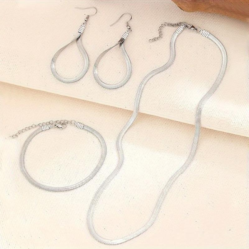 Elevate your look with this silvery hip hop style snake bone chain necklace set. This versatile set includes a collarbone chain, bracelet, and earrings for a complete and stylish accessory collection.