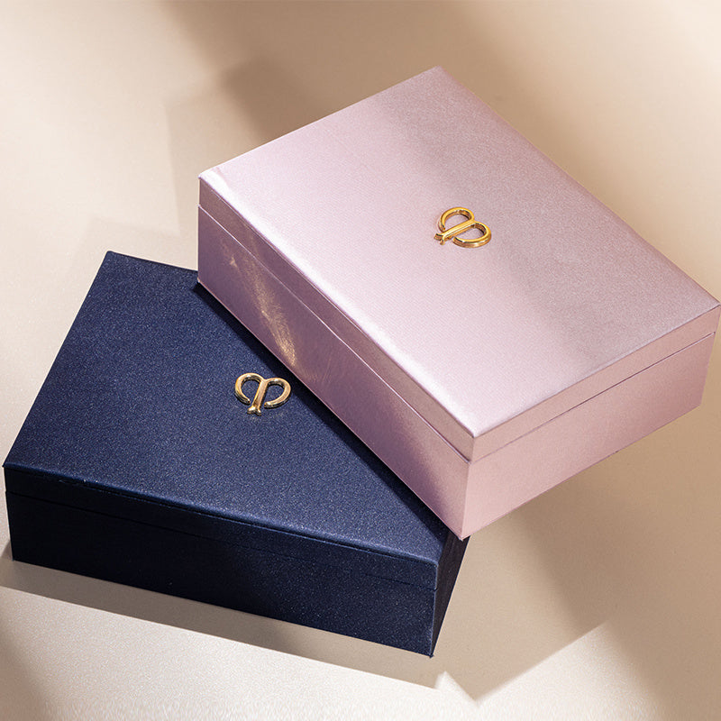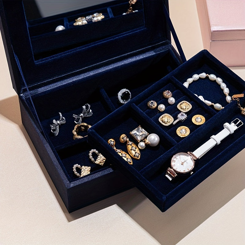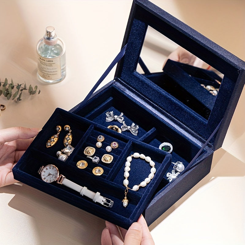 This stylish jewelry storage box features a built-in mirror and compartments for organizing necklaces, earrings, and rings. Keep your jewelry safe and organized with this box.