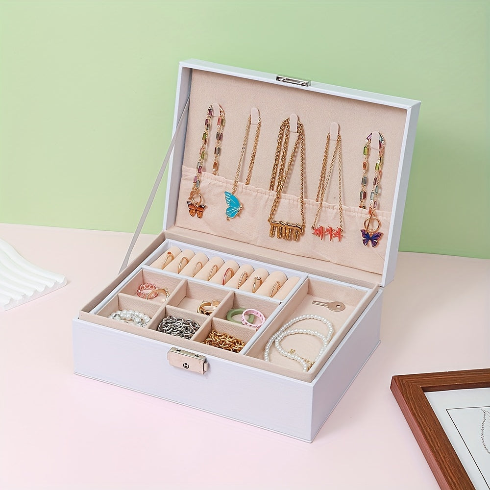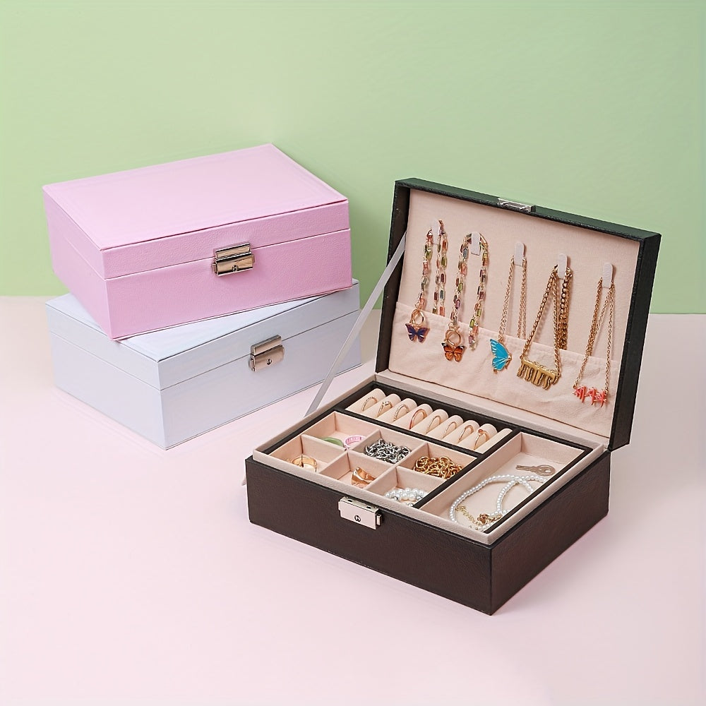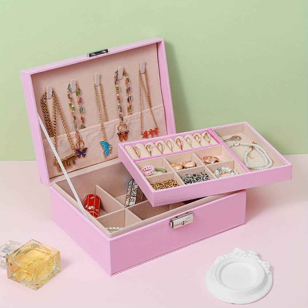 Keep your earrings, necklaces, and rings organized with this double-layer jewelry box. Ideal for storing and displaying your precious accessories.