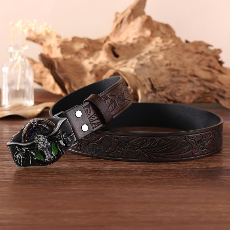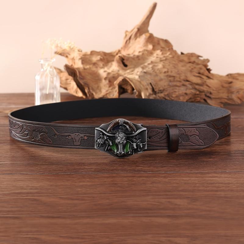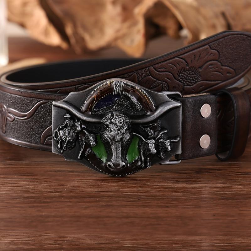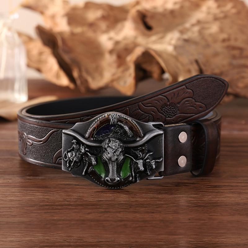 Men's Western Cowboy Style Faux Leather Belt with Intricate Buckle
