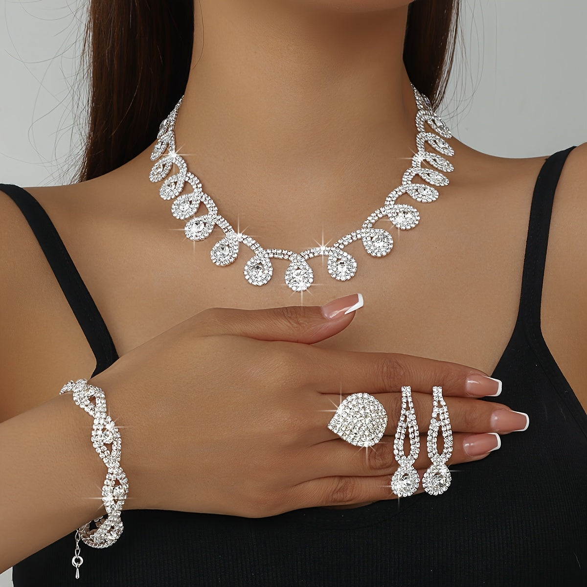 Complete your bridal look with this stunning Middle Eastern inspired four piece set featuring a flower drop necklace, bracelet, earrings, and ring.