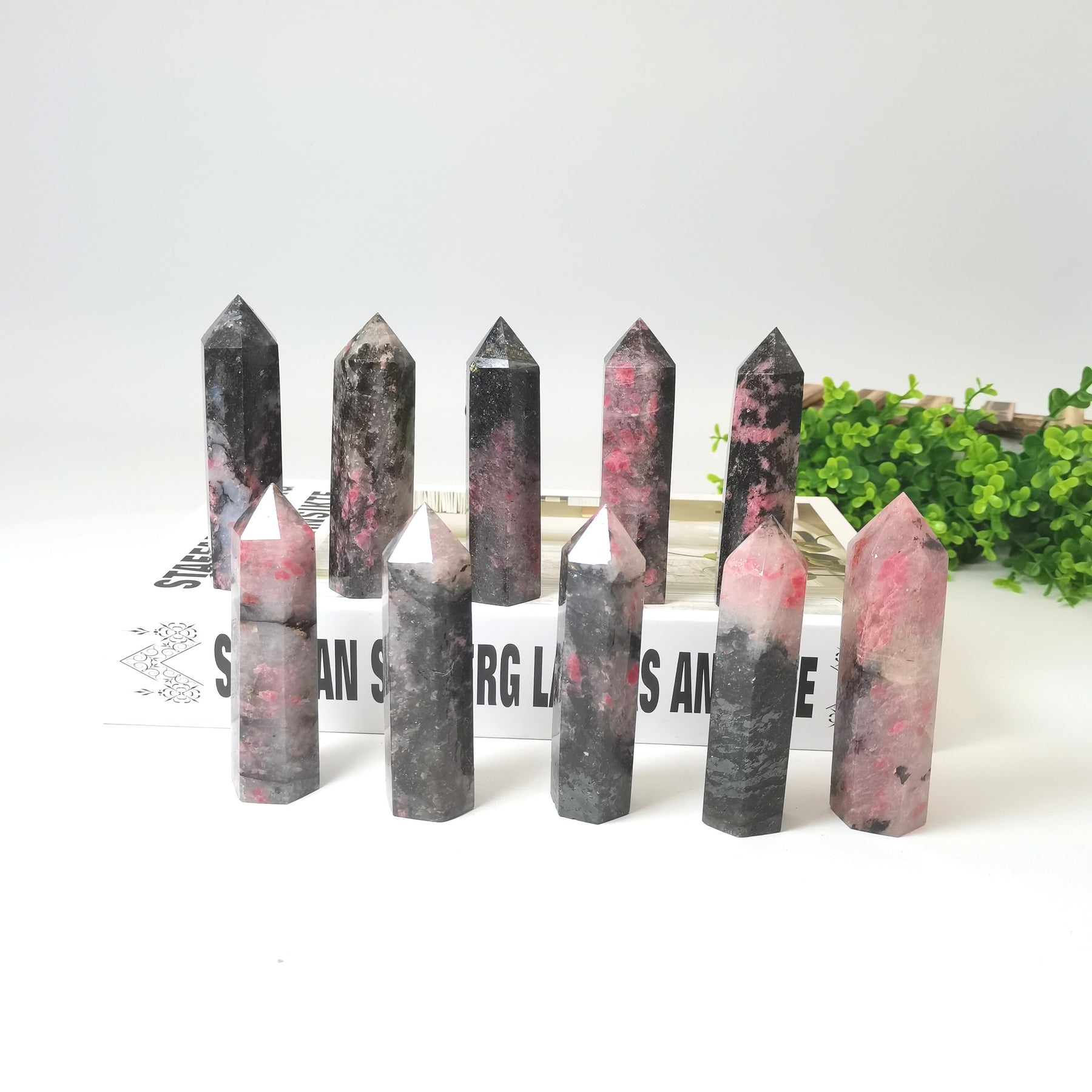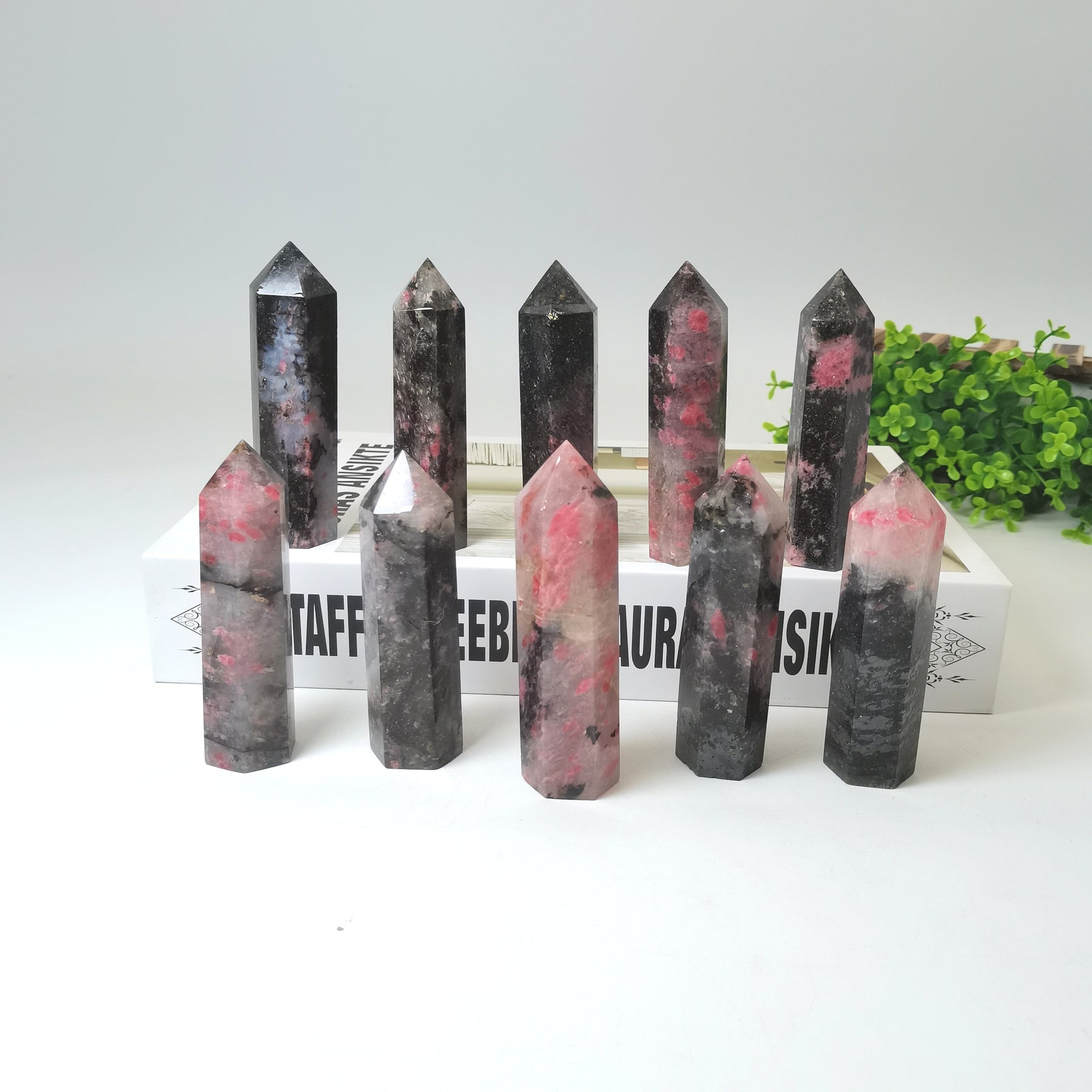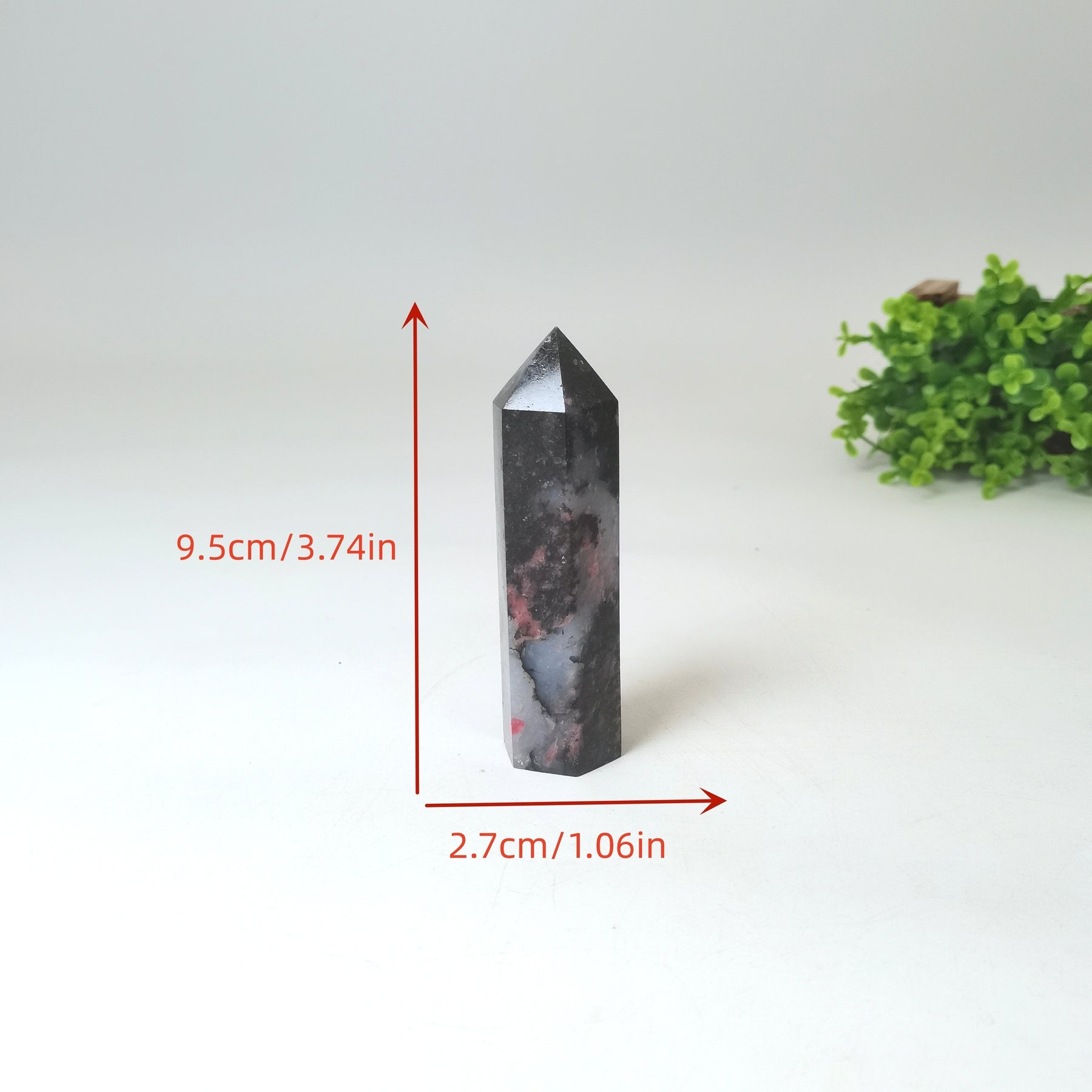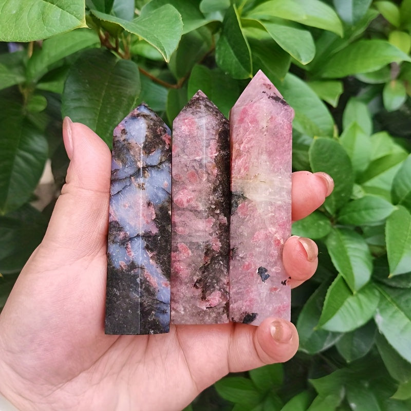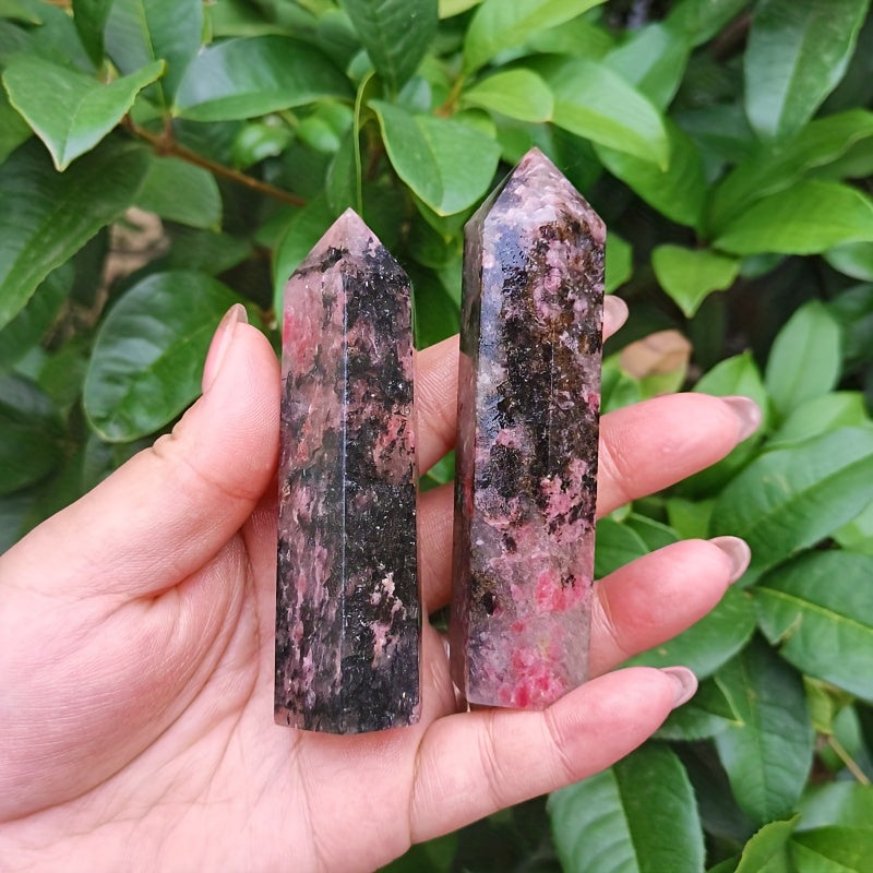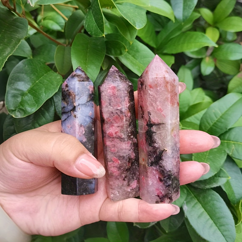 This single pointed column of natural Plum Tourmaline Crystal is perfect for meditation, Reiki healing, and as home decor. It features a floating flower rose stone design.