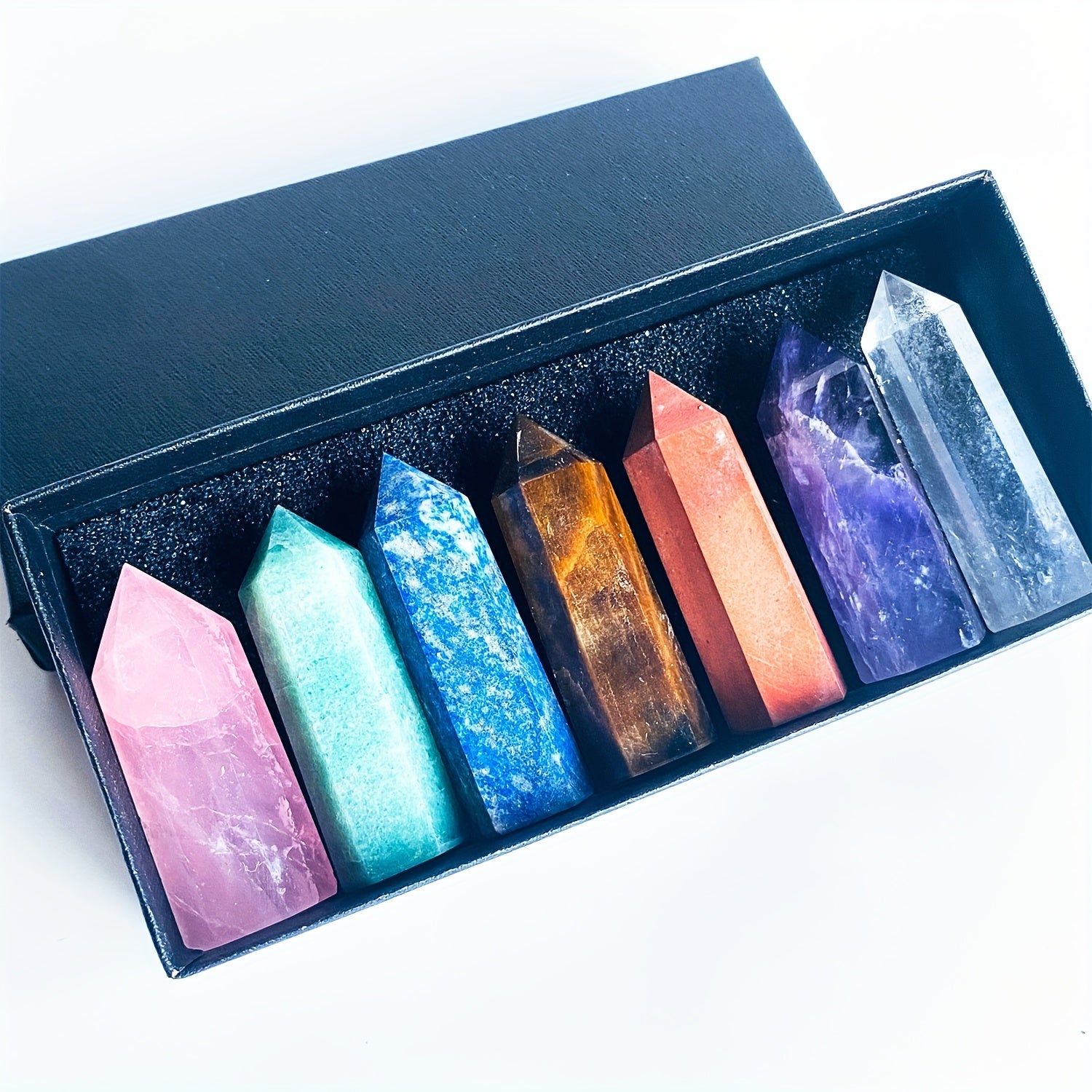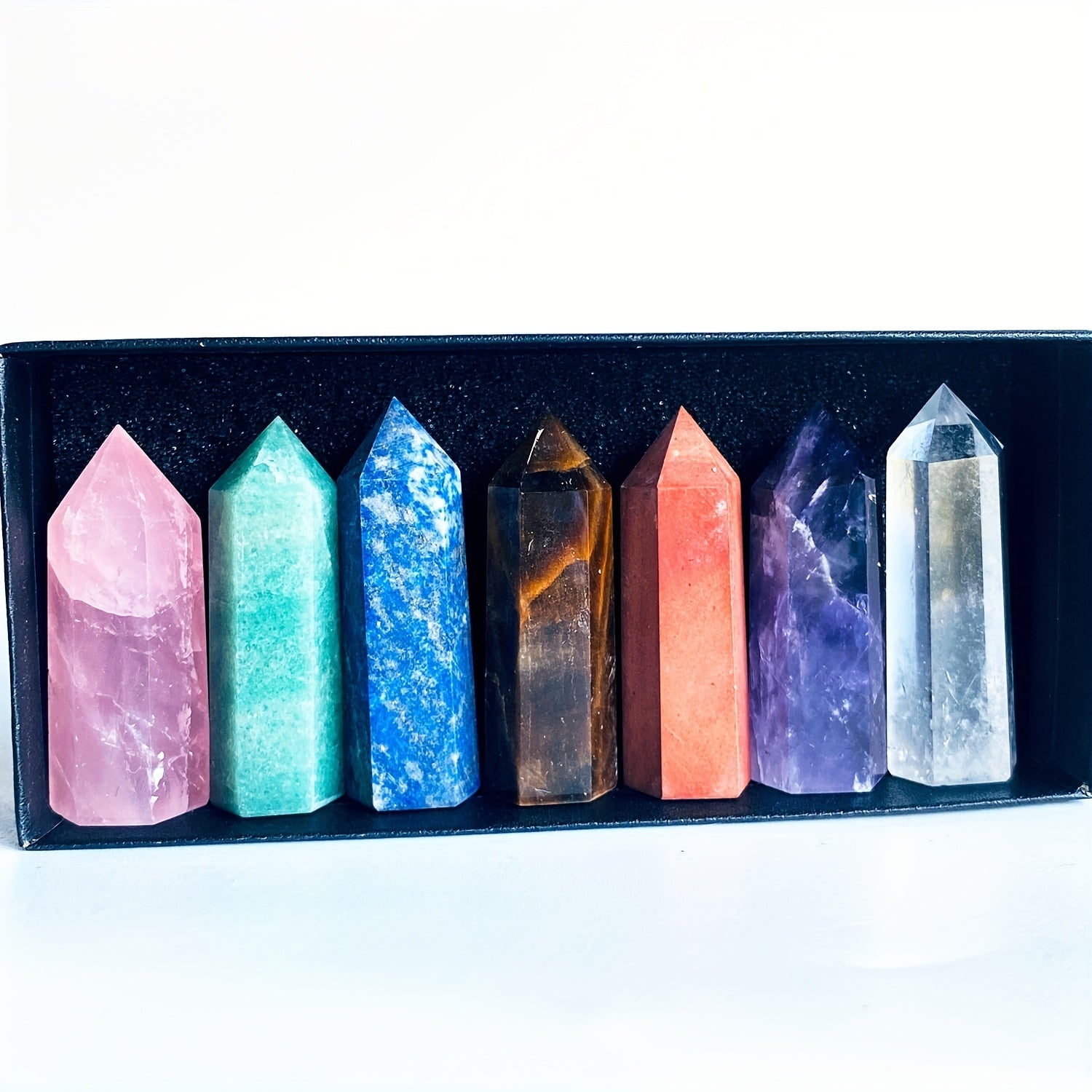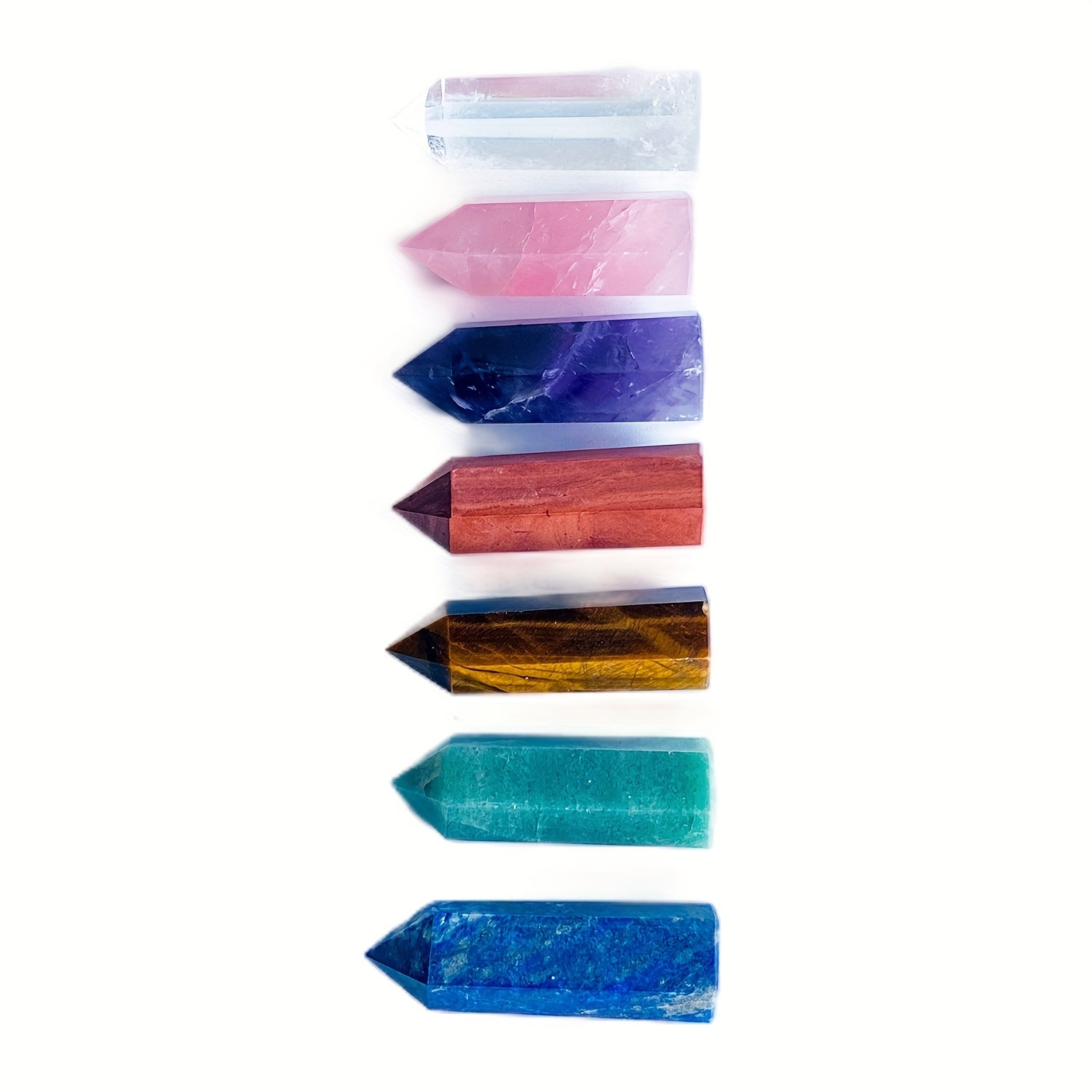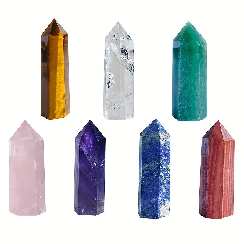 Enhance your space with this set of healing crystal pillars featuring 7 chakra stones. Perfect for meditation, reiki, and positive energy flow.