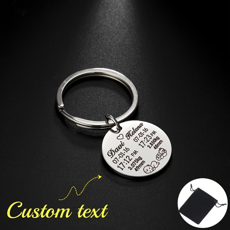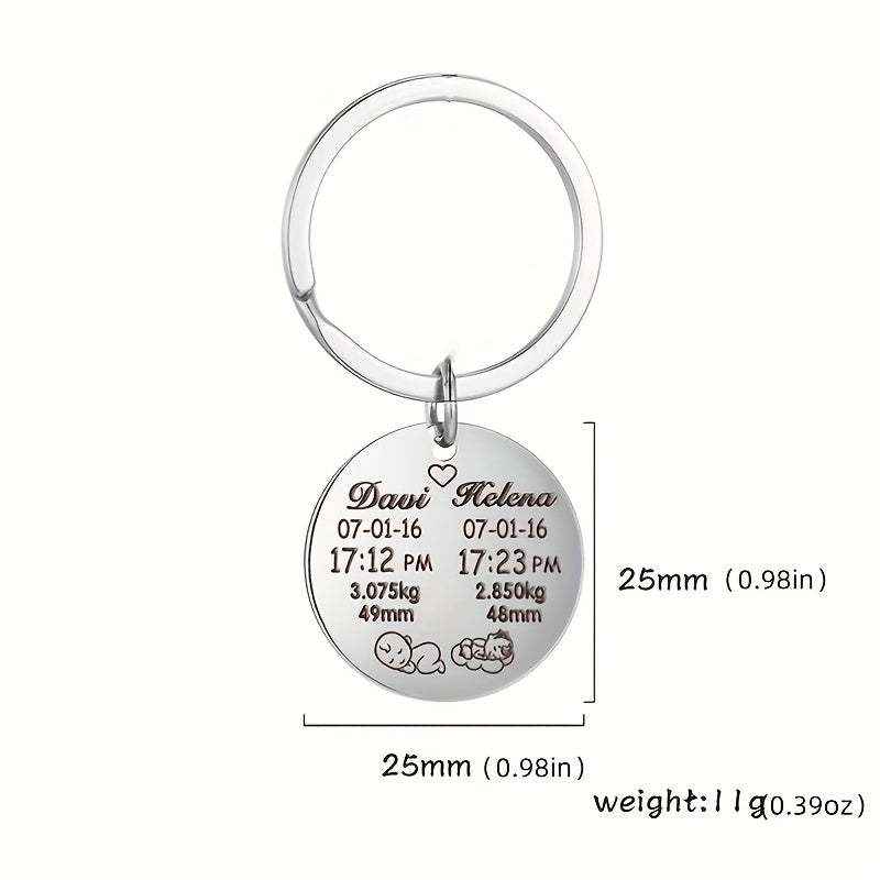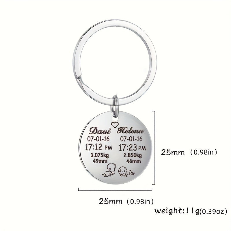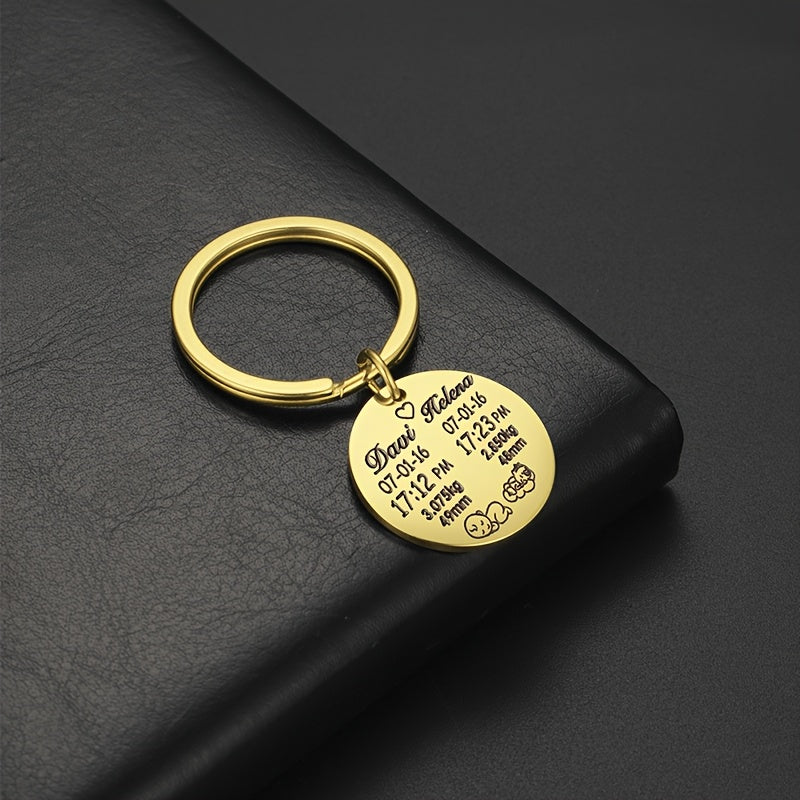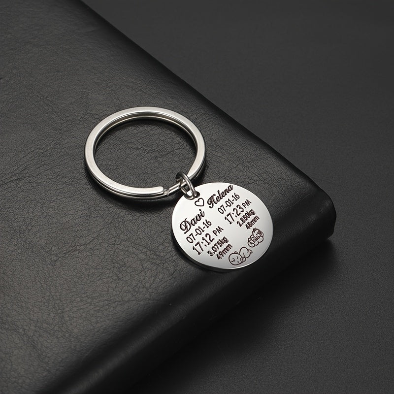 Customized keychain with engraved birth data for 2 people, made of durable stainless steel. A perfect gift for couples or loved ones.