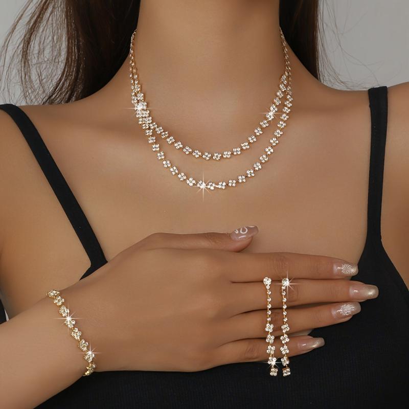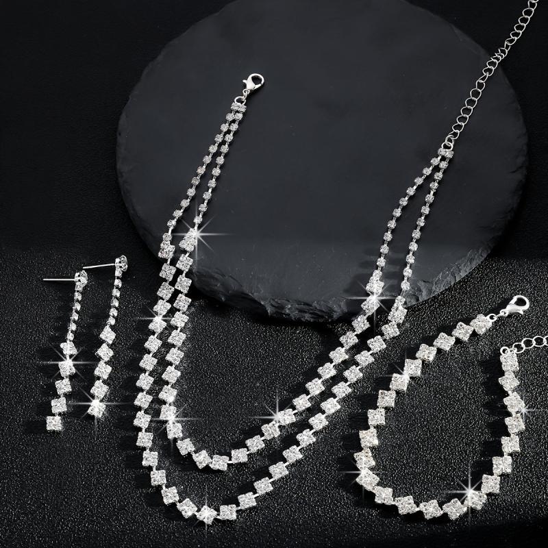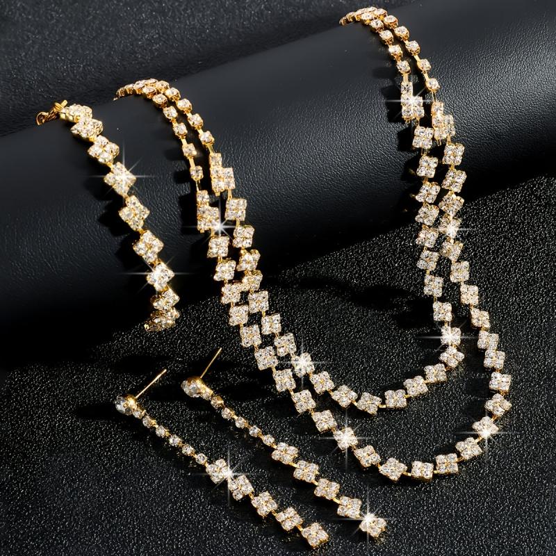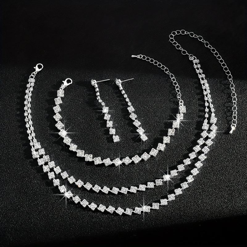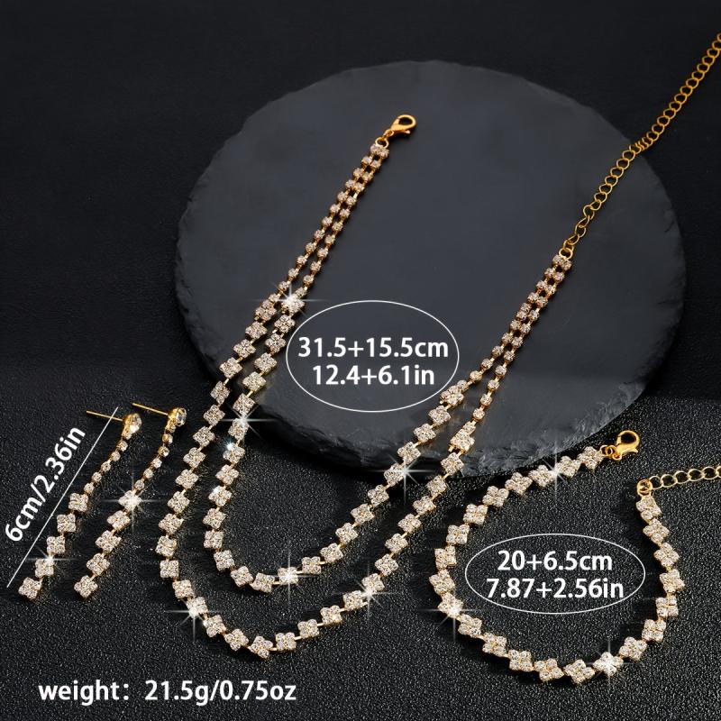 Glam up your party look with this sparkling rhinestone double layer geometric square necklace, bracelet, and earrings set.