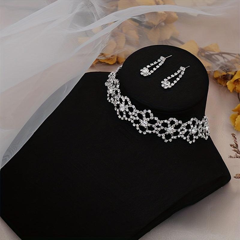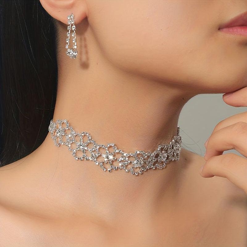 Elegant jewelry set featuring a hollow flower design adorned with sparkling rhinestones. Perfect for special occasions or adding glam to any outfit.