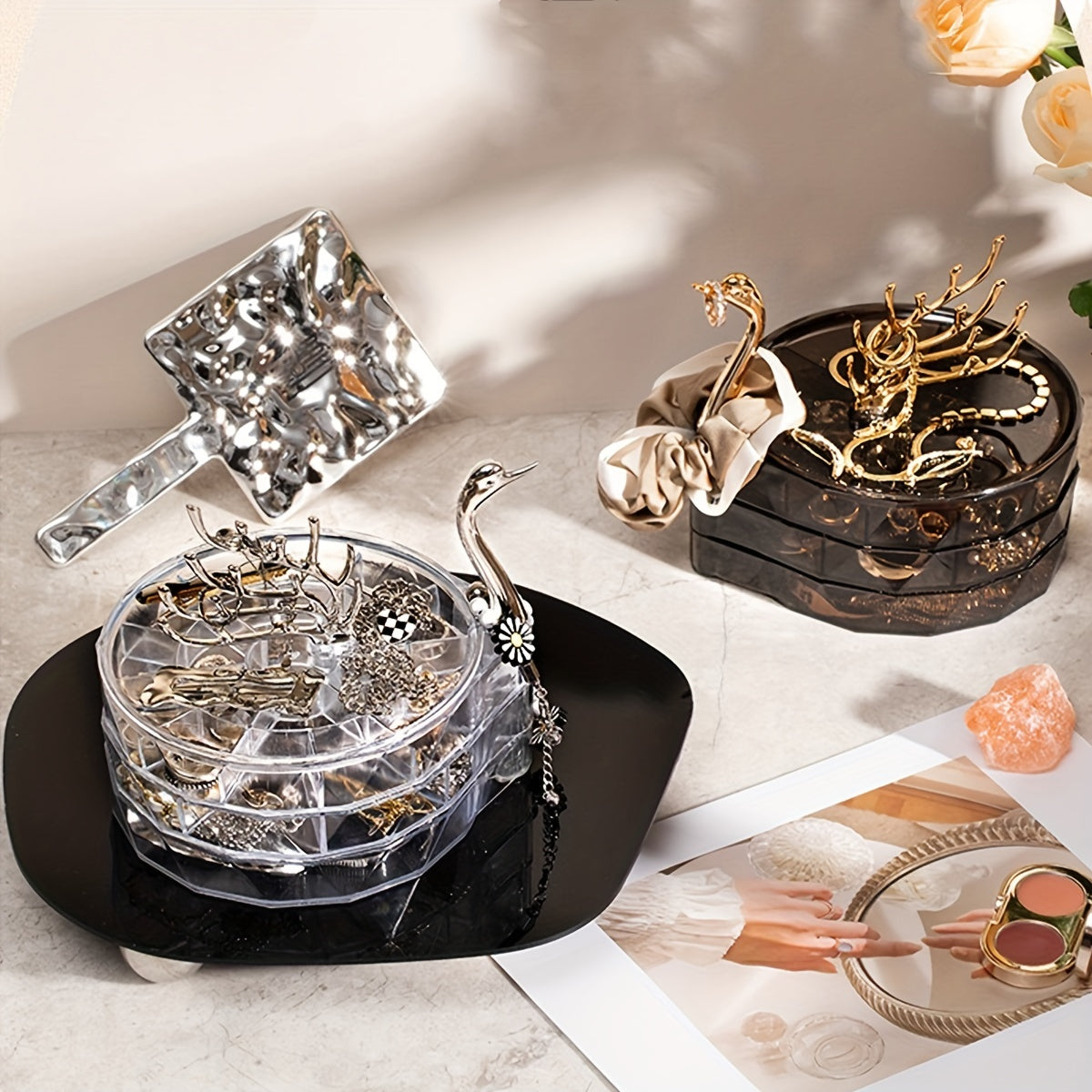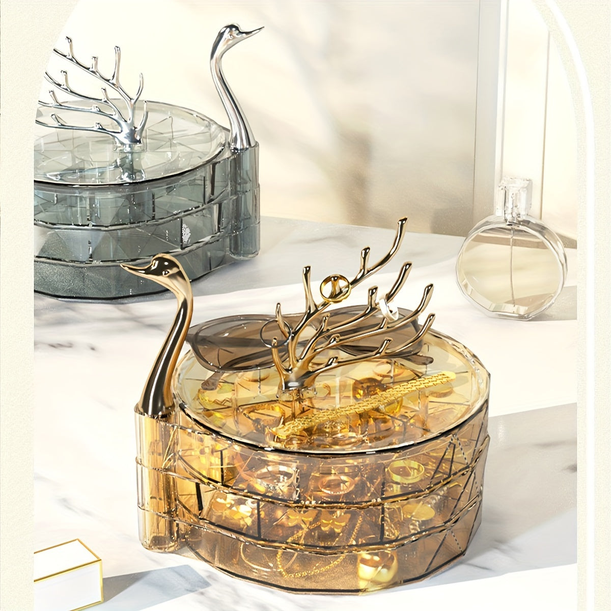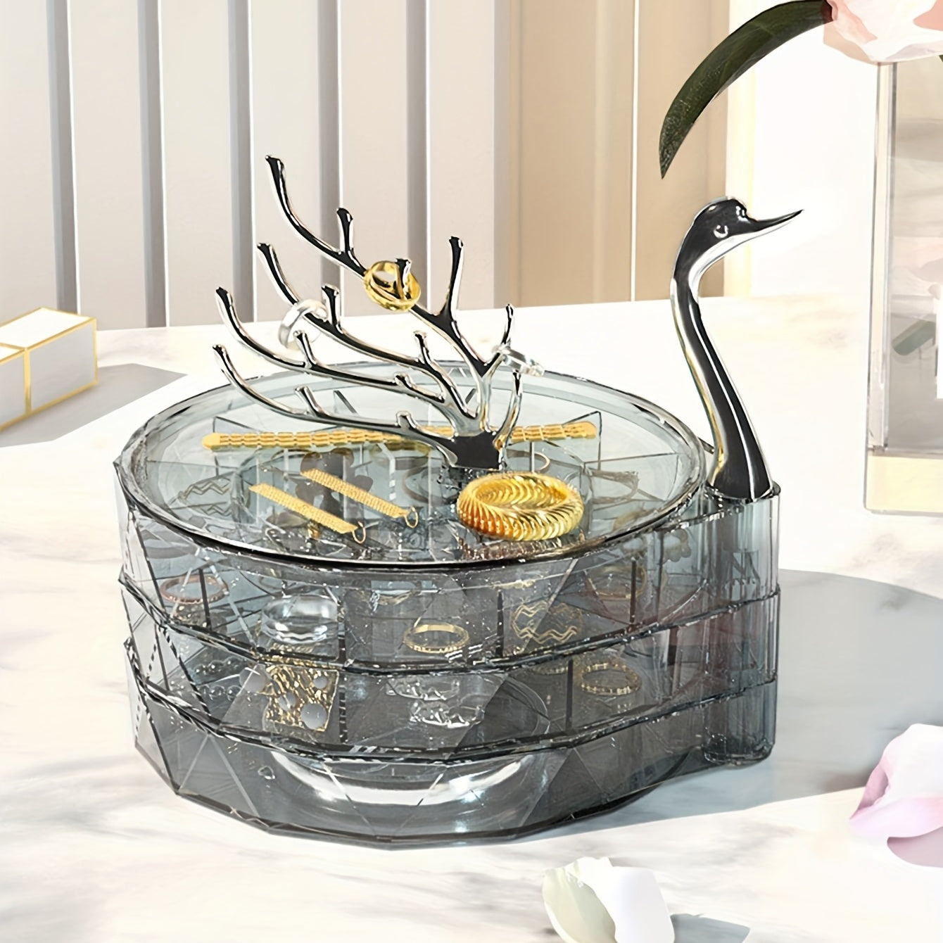 This jewelry box features multiple layers for storing earrings, rings, necklaces, and is dustproof.