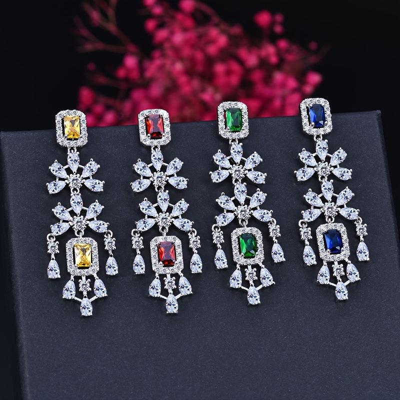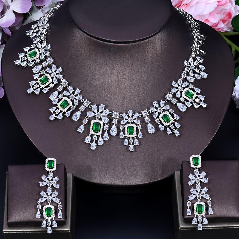 Complete your formal look with this stunning silver plated jewelry set featuring a long pendant necklace and dangle earrings adorned with green and cubic zirconia stones.