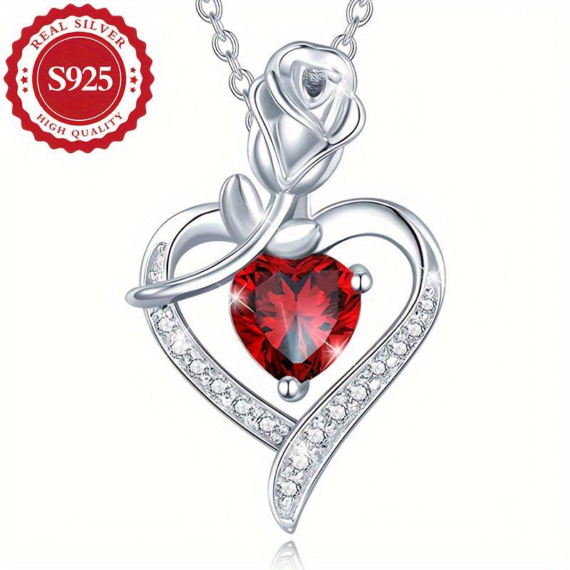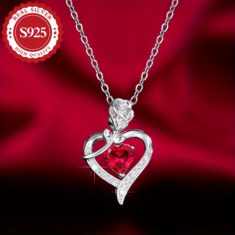 Elegant 925 sterling silver pendant featuring a rose flower design with a heart-shaped red synthetic zirconia. Perfect for daily wear and special occasions.