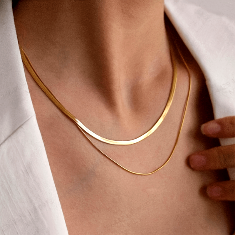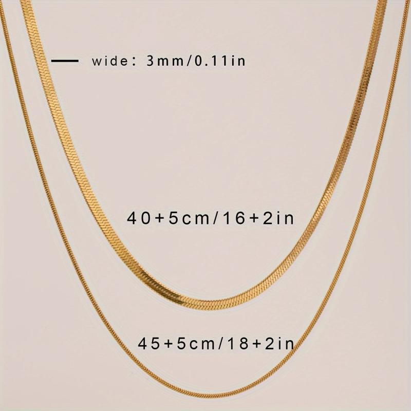Elevate your casual attire with this versatile double layered flat snake chain necklace. Made of stainless steel with a golden tone, it's perfect for everyday wear or as a thoughtful gift.