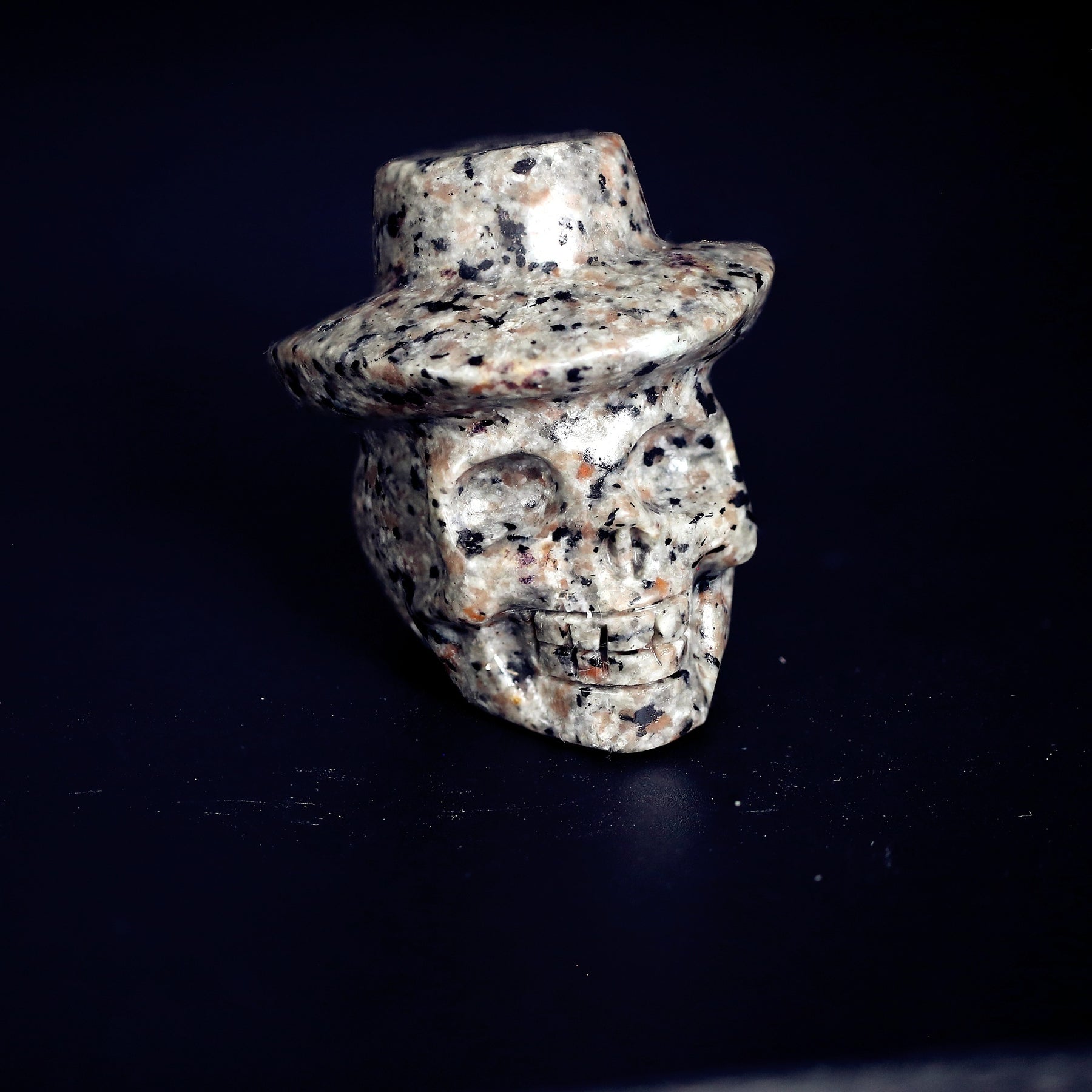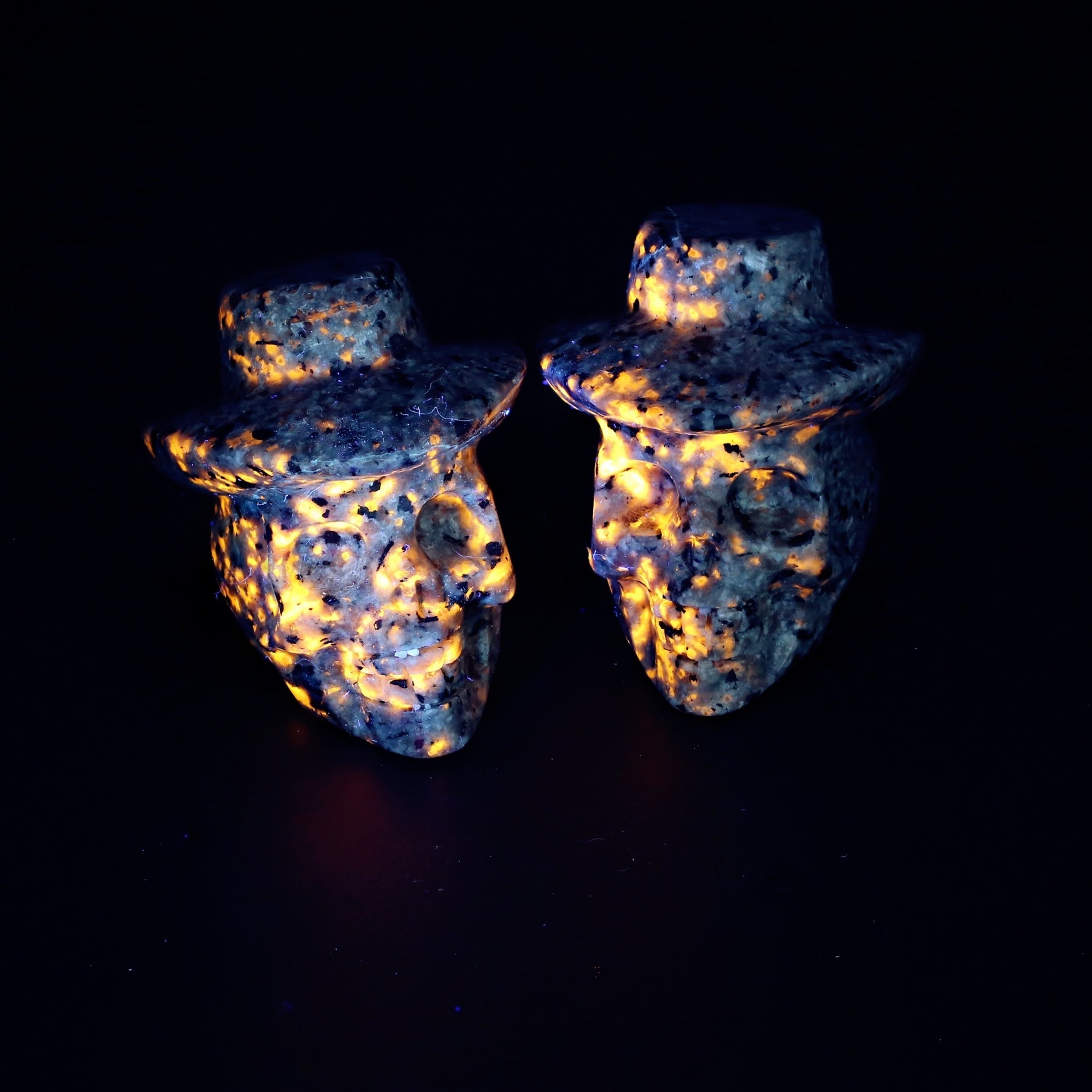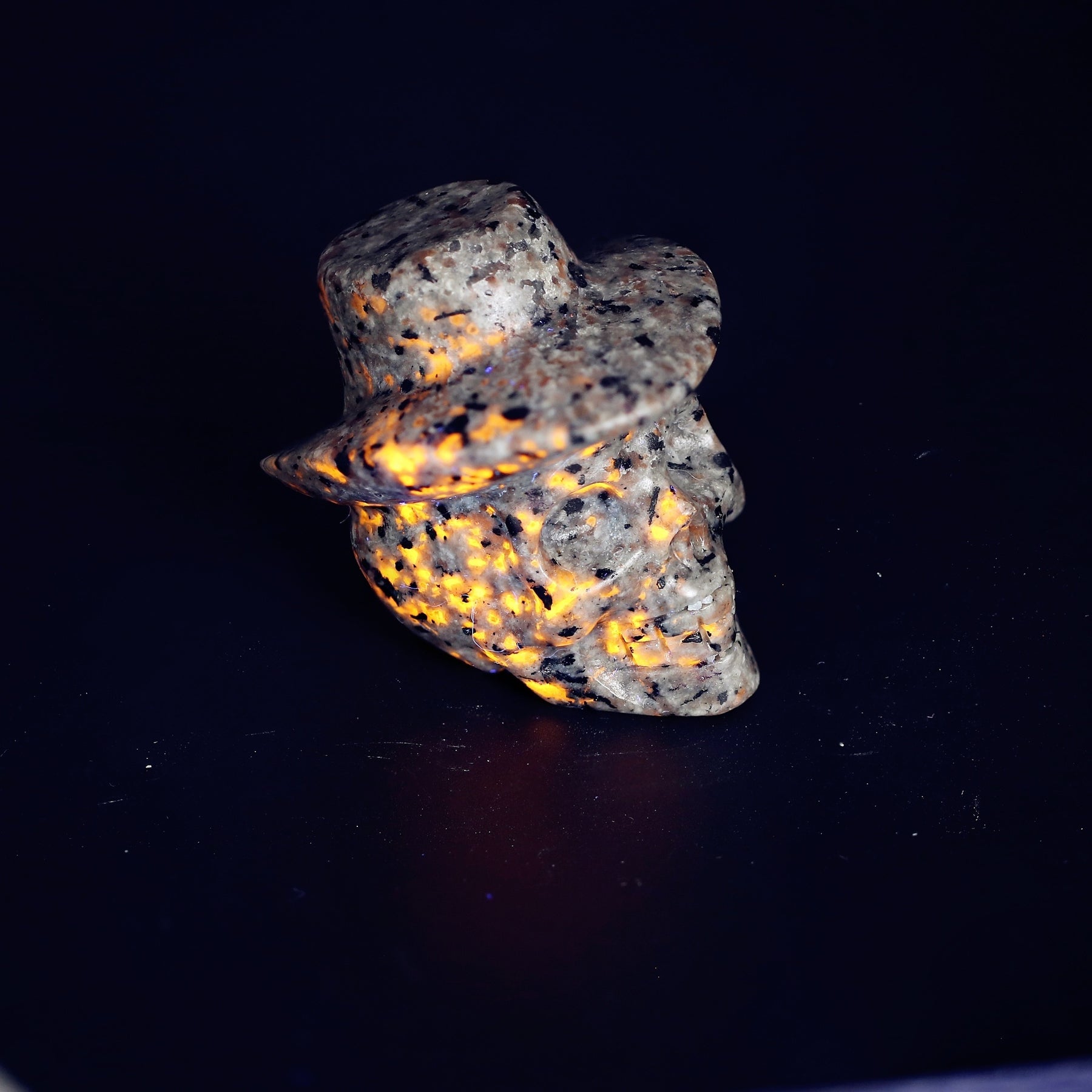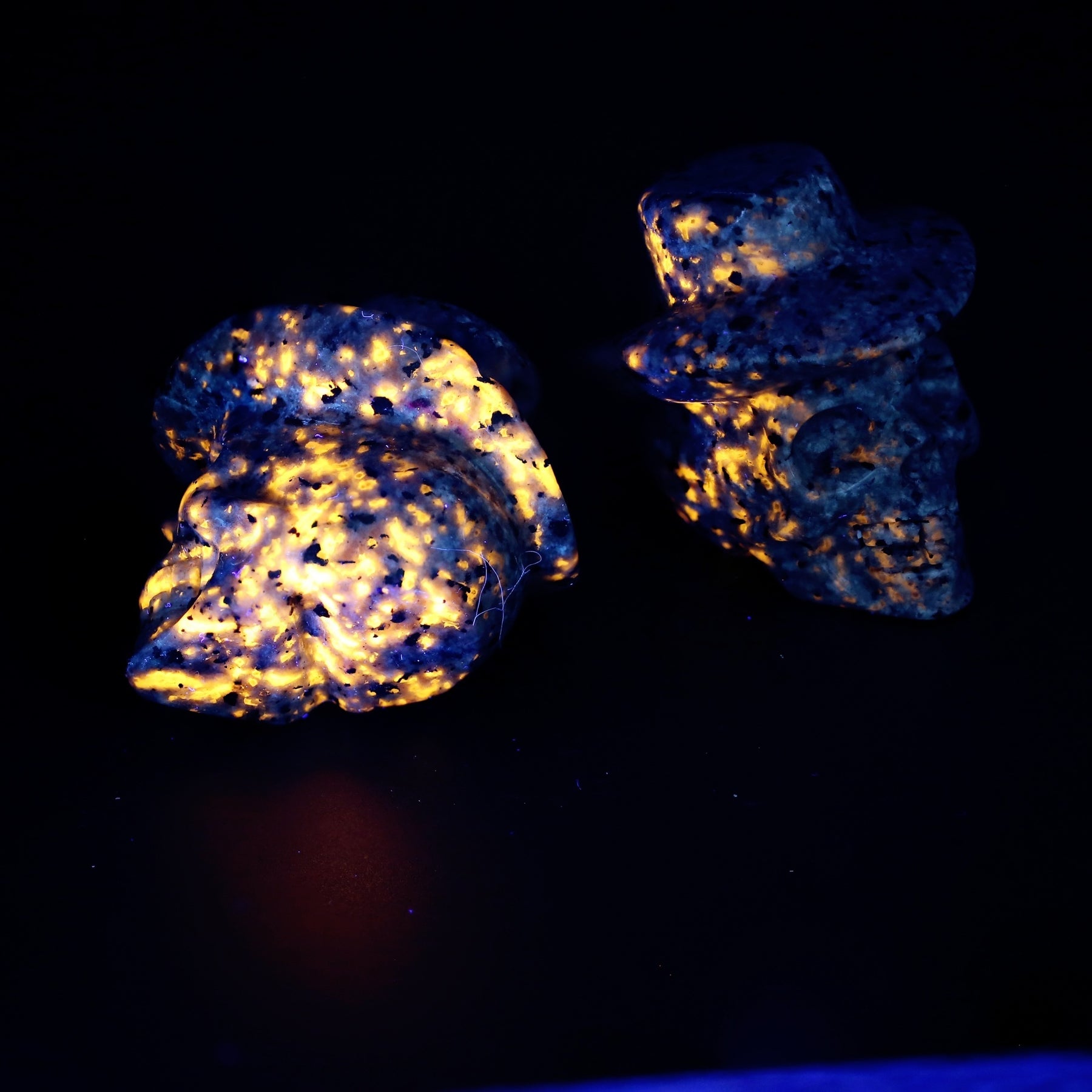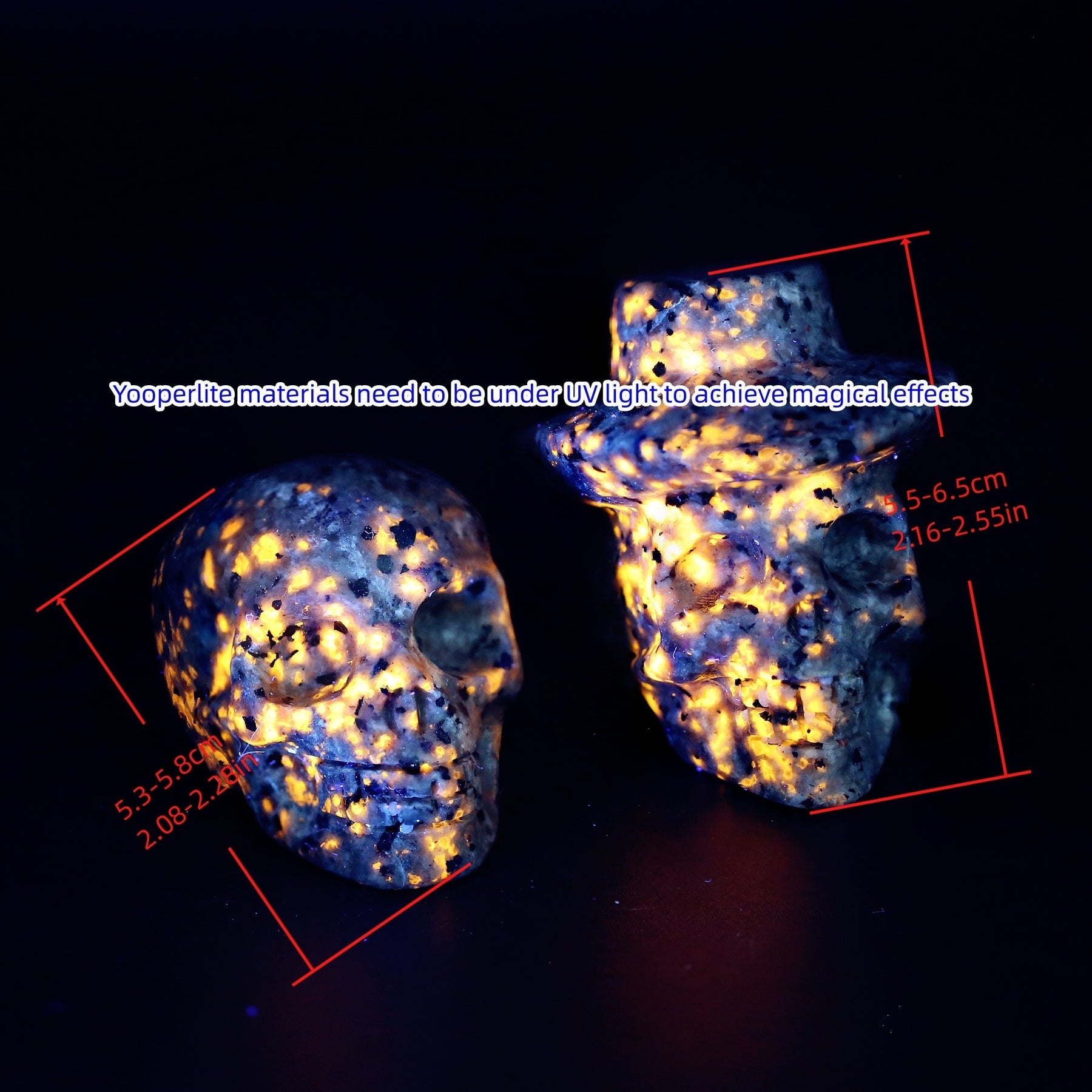 Enhance your crystal collection with this unique UV magic stone skull ornament. The Yooperlite skull features a mesmerizing flame effect that adds a touch of magic to any space.