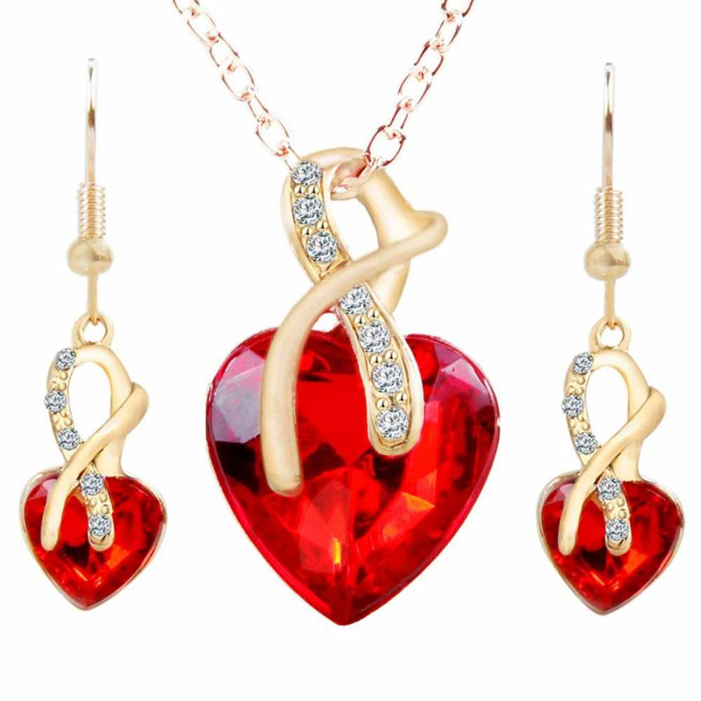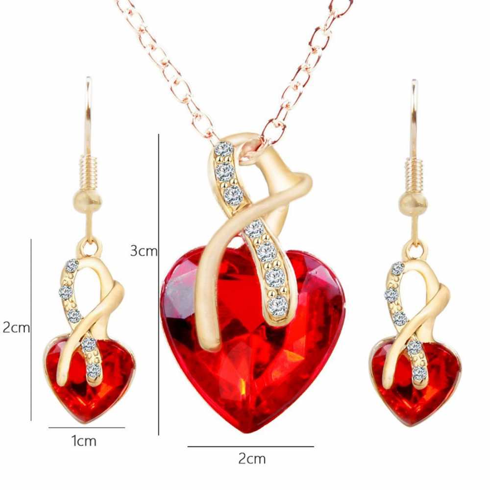 Women's Heart Shaped Crystal Pendant With Chain And Earring In Red