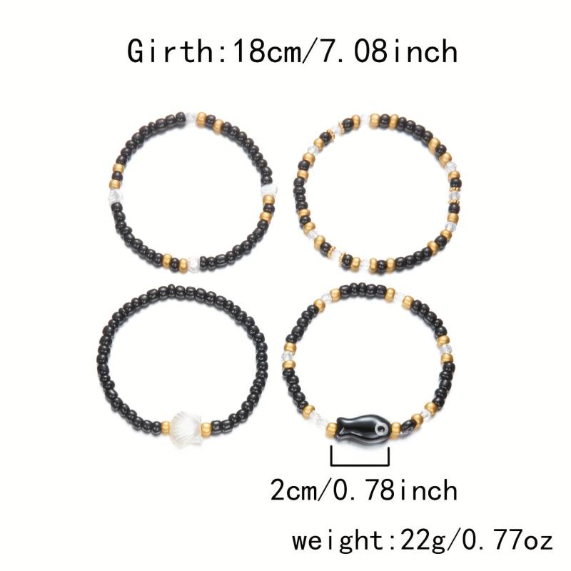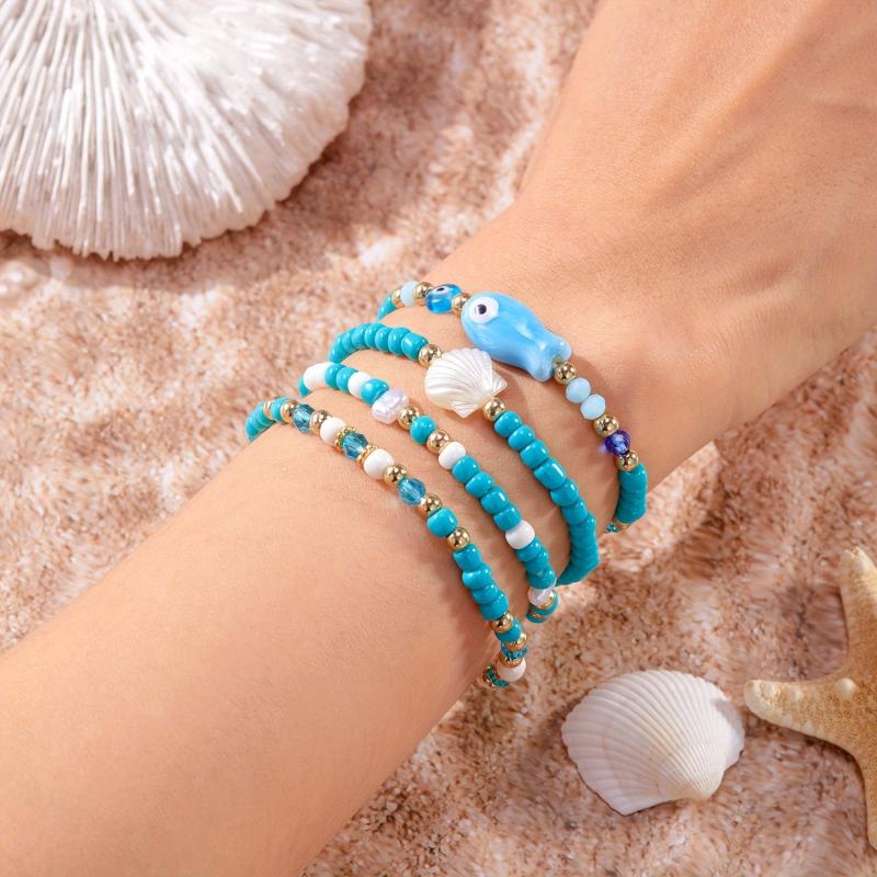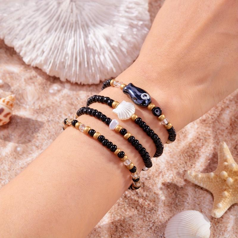 Capture the essence of European bohemian vacation style with this starfish rice bead bracelet set featuring an evil eye. Perfect for beach days and casual outings.