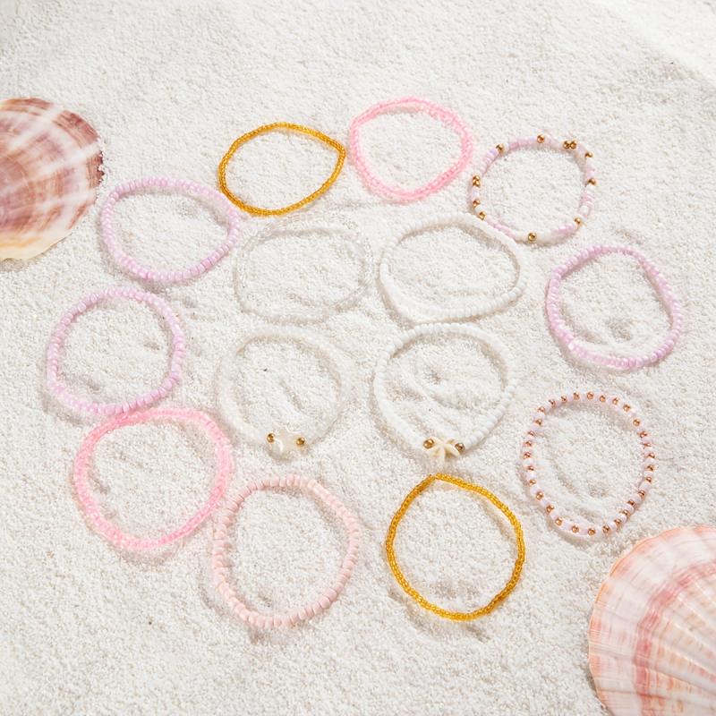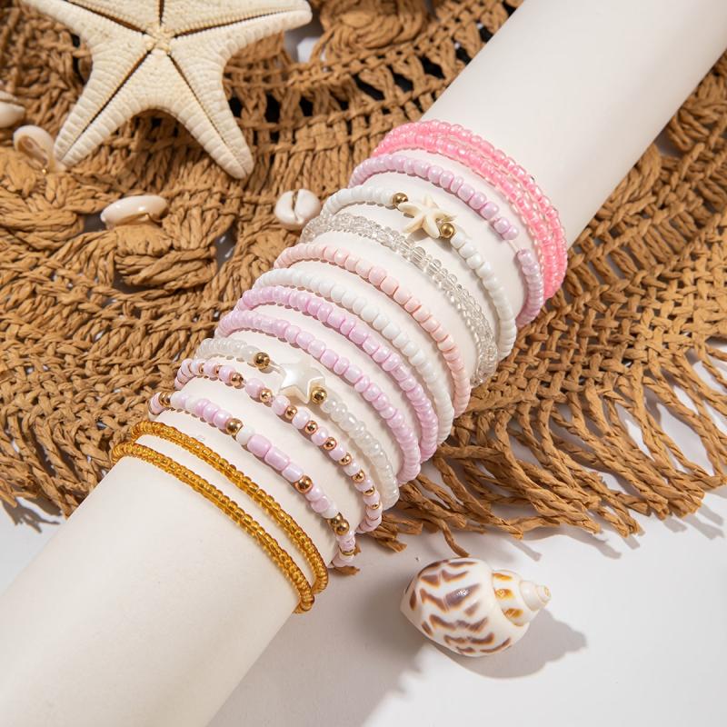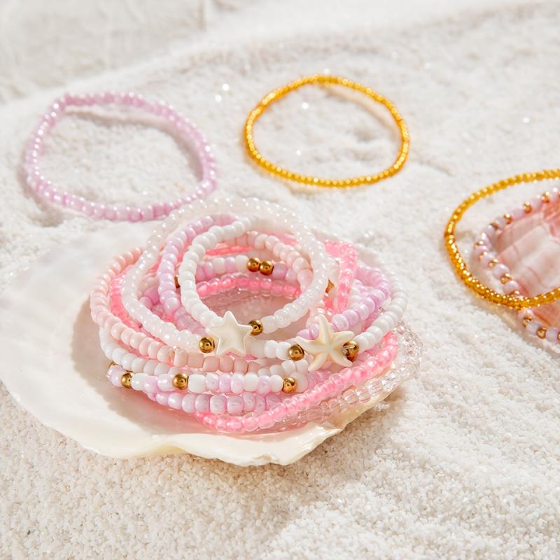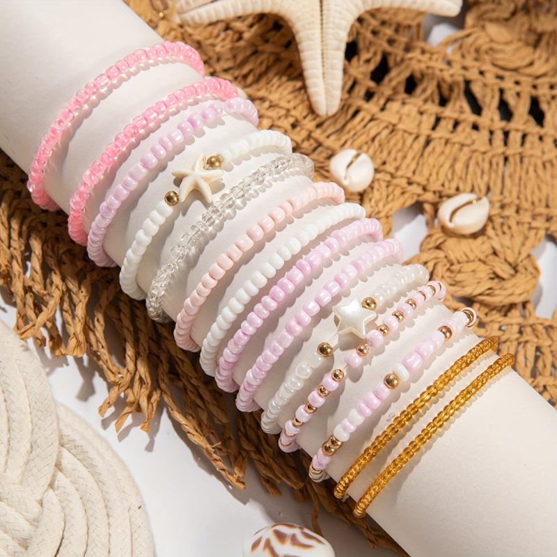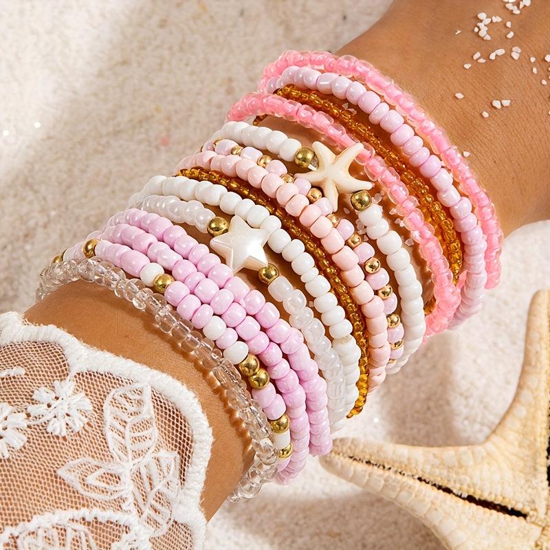 These 14 boho pink beaded bracelets feature starfish and pentagram charms, perfect for parties, proms, and more.