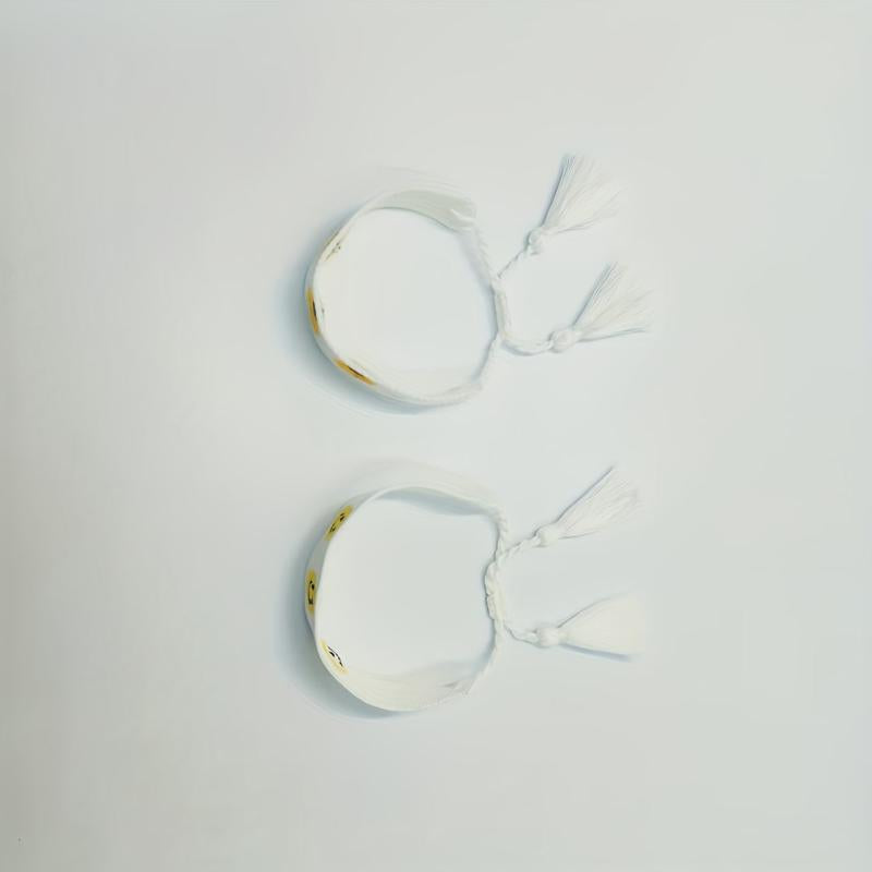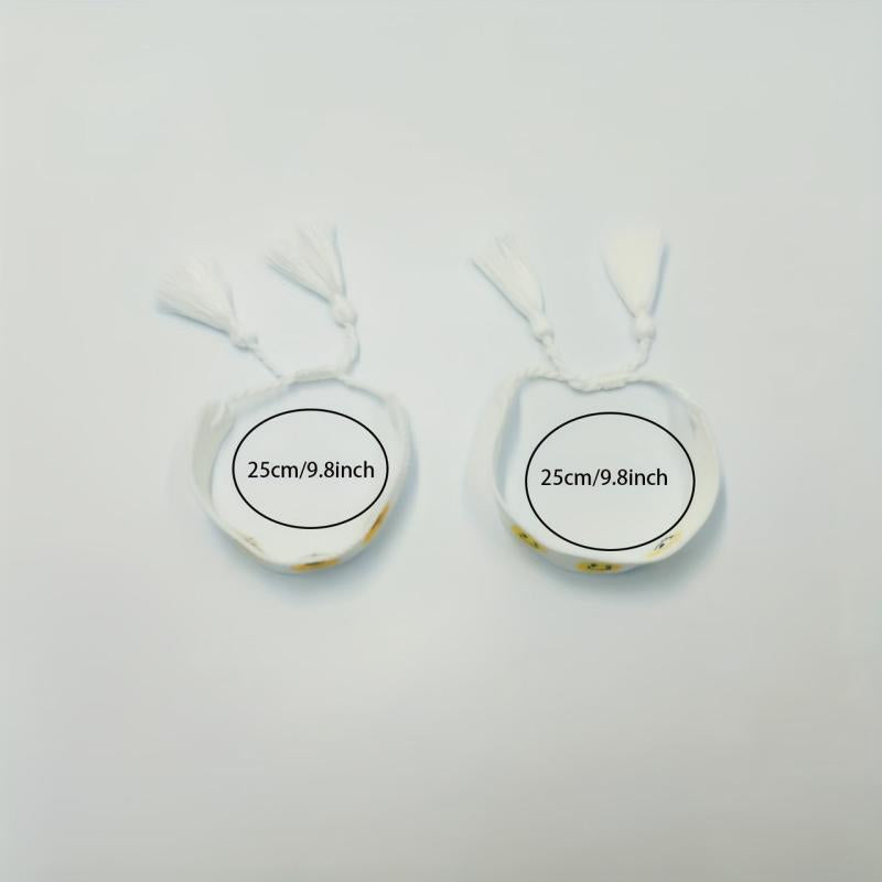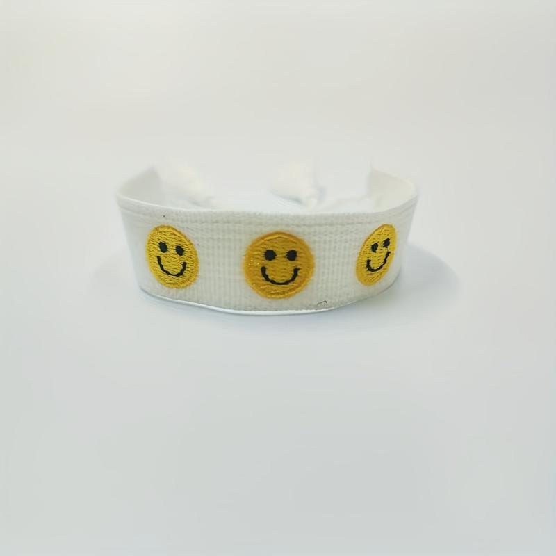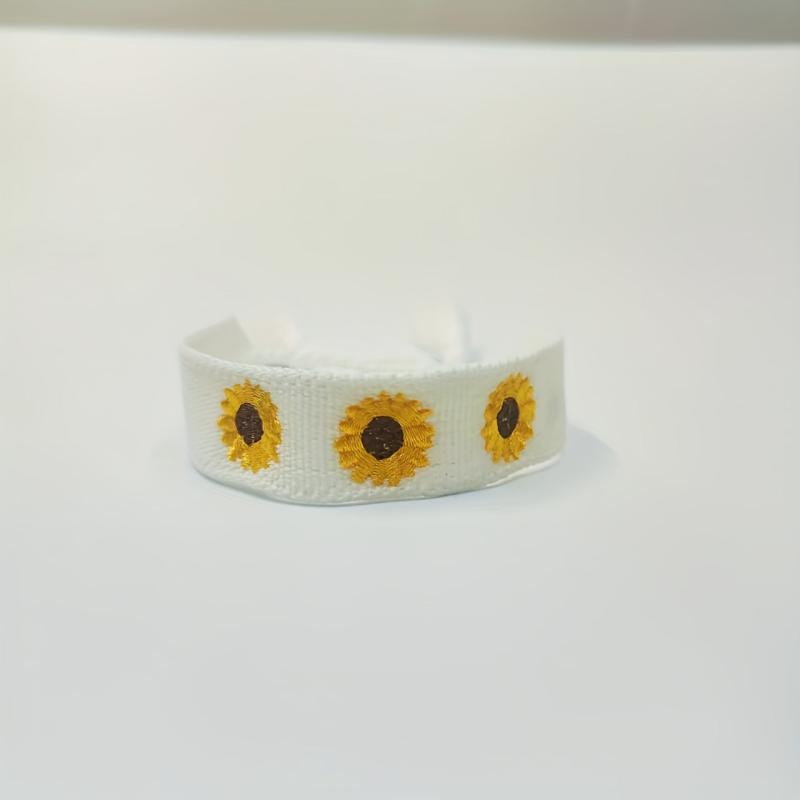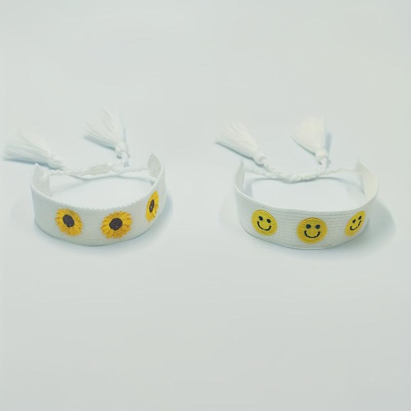 Brighten up your day with this charming set of two woven bracelets featuring embroidered sunflower smiling faces and sunshine motifs.