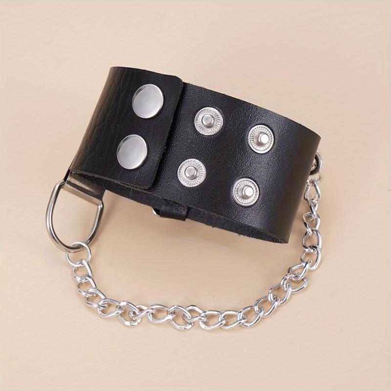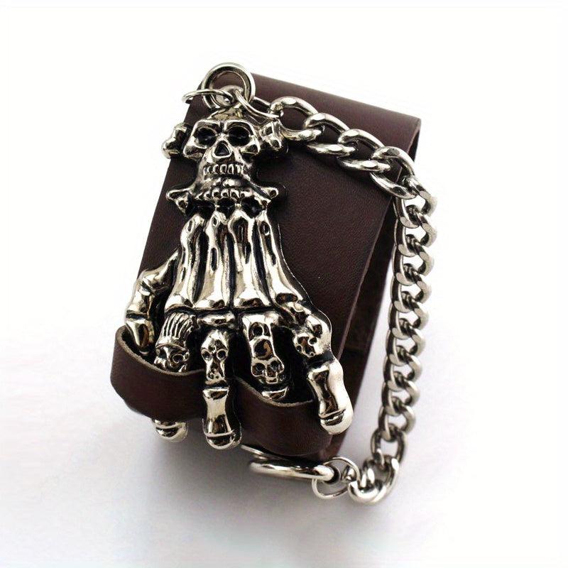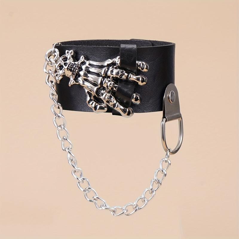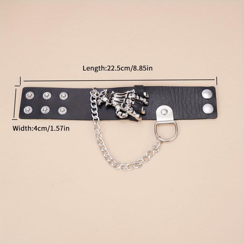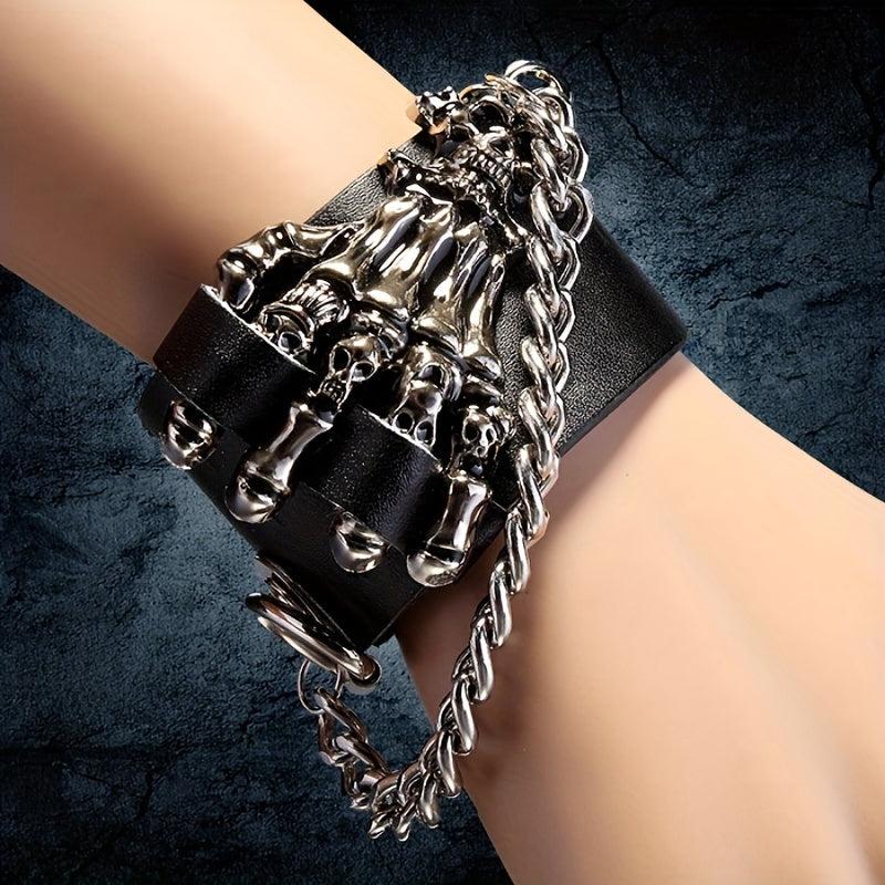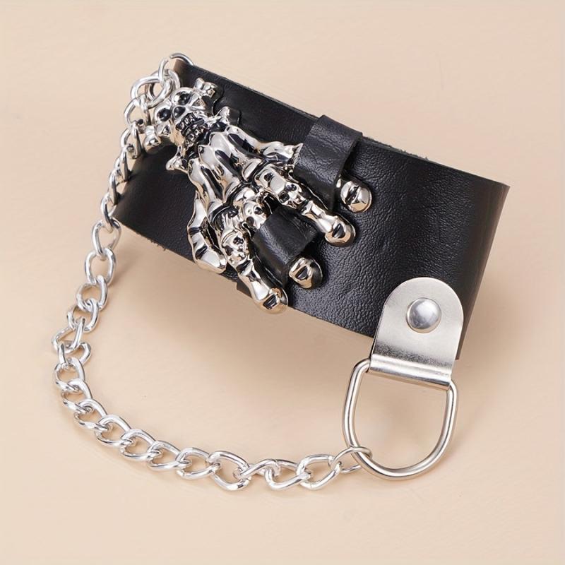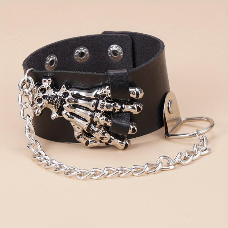 Embrace edgy style with this punk wristband featuring skull motifs and metal chain. Perfect for women who love dark accessories and skull jewelry.