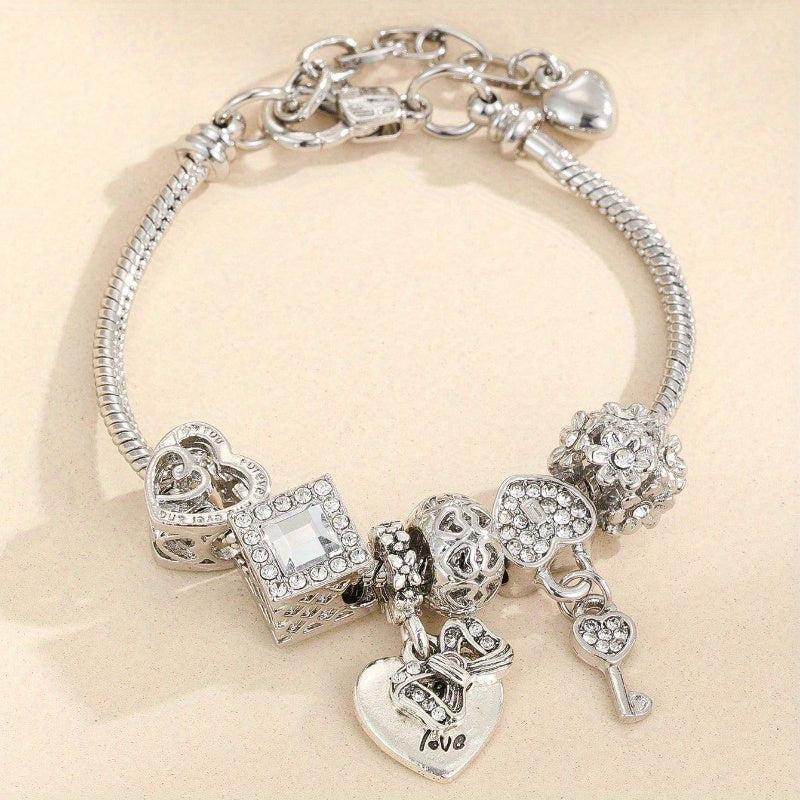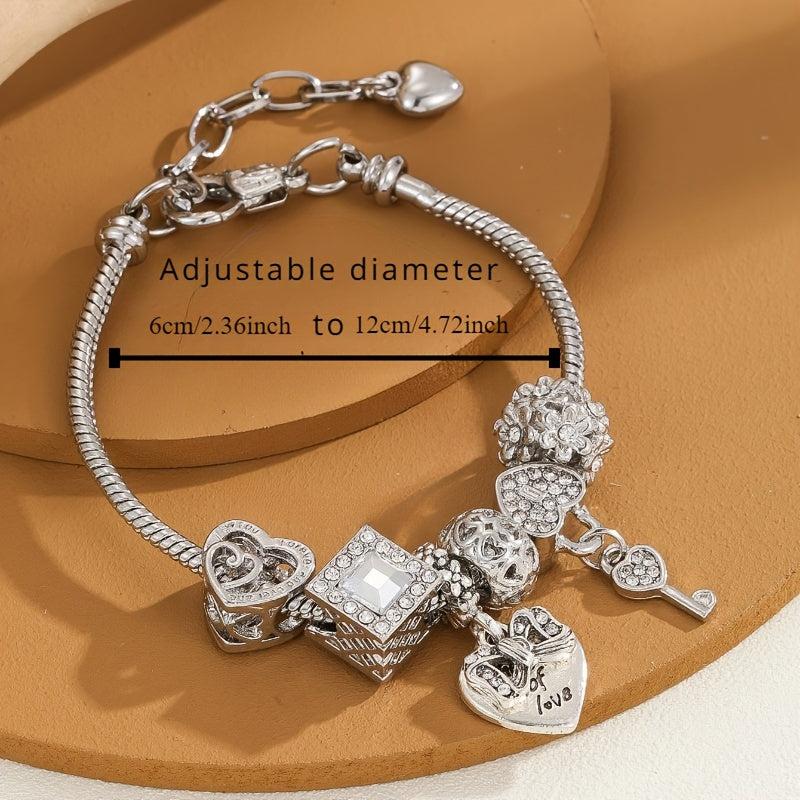 Heart & Key Charm Bracelet Crystal Beaded DIY Jewelry for Women