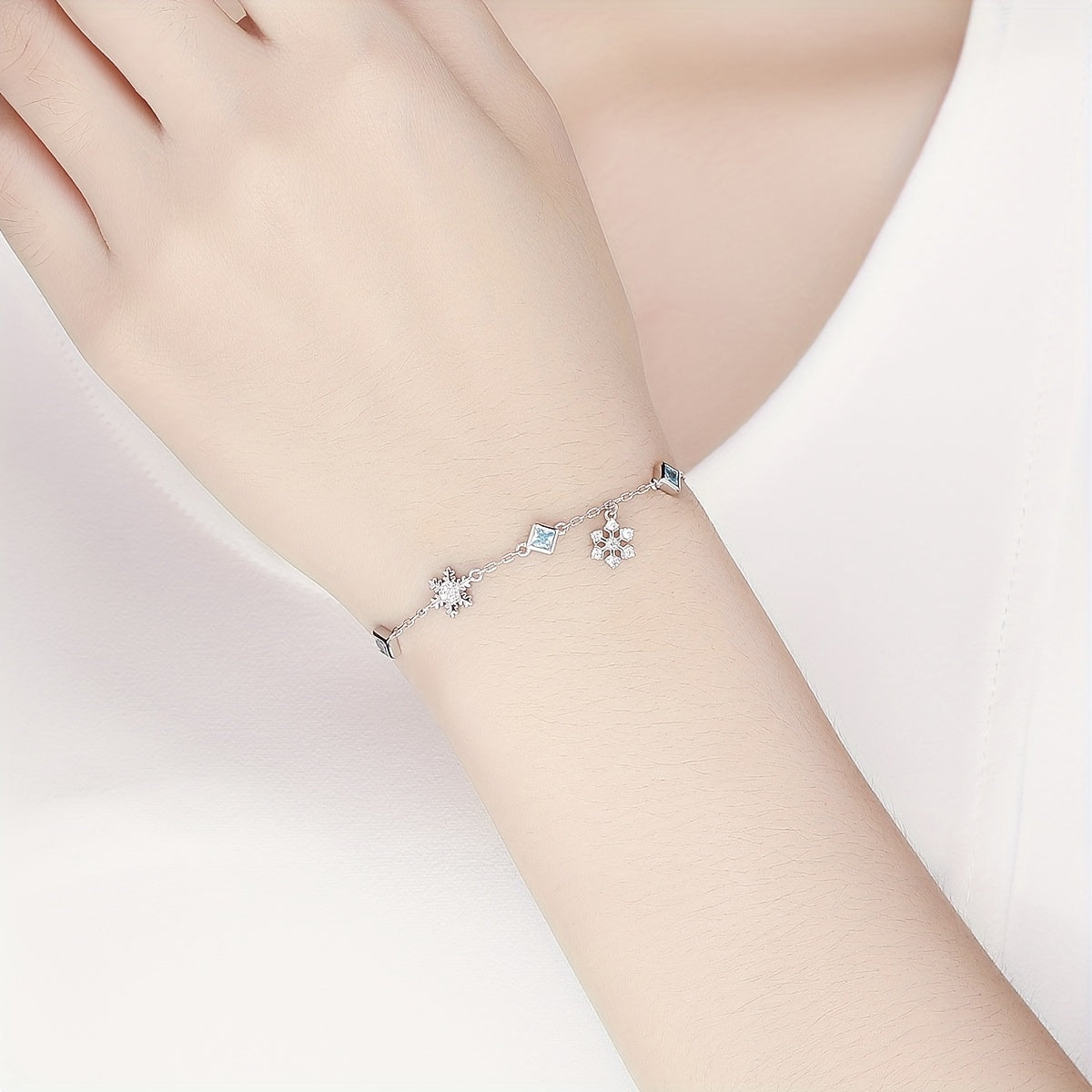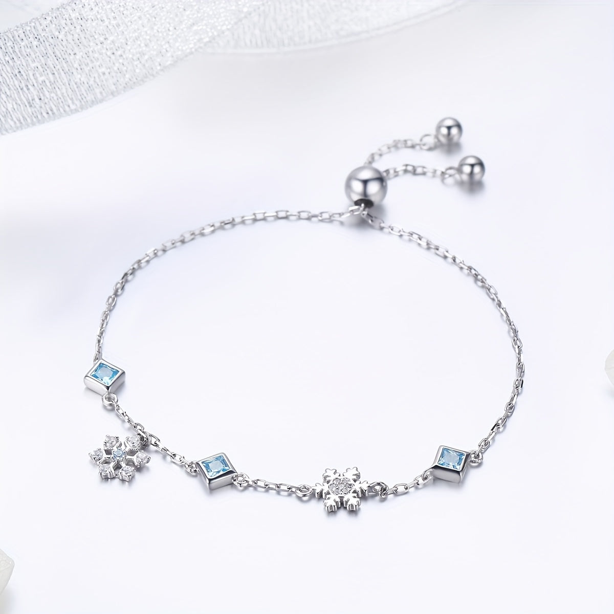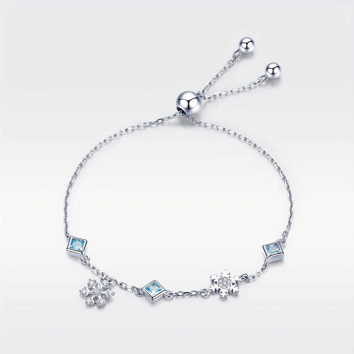 Add a touch of winter magic with this elegant bracelet featuring platinum plated snowflakes adorned with sparkling zirconia crystals.