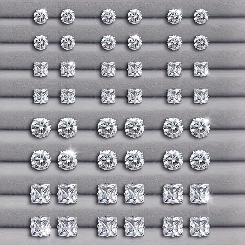 Add a touch of sparkle to your look with this set of 24 pairs of round and square stud earrings. Made of stainless steel, these earrings are durable and stylish for any occasion.