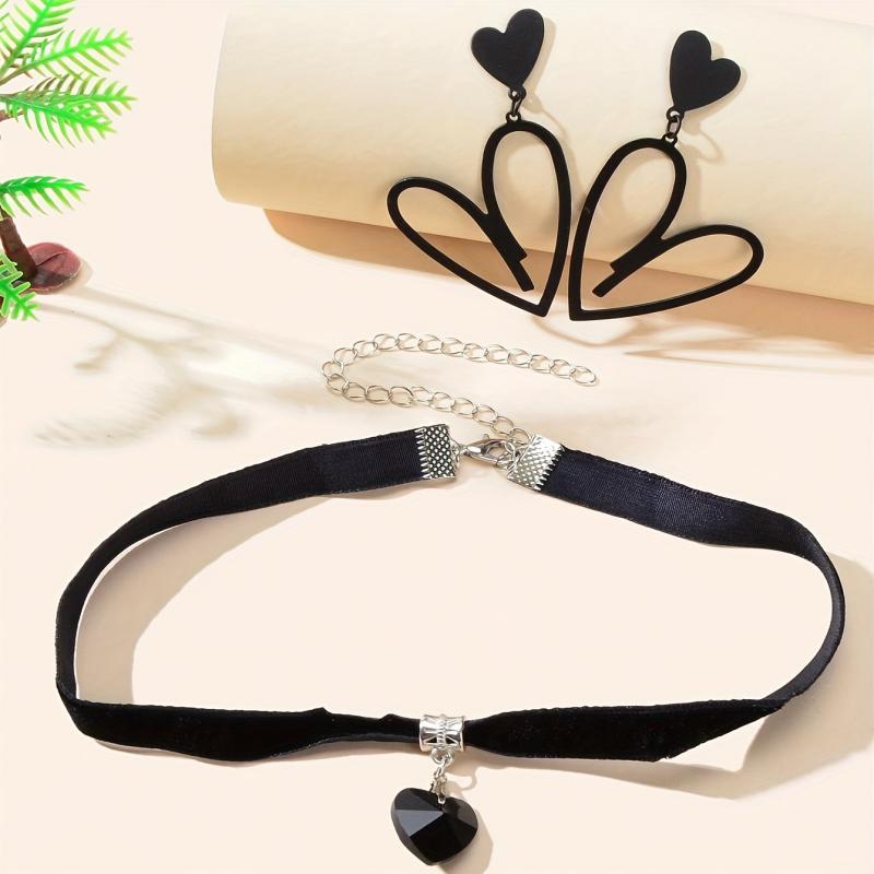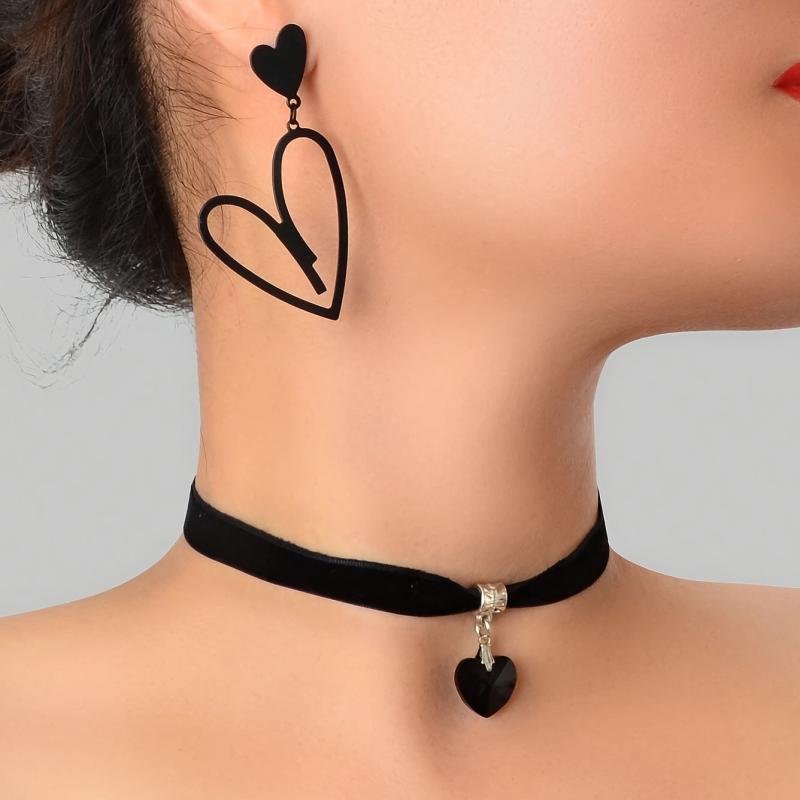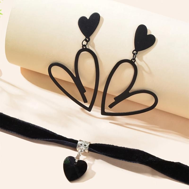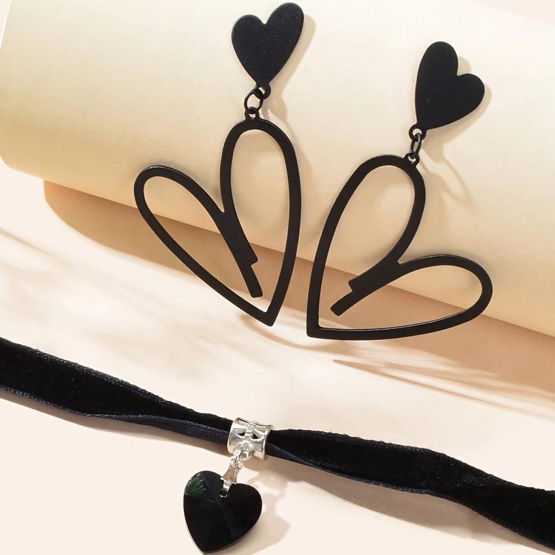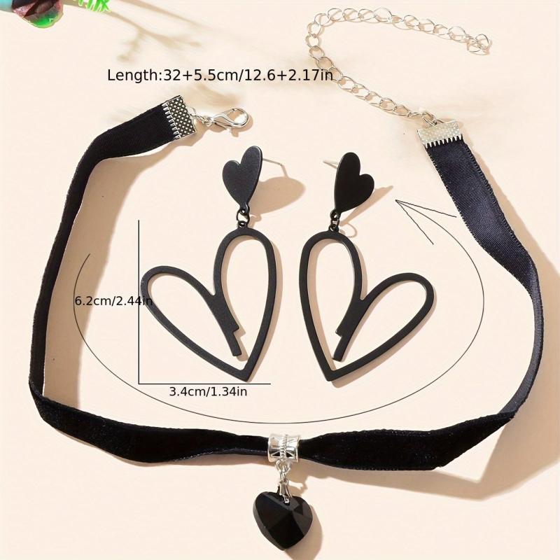 3pcs Heart Pendant Jewelry Set with Earrings, Choker Necklace - Gun Plated Iron