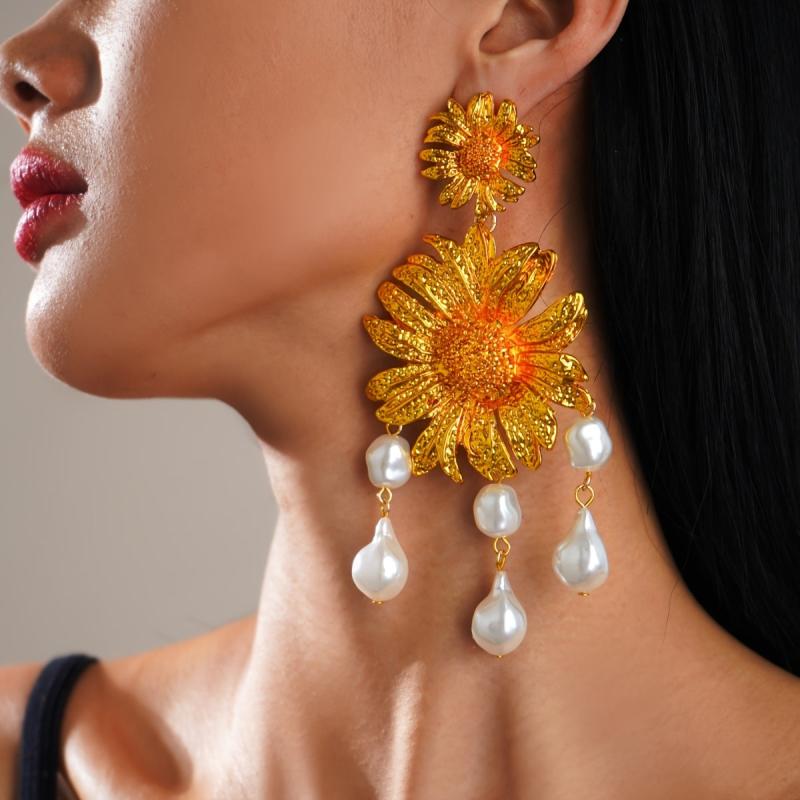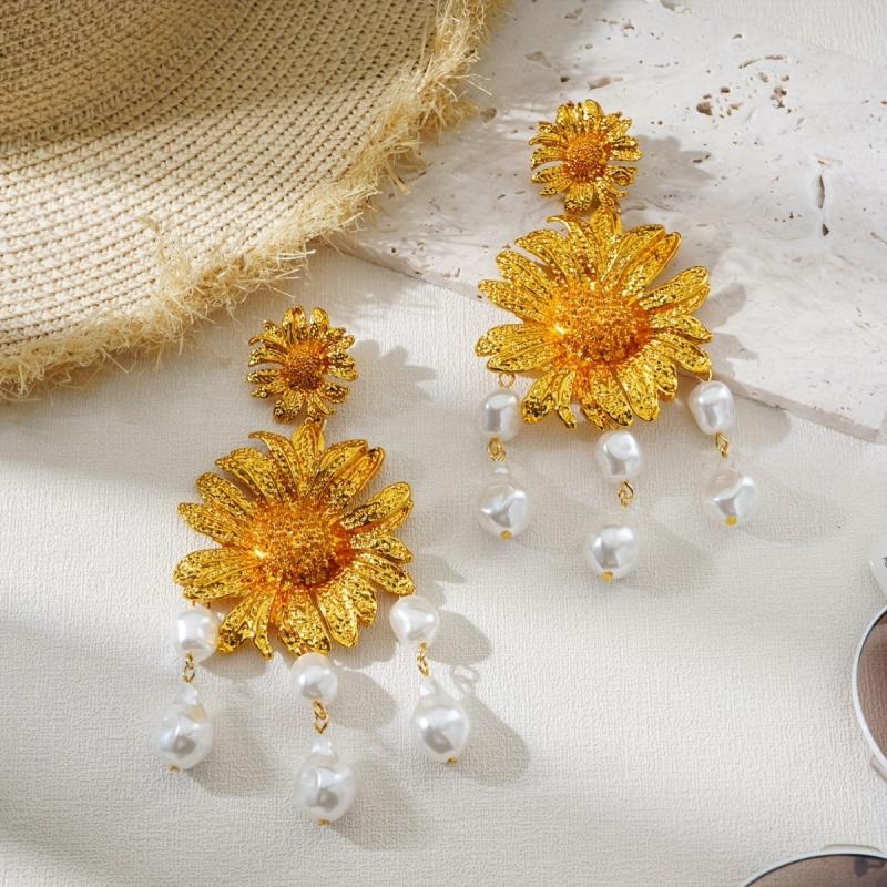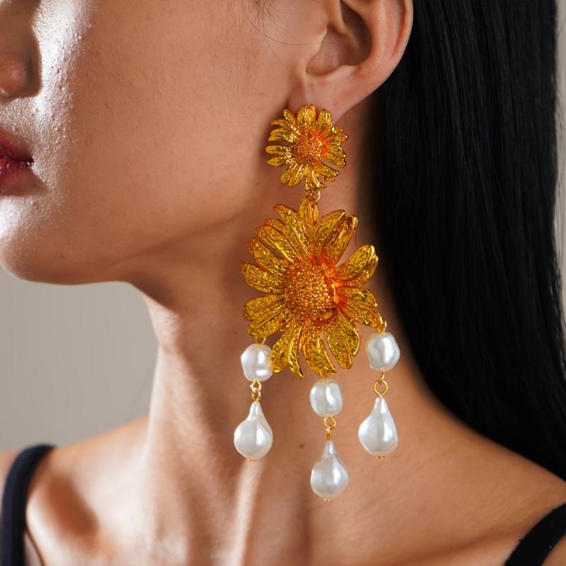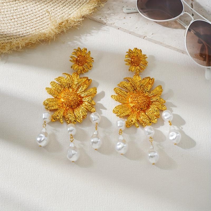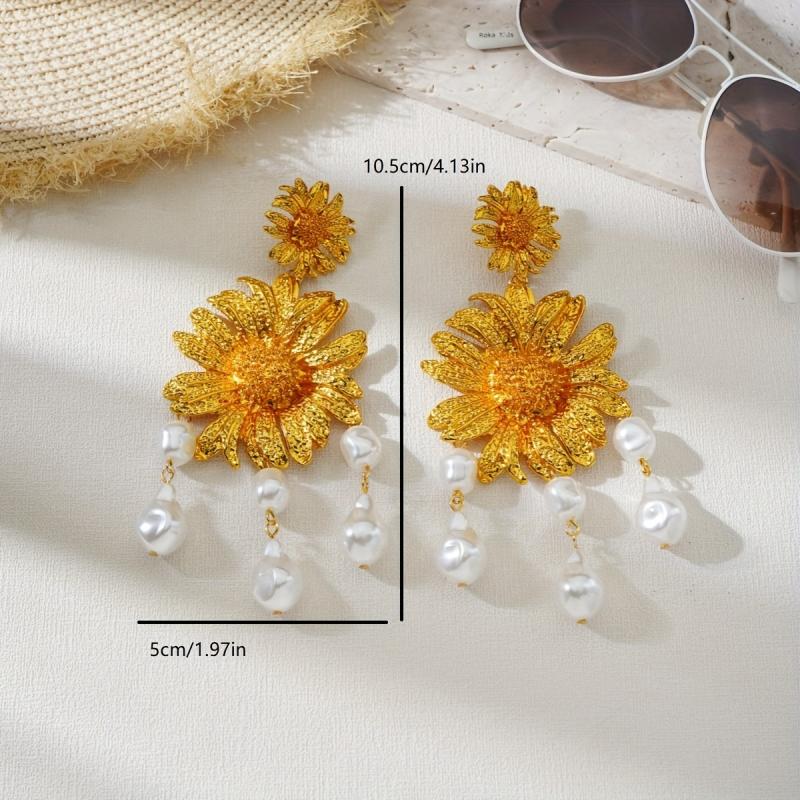 These bohemian sunflower dangle earrings are made of layered metal alloy with a floral baroque design in a golden tone. They are perfect for adding a touch of Boho chic to your outfit.